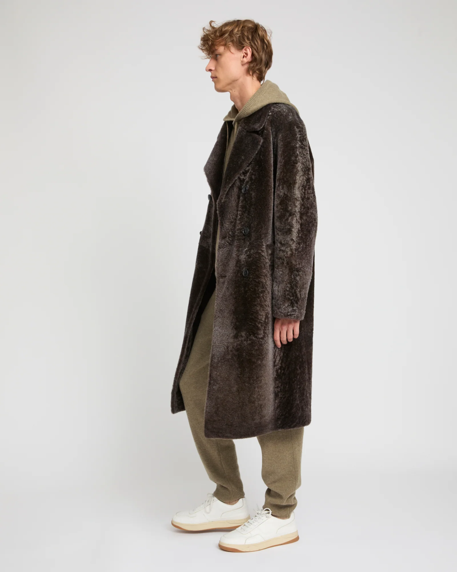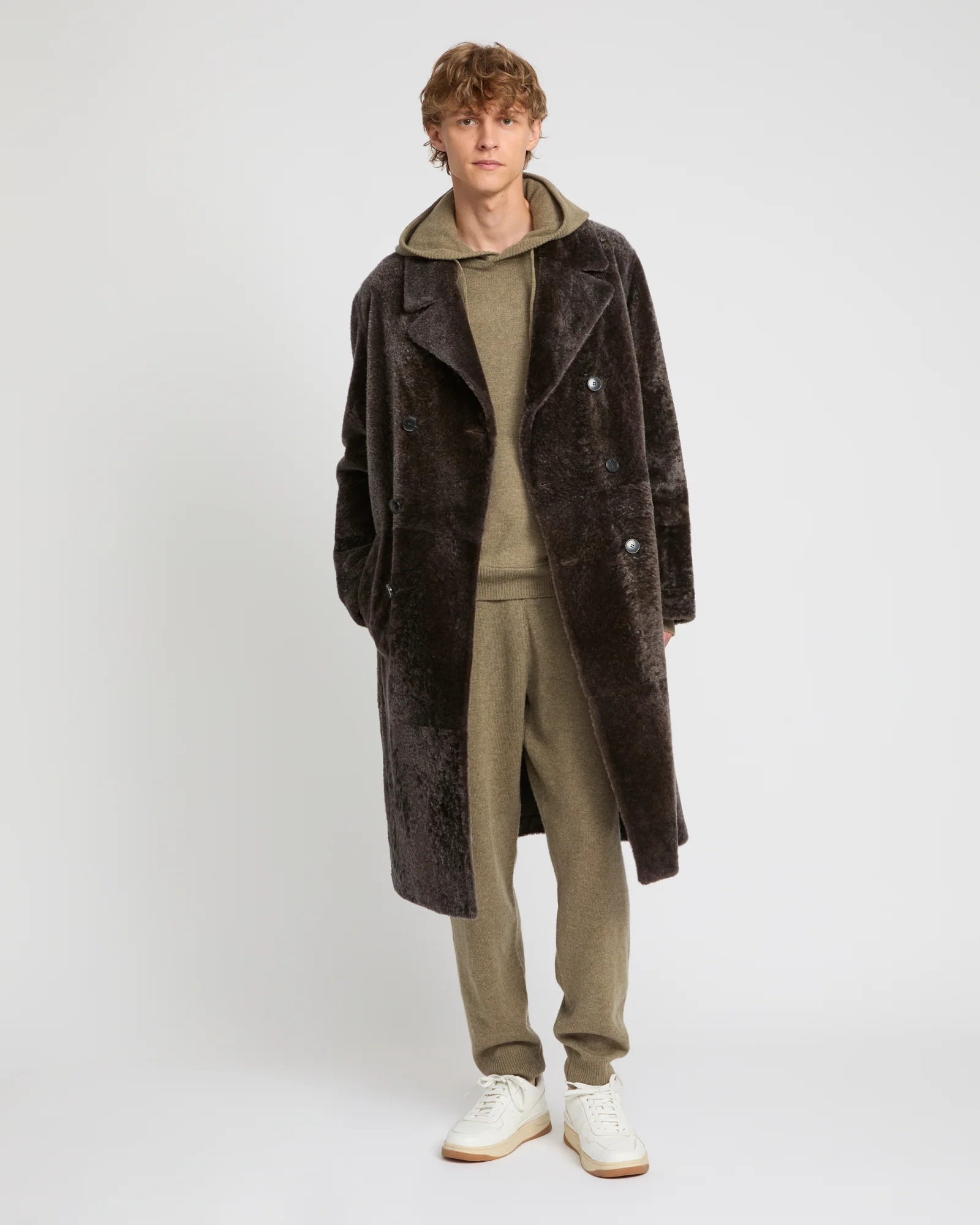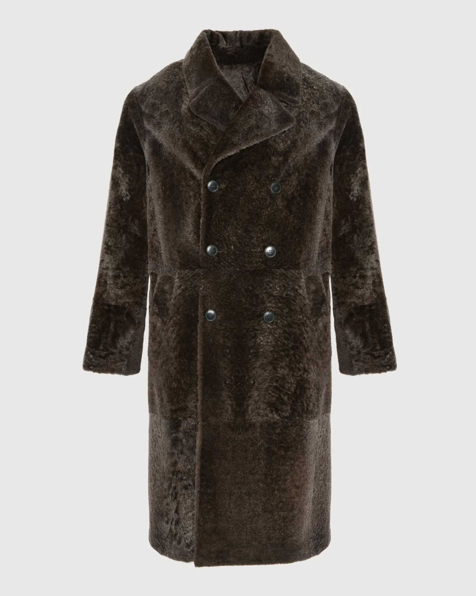 The shiny appearance of astrakhan-effect shearling provides an additional elegance to this double-breasted coat, with a 7/8 length. – Yves Salomon Men Collection– Length 110 cm– Ultra-soft and lightweight Merino– Wool outer coat with heather brown astrakhan effect– Welt pockets– Button fastening