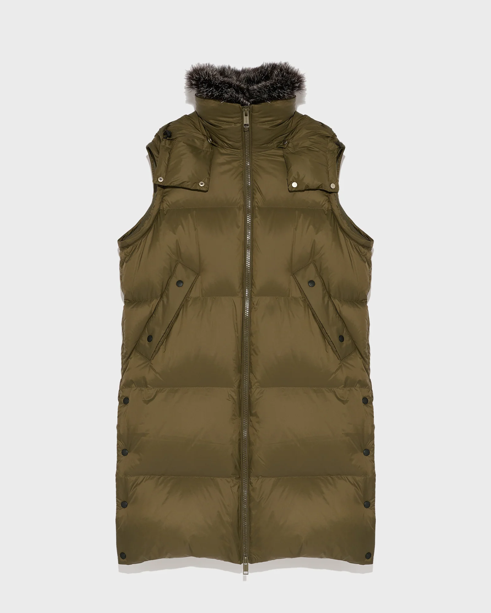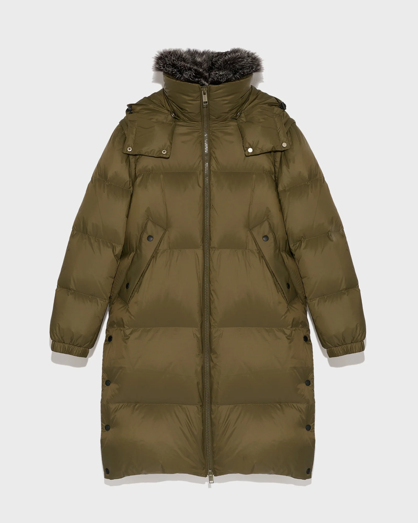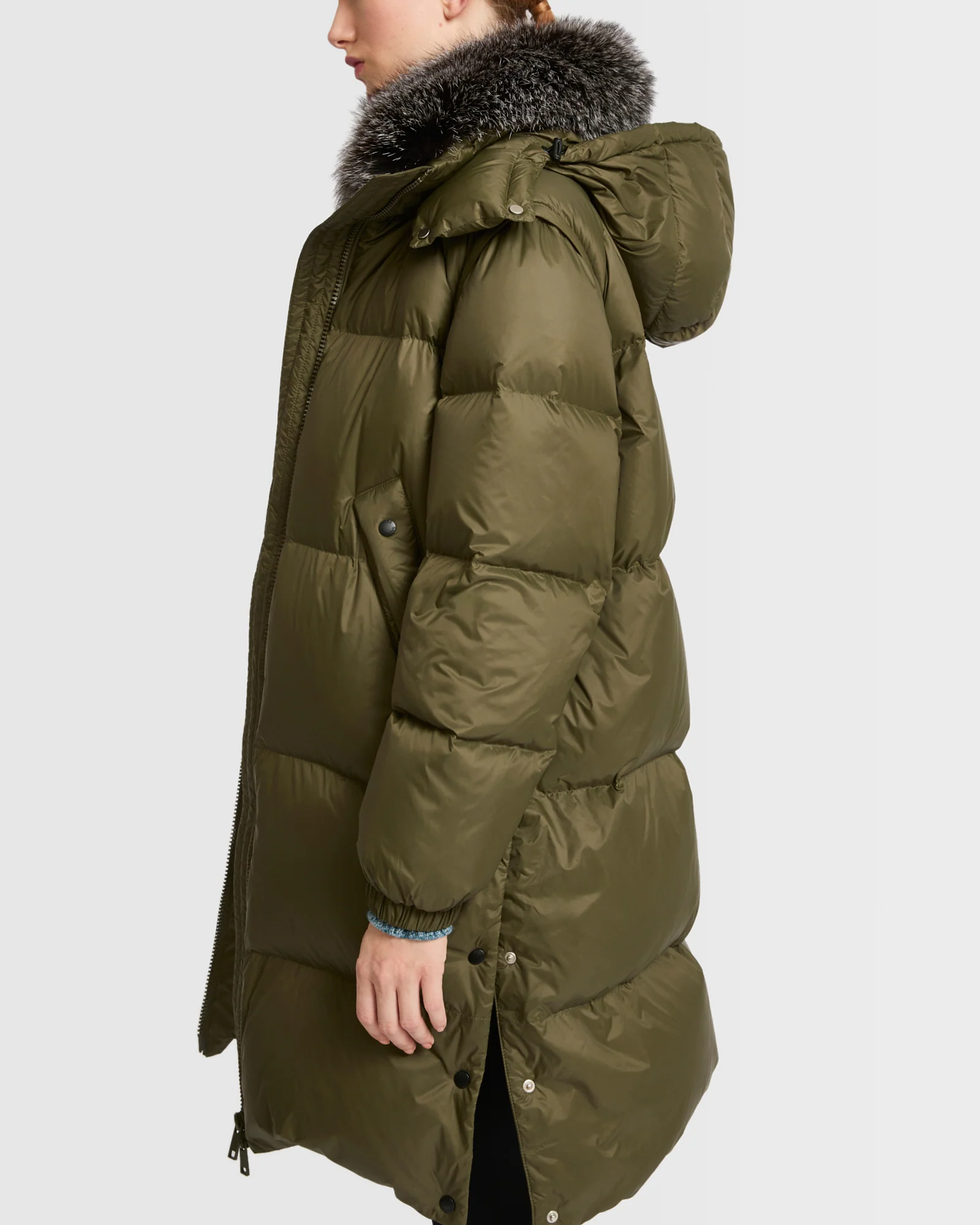 Perfectly suited to the coldest weather, this down jacket combines the technical qualities of a water-repellent fabric and down lining with the warmth and elegance of a detachable fox fur collar. A hood also detachable offers further protection against the elements. This knee-length piece is especially versatile due to removable sleeves which allow it to be worn as a gilet, and it can be cinched using drawstring at the waist. Two large pockets welcome cold hands.