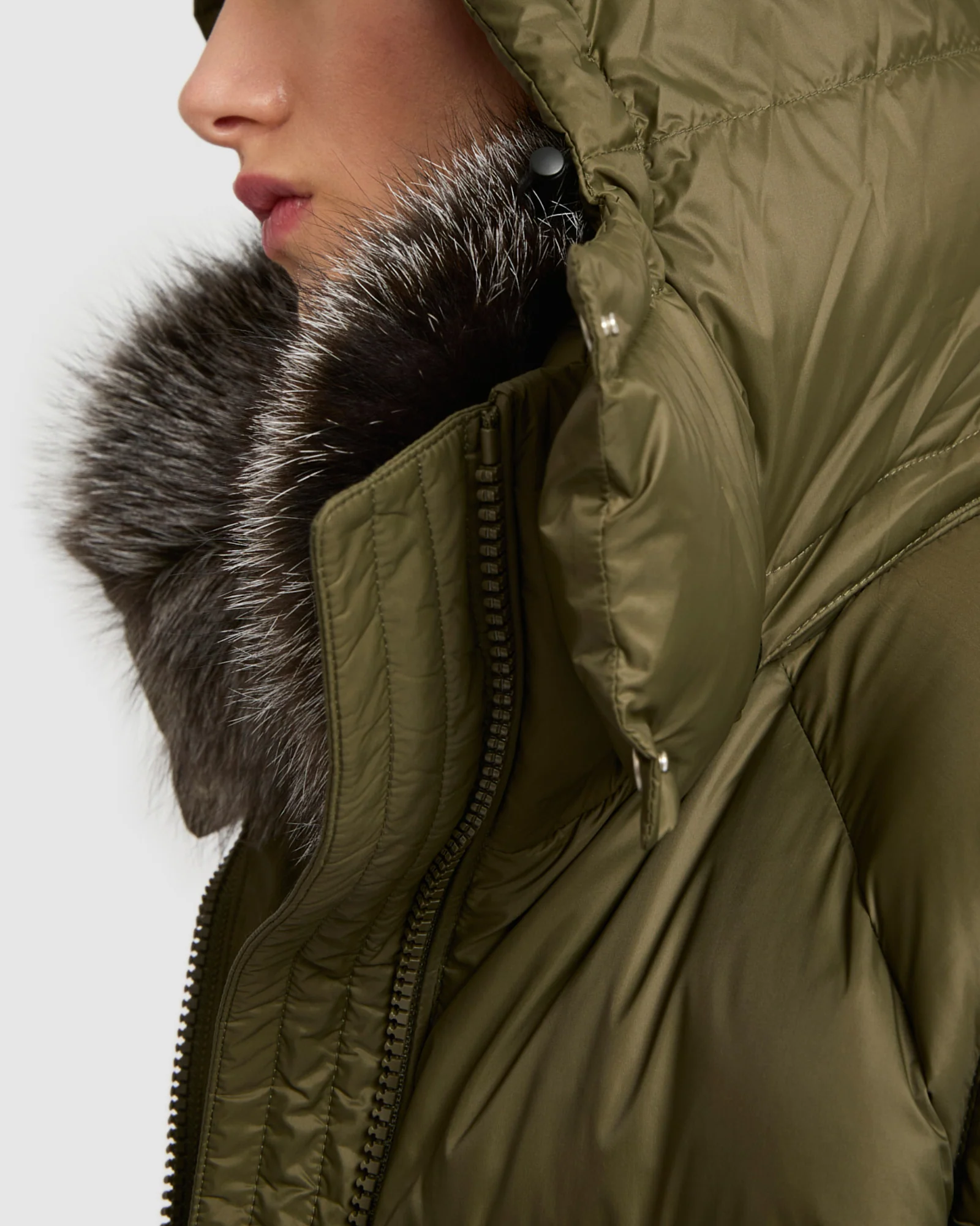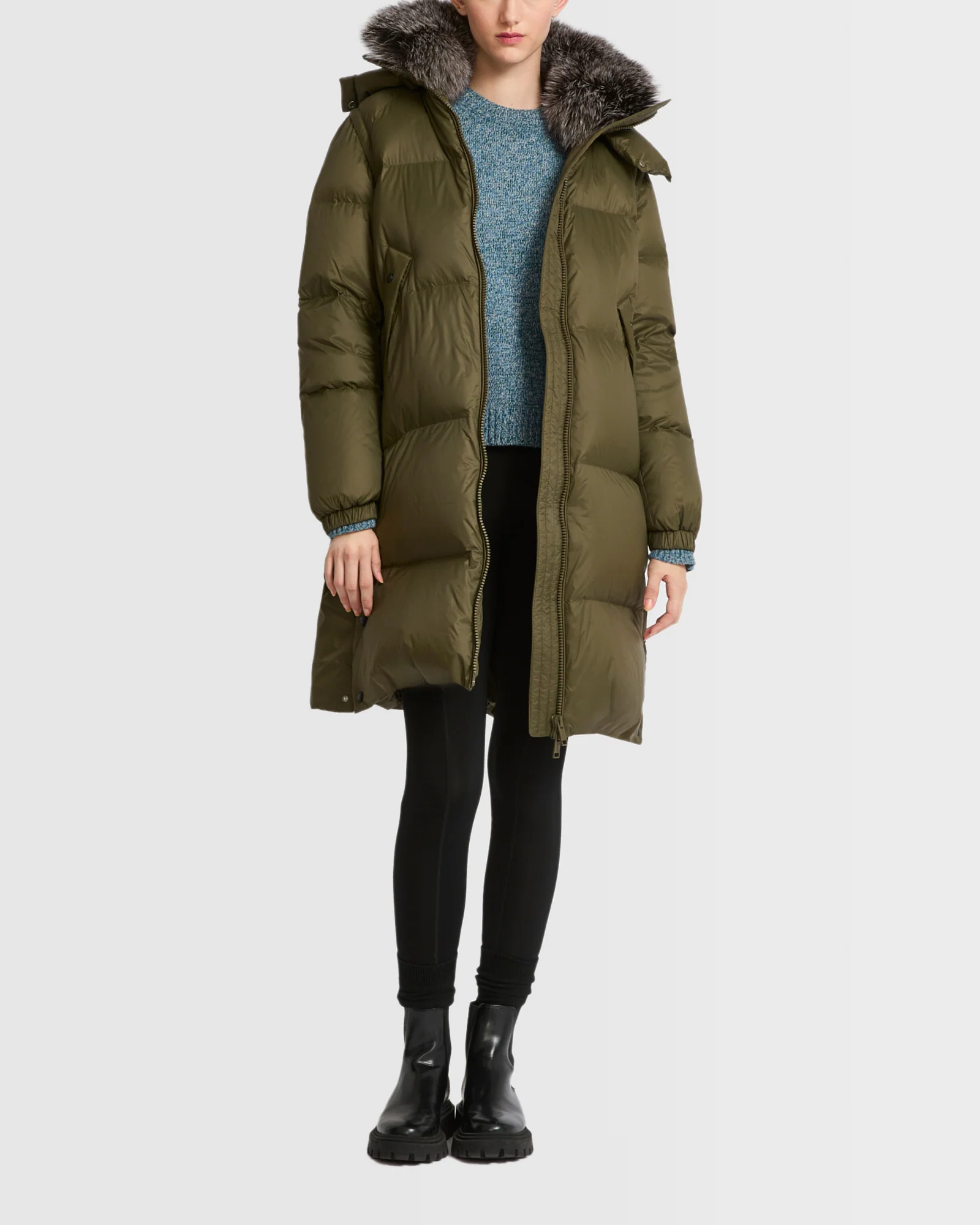 – Detachable collar trim in heather grey natural-dyed fox fur