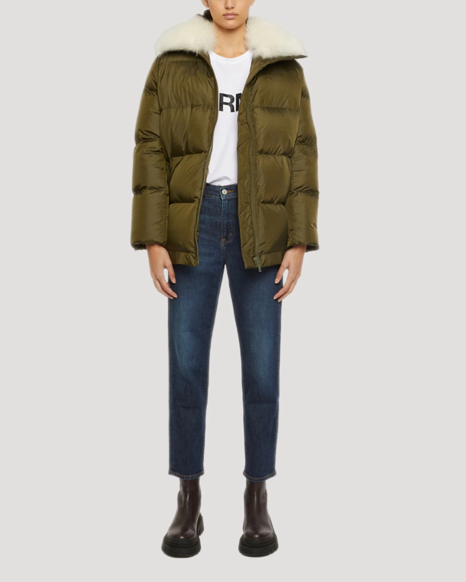 « A » line down jacket with wide lambswool collar – « A » shape down jacket with an oversize bottom– Water-repellent technical fabric down jacket filled with high quality feathers and down– Length 76 cm– Removable collar trim in long, relaxed lambskin cashmere touch– Front zip closure– Design with zipped side slits– Welt pockets with press-studs– Invisible technical […]