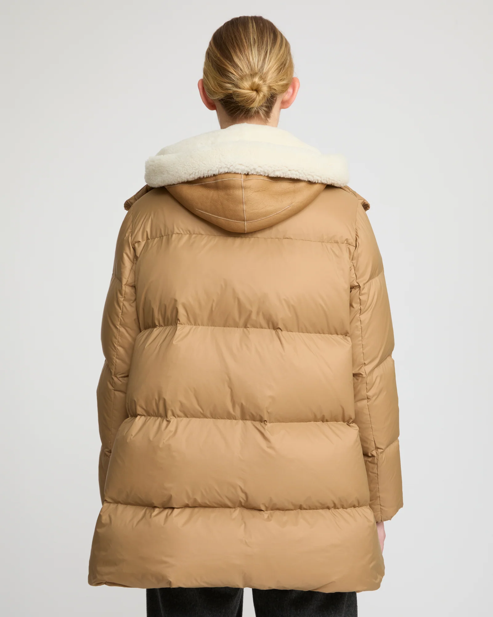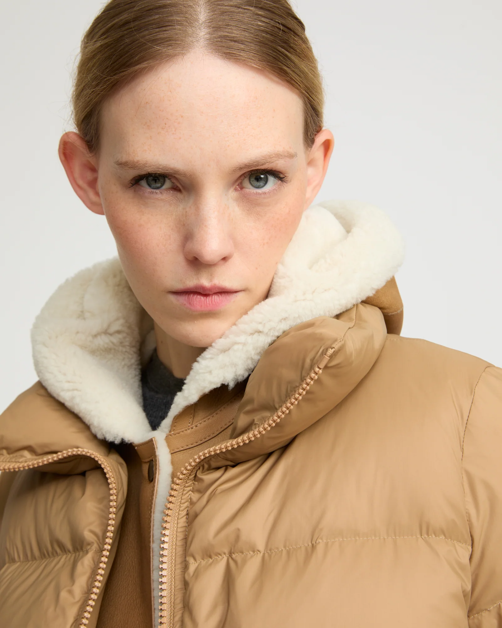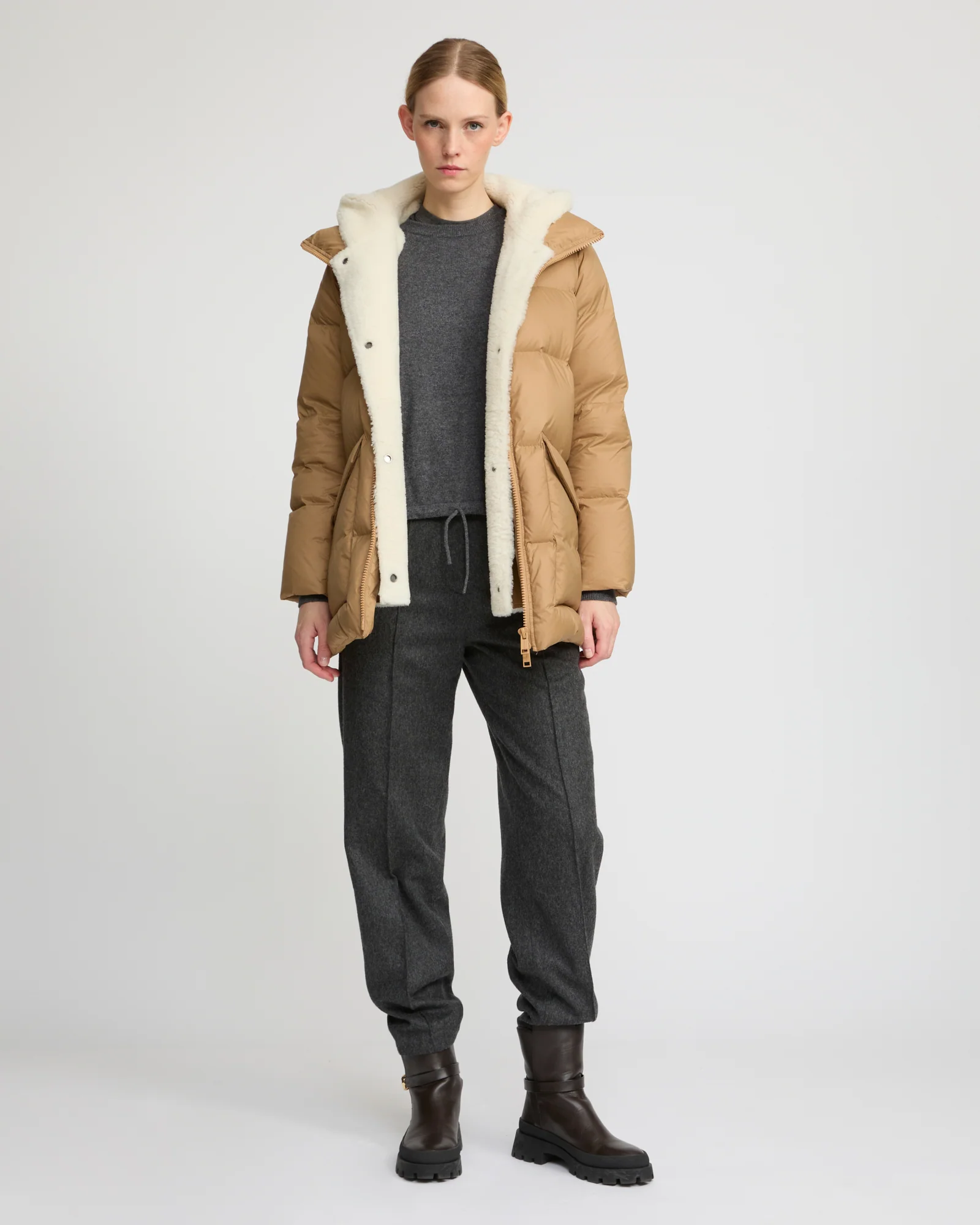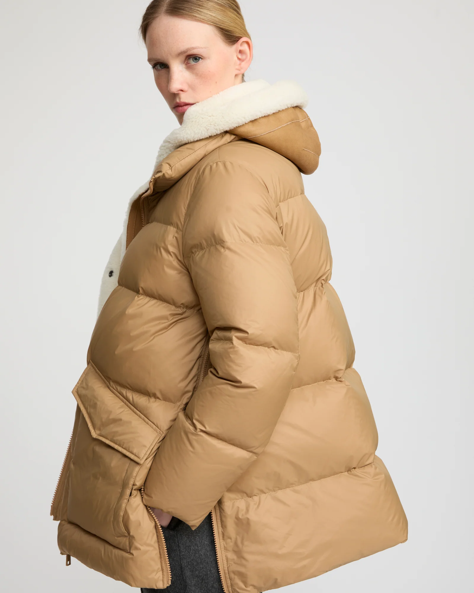 The A-line shape of this down jacket is highlighted by side zips. A removable bib in Merino shearling provides luxurious warmth and additional protection to a design tested at -10°C to ensure complete protection against the elements, thanks to its high quality down and its water-resistant technical fabric.