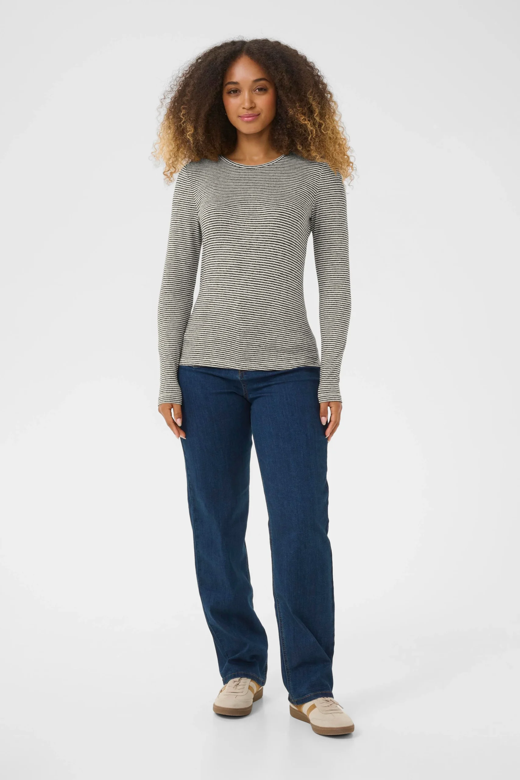 Haut manches longues femme coupe ajustée, col rond et tissu stretch confortable. Silhouette sobre, idéale au quotidien ou en superposition.