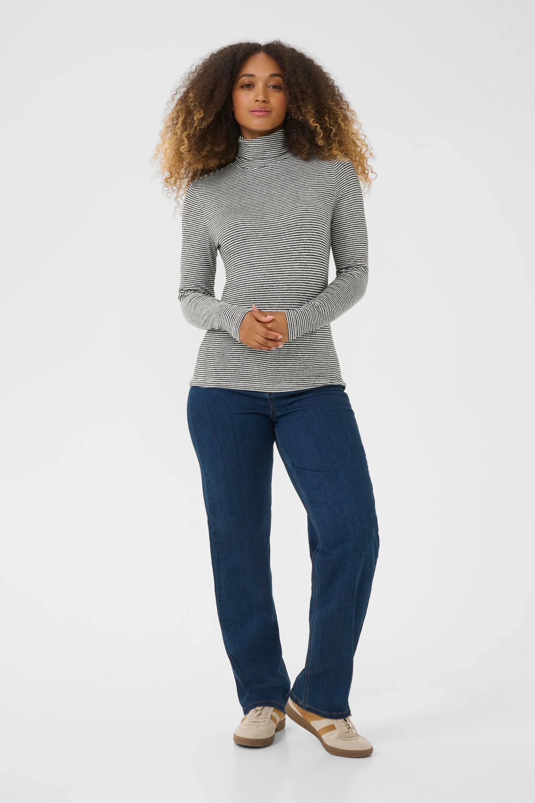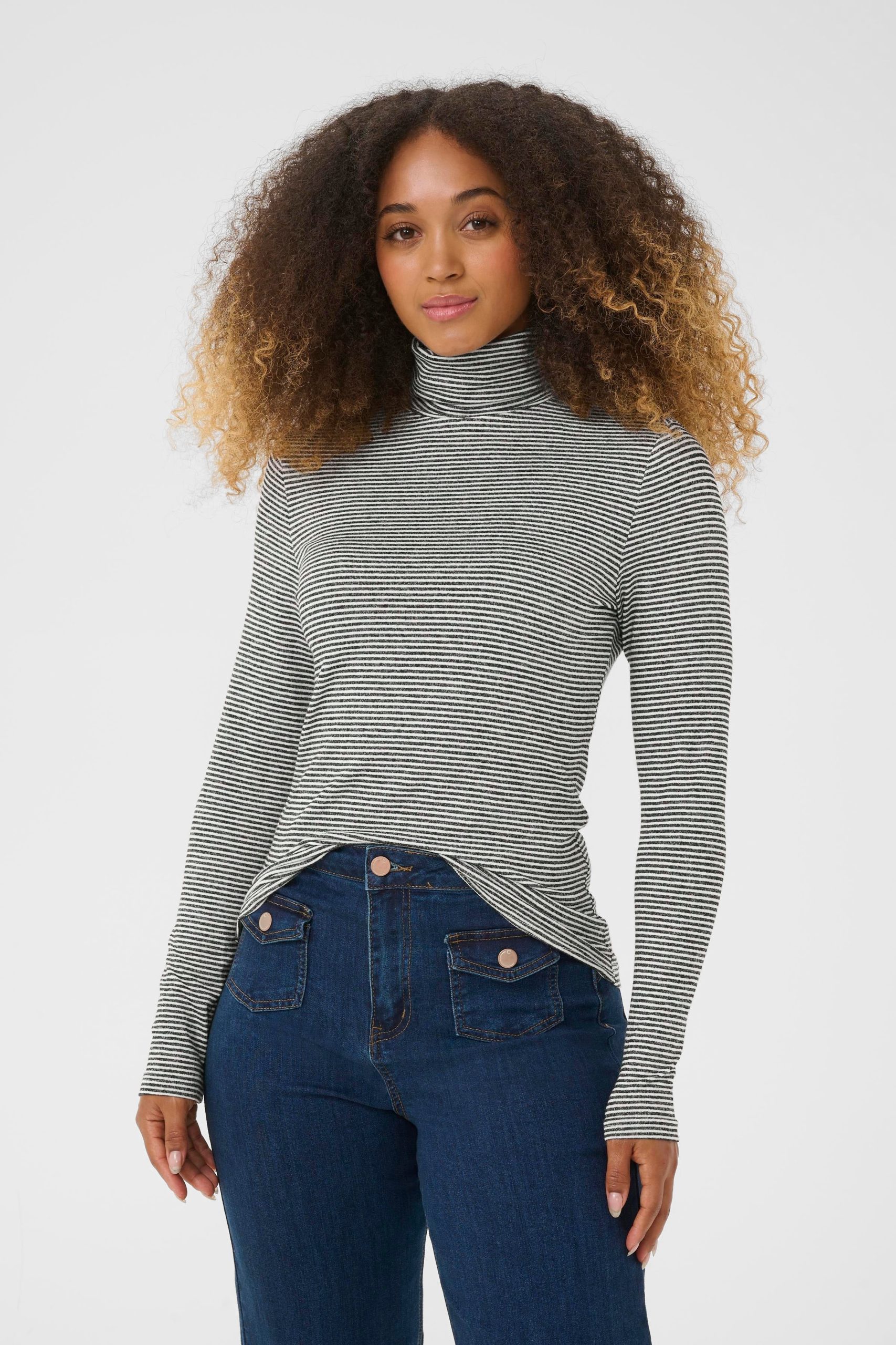Col roulé ajusté à manches longues. Finition lisse et silhouette épurée apportent une touche sophistiquée à tous les looks urbains.
