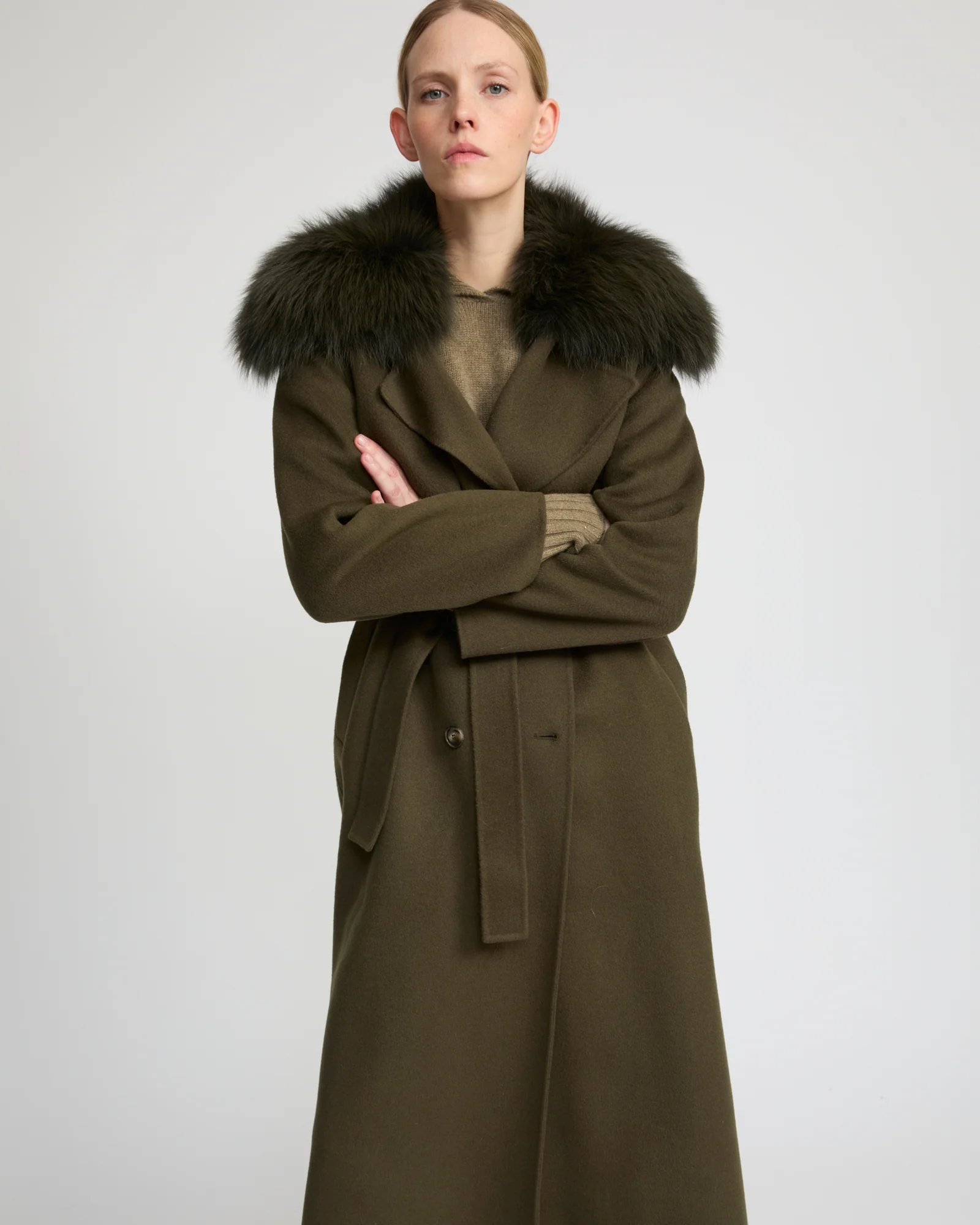 Belted coat in cashmere wool with fox fur collar