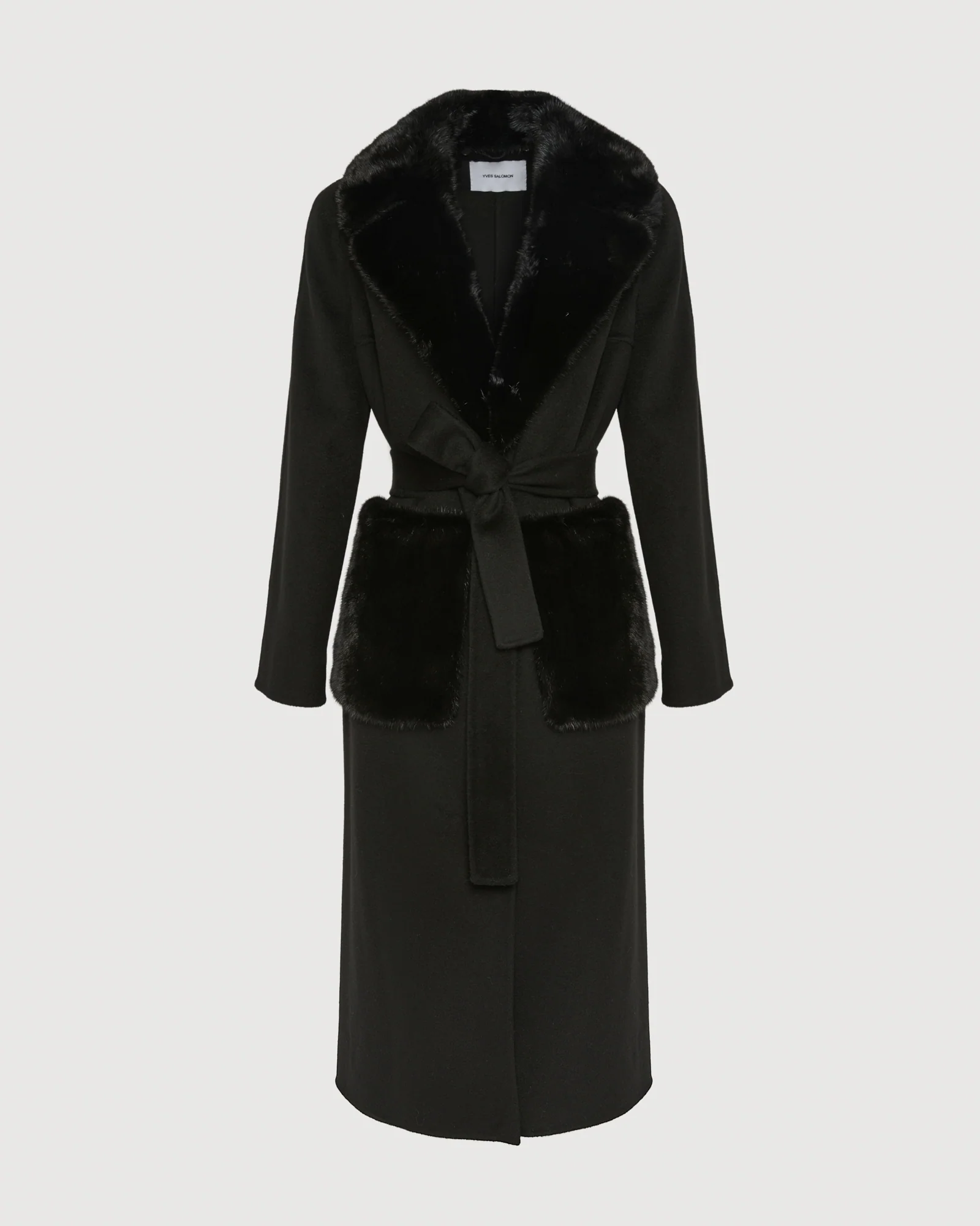 Long coat with side slits made from double-sided cashmere wool. Featuring a tailored collar, two patch pockets and a belt fastening to adjust the silhouette, this model plays with the masculine feminine codes. An evolving style thanks to removable mink fur collar and over-pockets. Elegant details that make all the difference and fasten perfectly to the coat using concealed button systems. A versatile and enveloping piece to suit every mood and temperature.