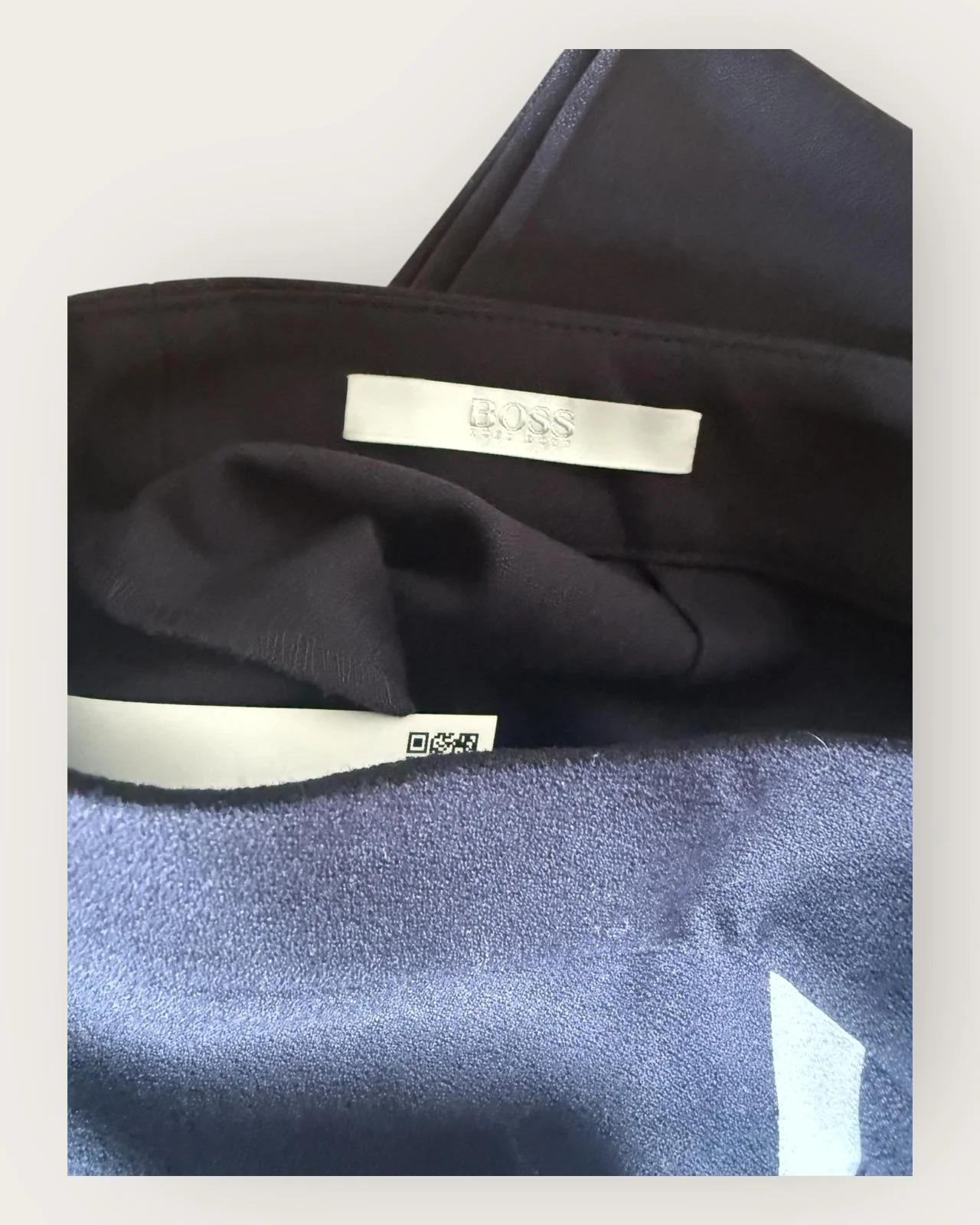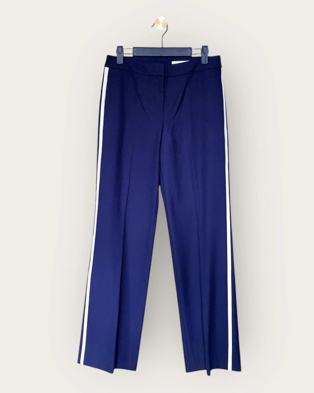 Pantalon tailleur BOSS, en seconde main. Ce pantalon de tailleur BOSS incarne l’élégance contemporaine avec sa coupe parfaitement ajustée et son bleu marine classique. La bande blanche sur la hauteur de la jambe ajoute une touche sportive et moderne, créant un contraste subtil qui dynamise la silhouette. Parfait pour une allure soignée au bureau ou pour une sortie plus décontractée avec un twist élégant.
