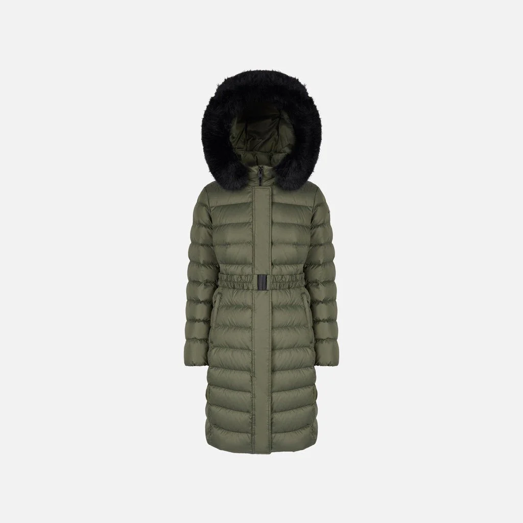 Doudoune longue pour femme au design élégant, dotée d’une ceinture qui met en valeur la silhouette et d’une fourrure amovible de couleur contrastée sur le col. Proposé ici en vert olive, ce modèle est réalisé en tissu de polyester ultraléger, avec un rembourrage XDOWN chaud en plumes régénérées qui protège du vent et de la […]