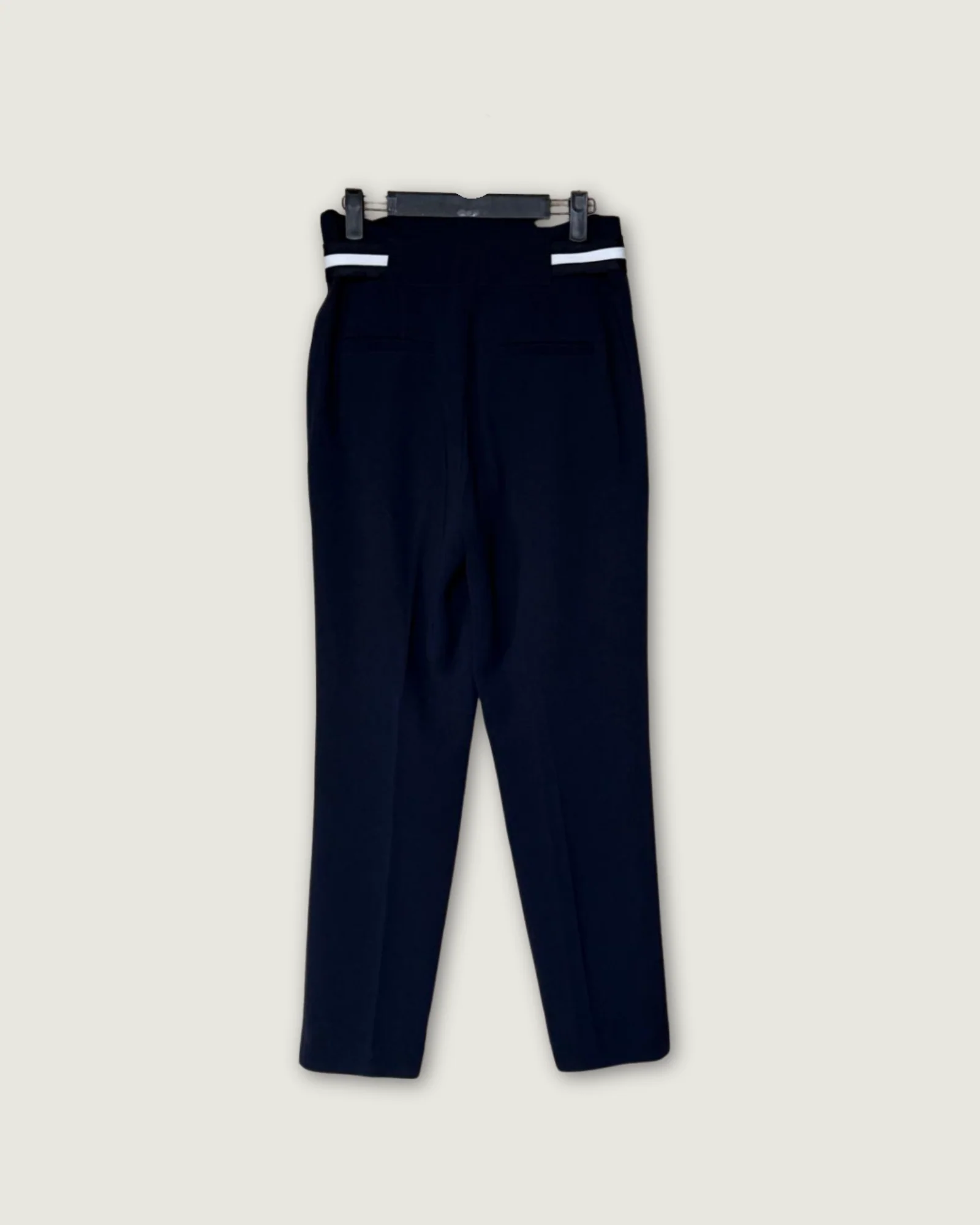 Élégance et allure parisienne se rencontrent dans ce pantalon à pinces bleu marine signé Claudie Pierlot. Confectionné dans une matière fluide et structurée, il offre une silhouette féminine et sophistiquée. Sa taille haute met en valeur la ligne de la taille, tandis que la ceinture assortie souligne subtilement la coupe impeccable du modèle.