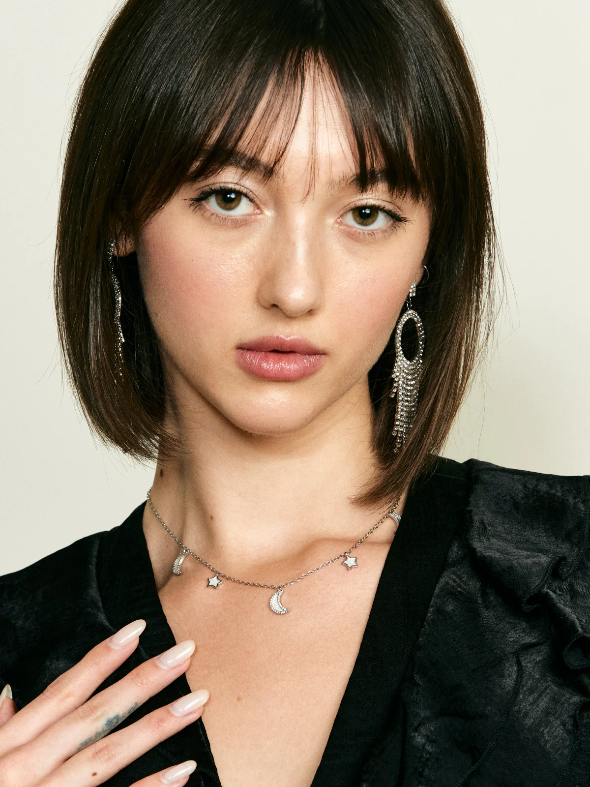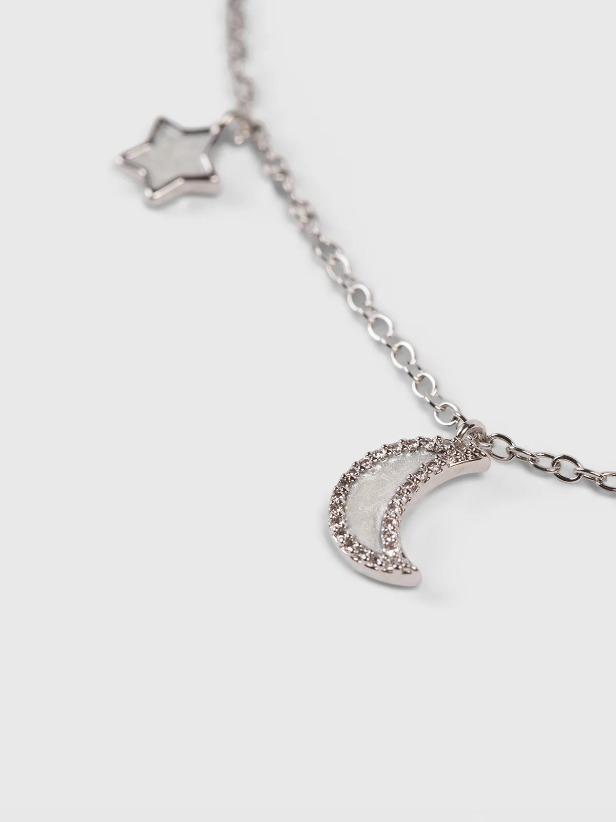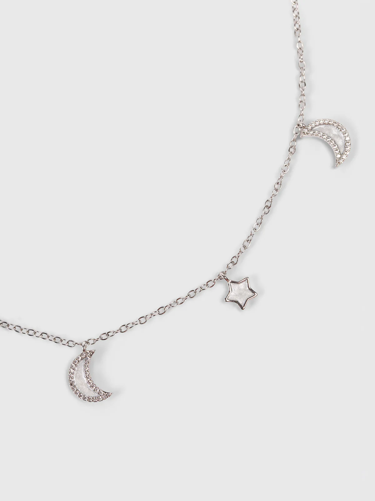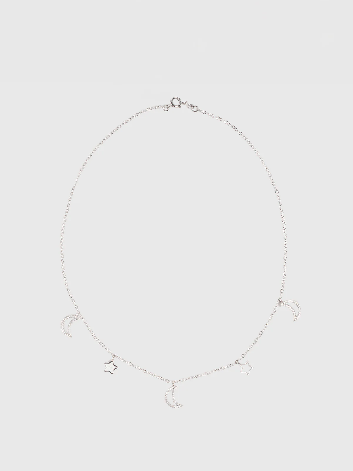 Collier composé d’une fine chaîne argentée supportant des pendentifs en forme de croissants de lune et d’étoiles. Chaque pendentif comporte une base claire entourée de petits strass.
