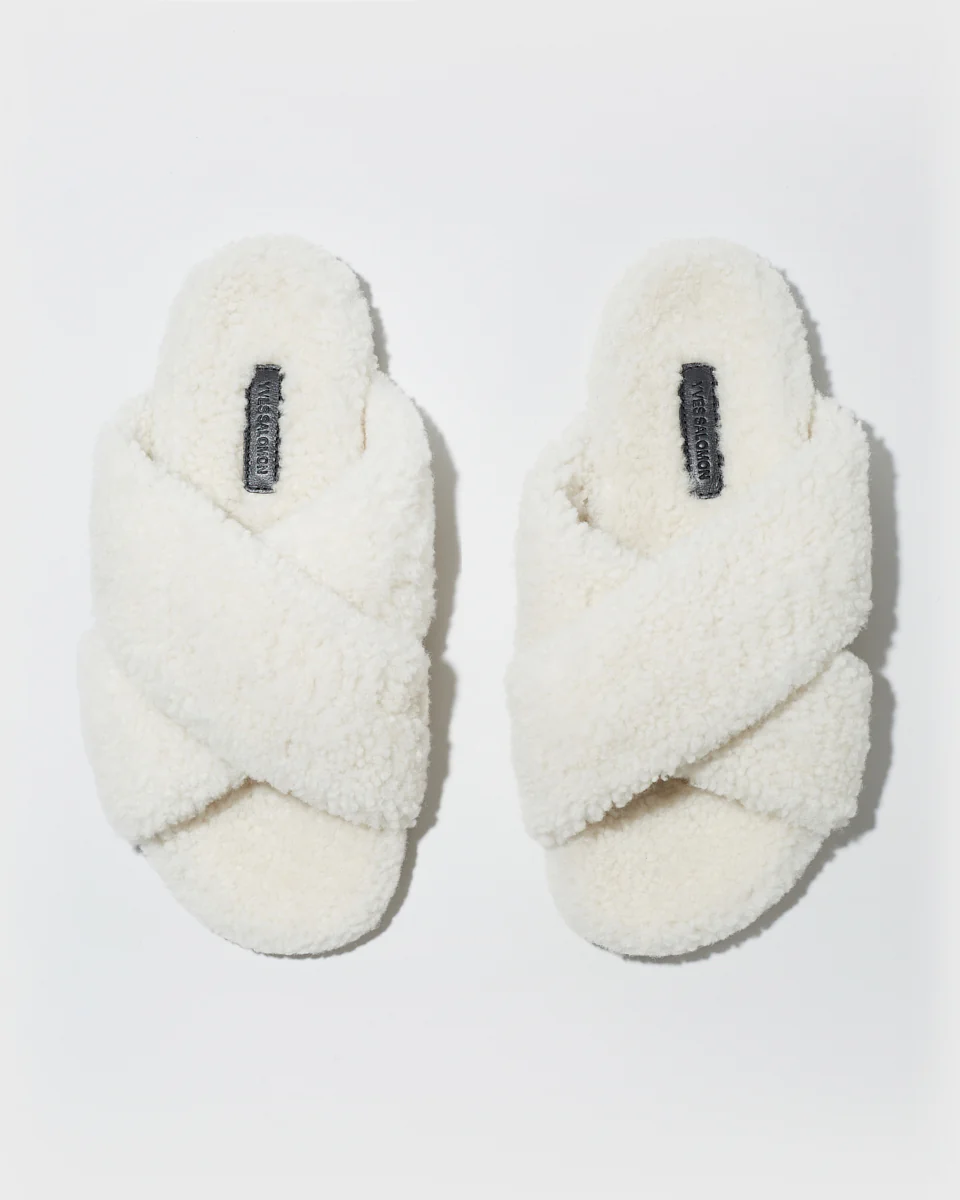Somewhere between slippers and sandals, these mules crafted from curly merino wool combine comfort with elegance. Featuring an interlaced shape and a pared-back design, these flat shoes ensure a resolutely modern look from day to night. – Wool outer side– Interlaced shape– Rubber soles– Yves Salomon Collection