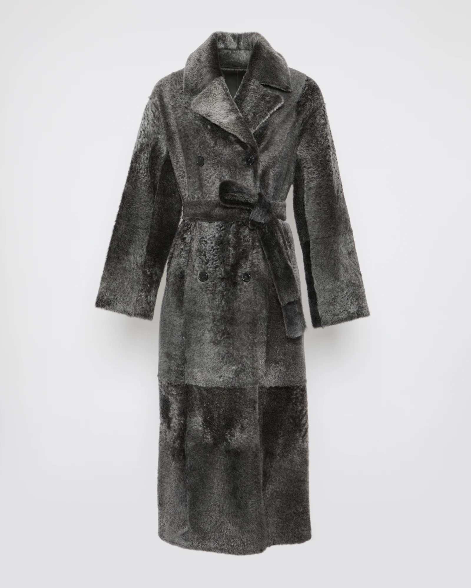 A military-inspired shape and an astrakhan texture for this long coat in lamb shearling with a wide collar and double-breasted front. A removable belt allows the shape to be cinched.
