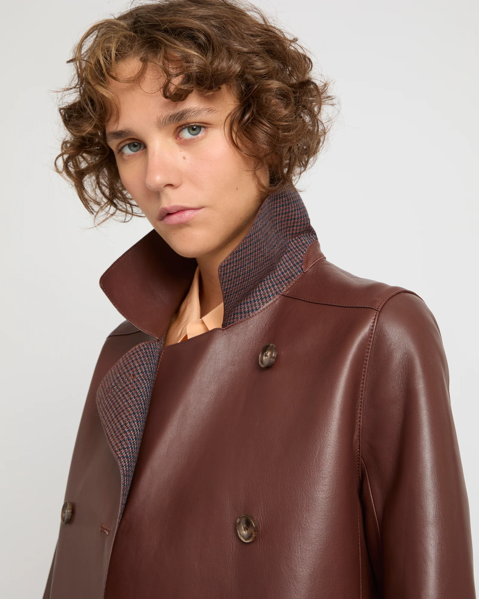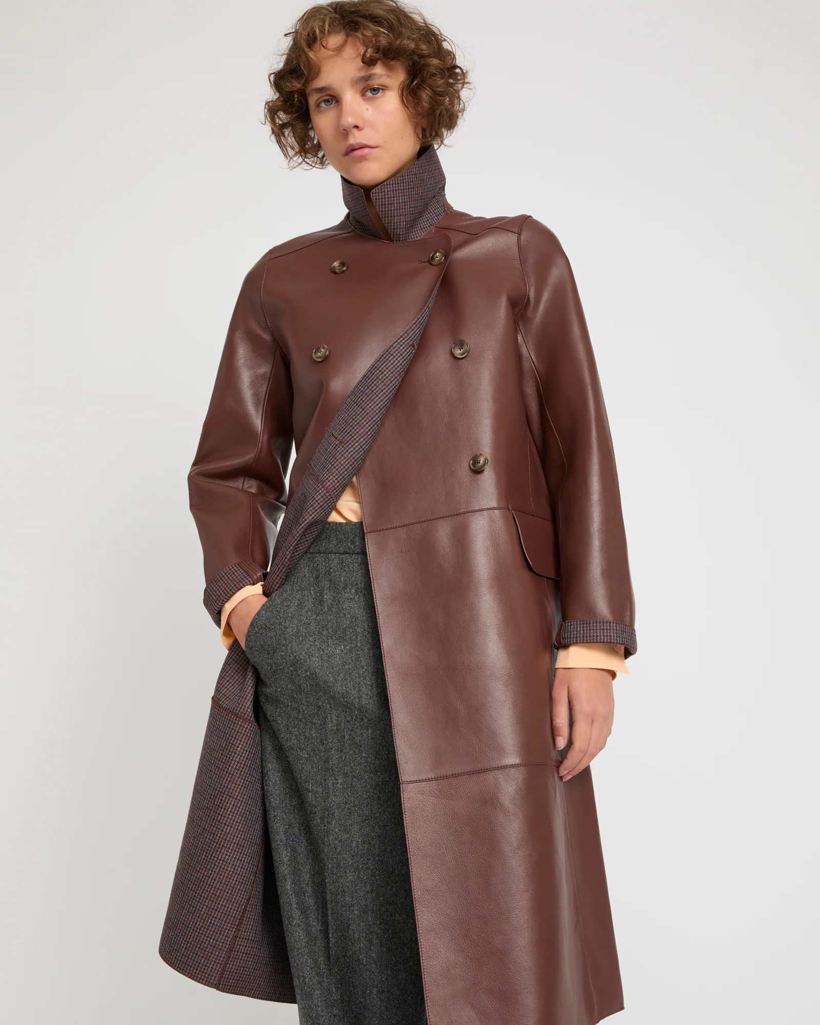 With its clean lines and military-inspired shape, this double-breasted coat highlights a double-sided material which bonds together shiny lambskin and the matte texture of a wool houndstooth fabric, which is revealed on the lapels. Flap pockets and a rear martingale add a retro feel to this sophisticated design.