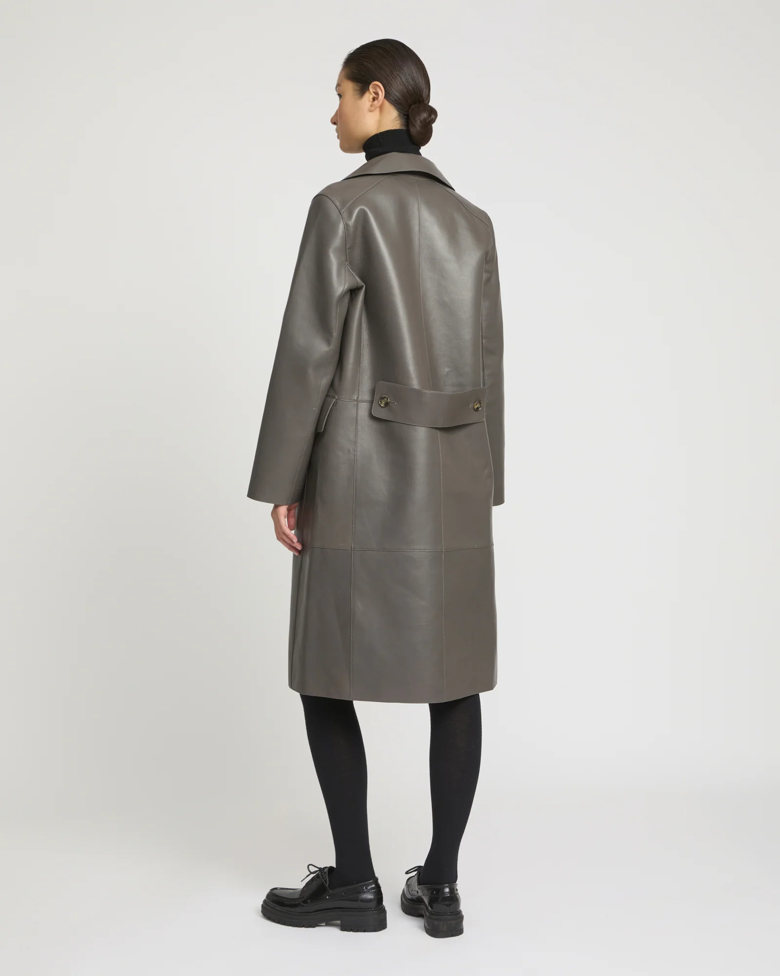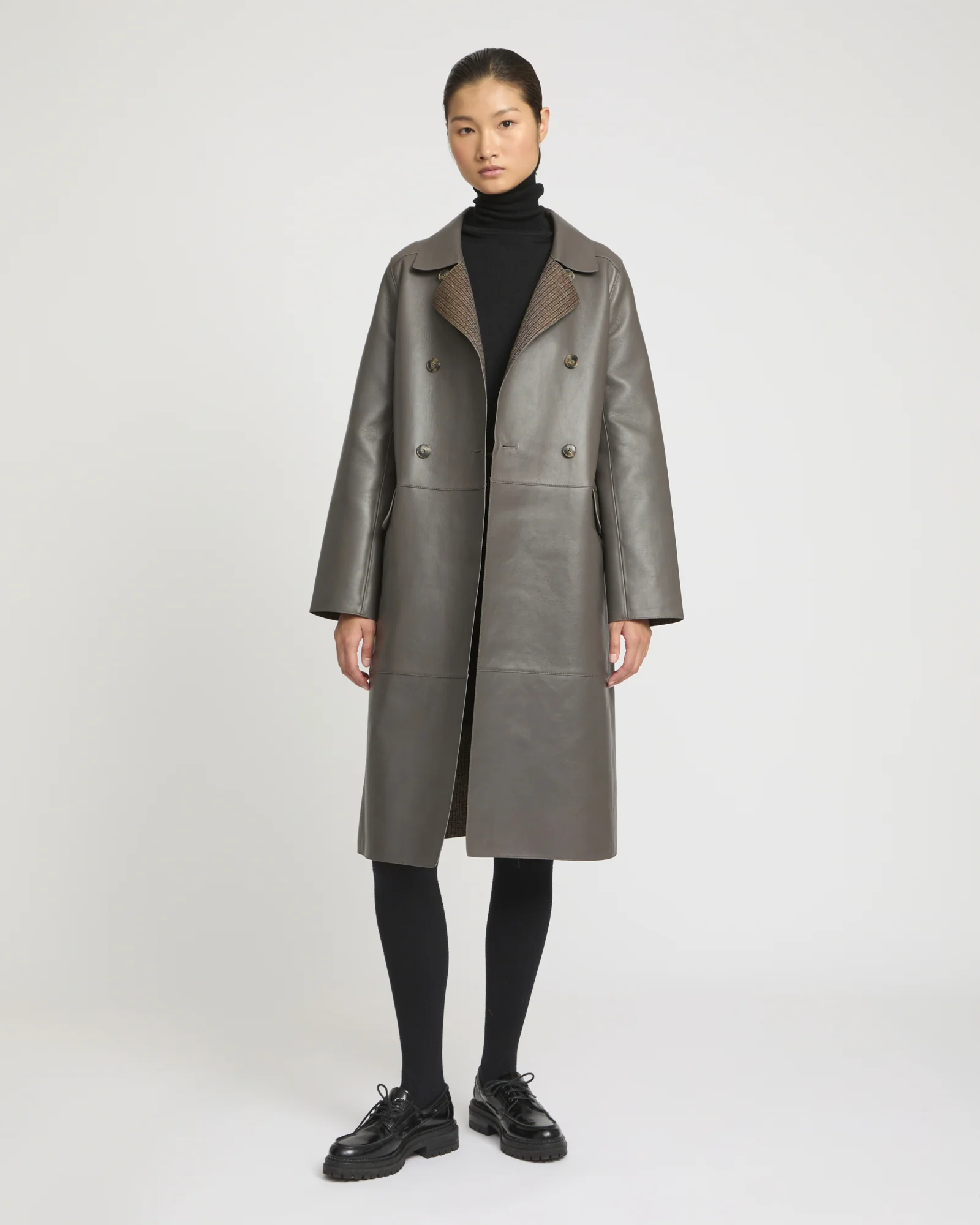 With its clean lines and military-inspired shape, this double-breasted coat highlights a double-sided material which bonds together shiny lambskin and the matte texture of a wool houndstooth fabric, which is revealed on the lapels. Flap pockets and a rear martingale add a retro feel to this sophisticated design.