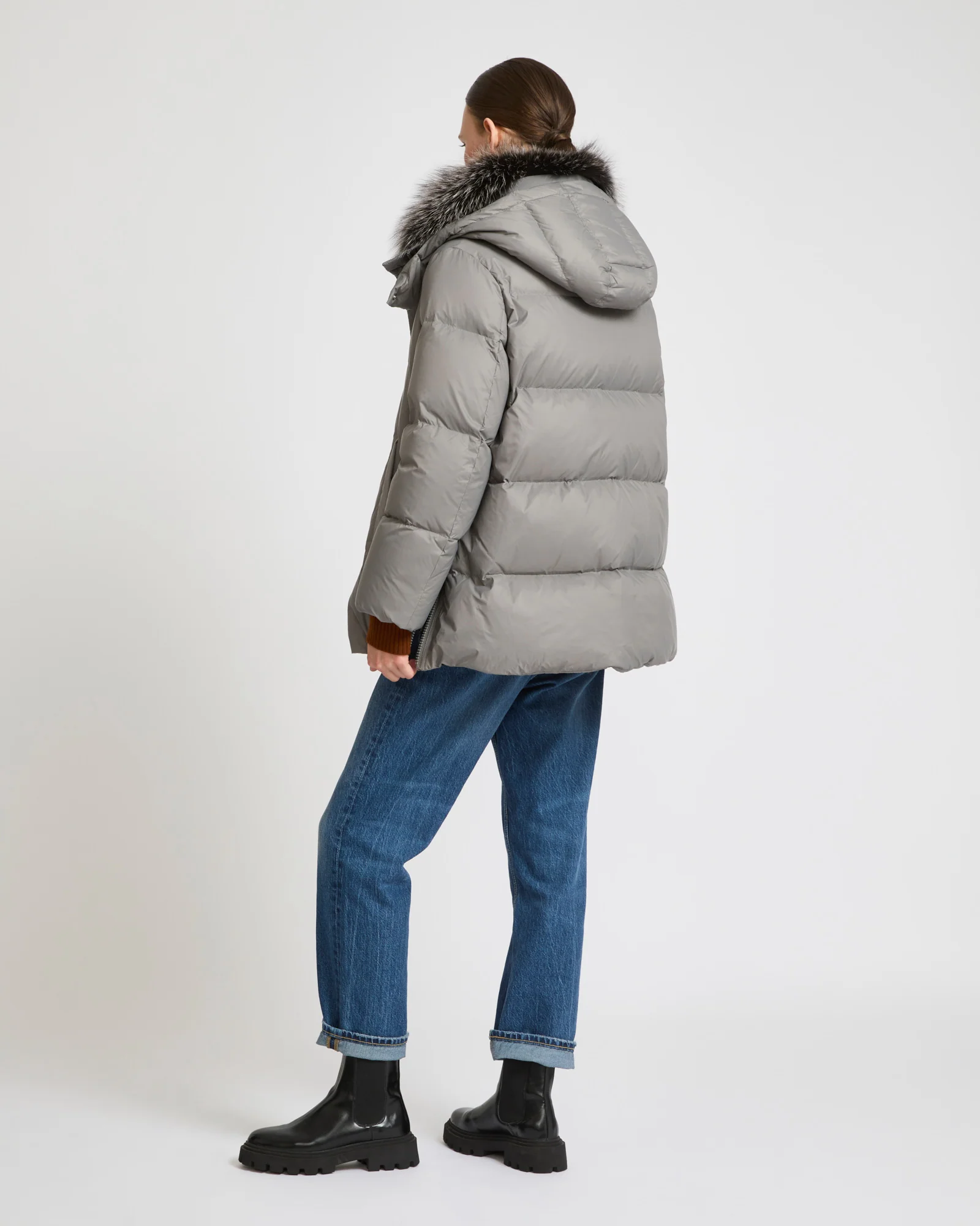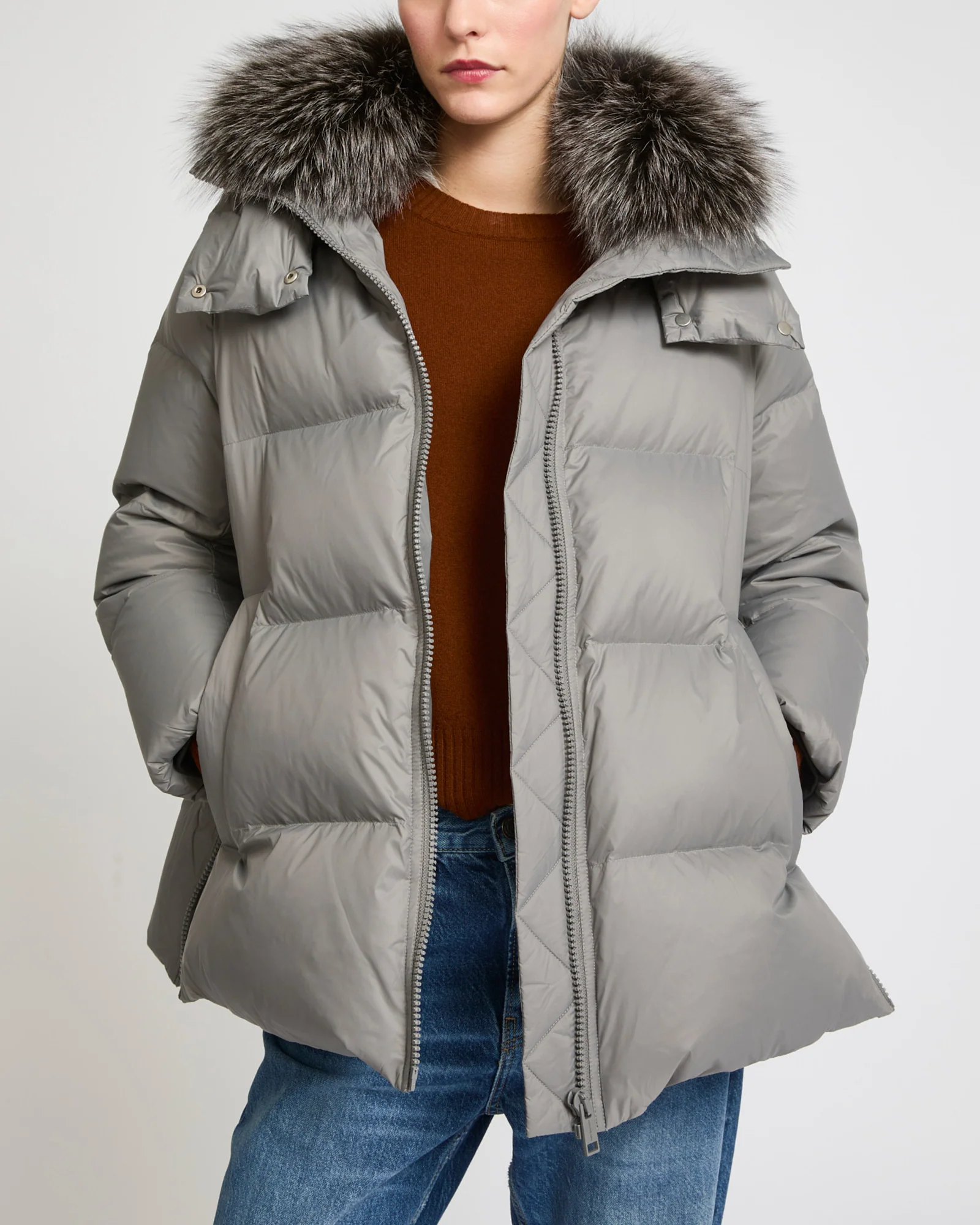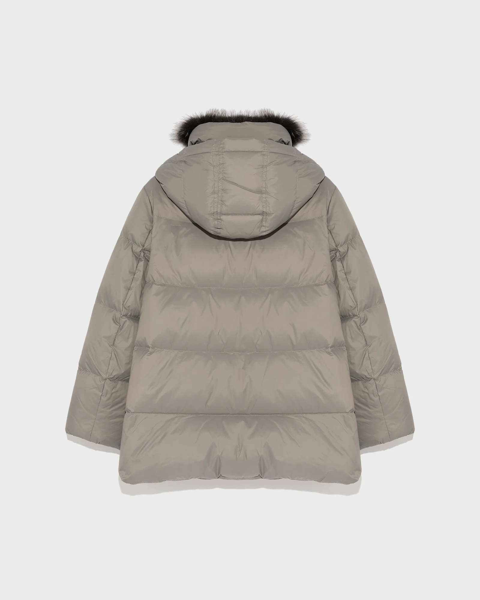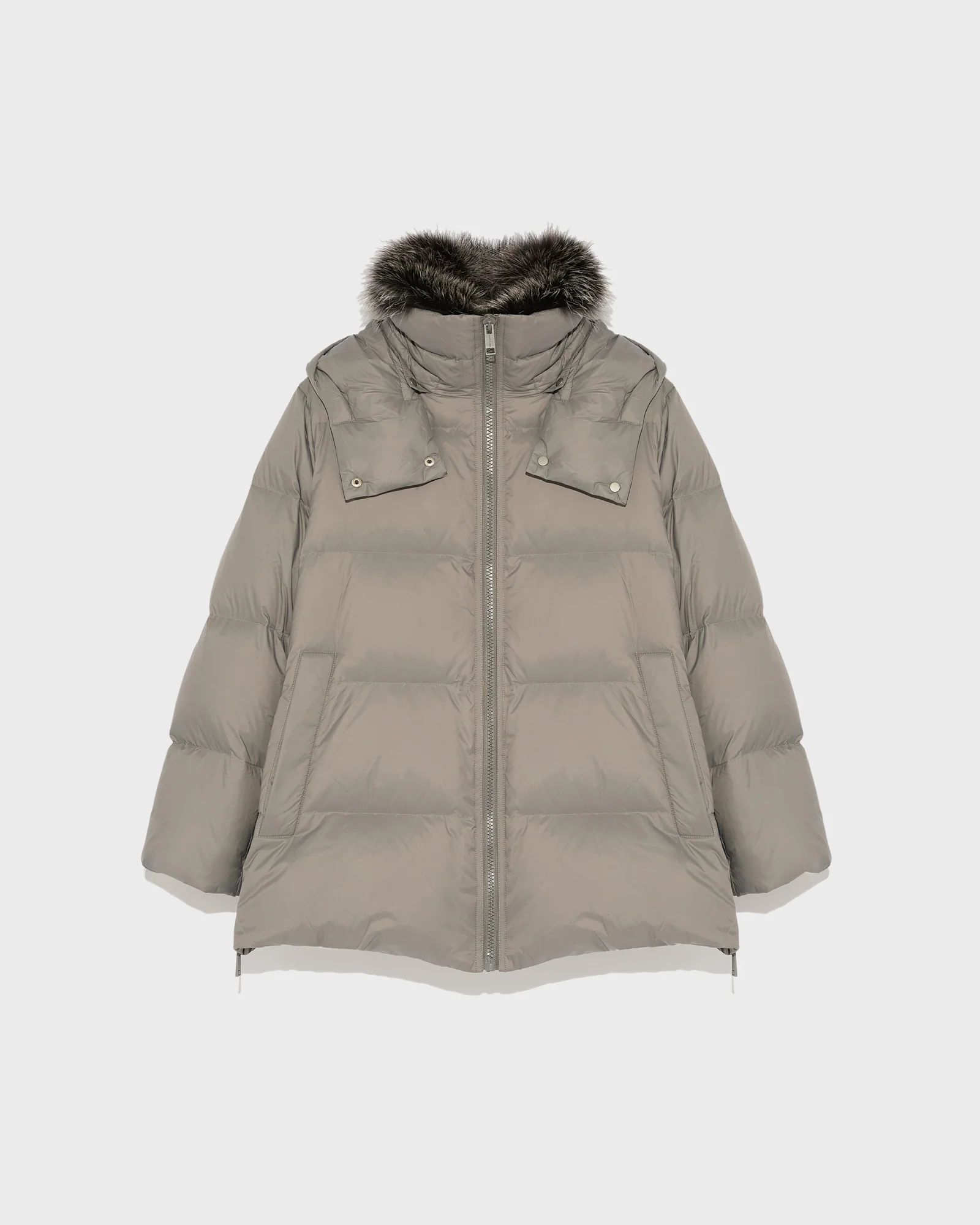 Crafted from water-repellent technical fabric, this iconic « A » line down jacket is padded with high-quality down and duck feathers for warmth and breathability. Design details include a front zip fastening, two welt pockets and invisible technical ribbed finishes at the bottom sleeves. Functional and lightweight at the same time, this model has side zip slits for extra ease and a touch of modernity. Featuring a detachable hood and a removable collar trim in natural-dyed fox, this versatile down jacket combines comfort with elegance.