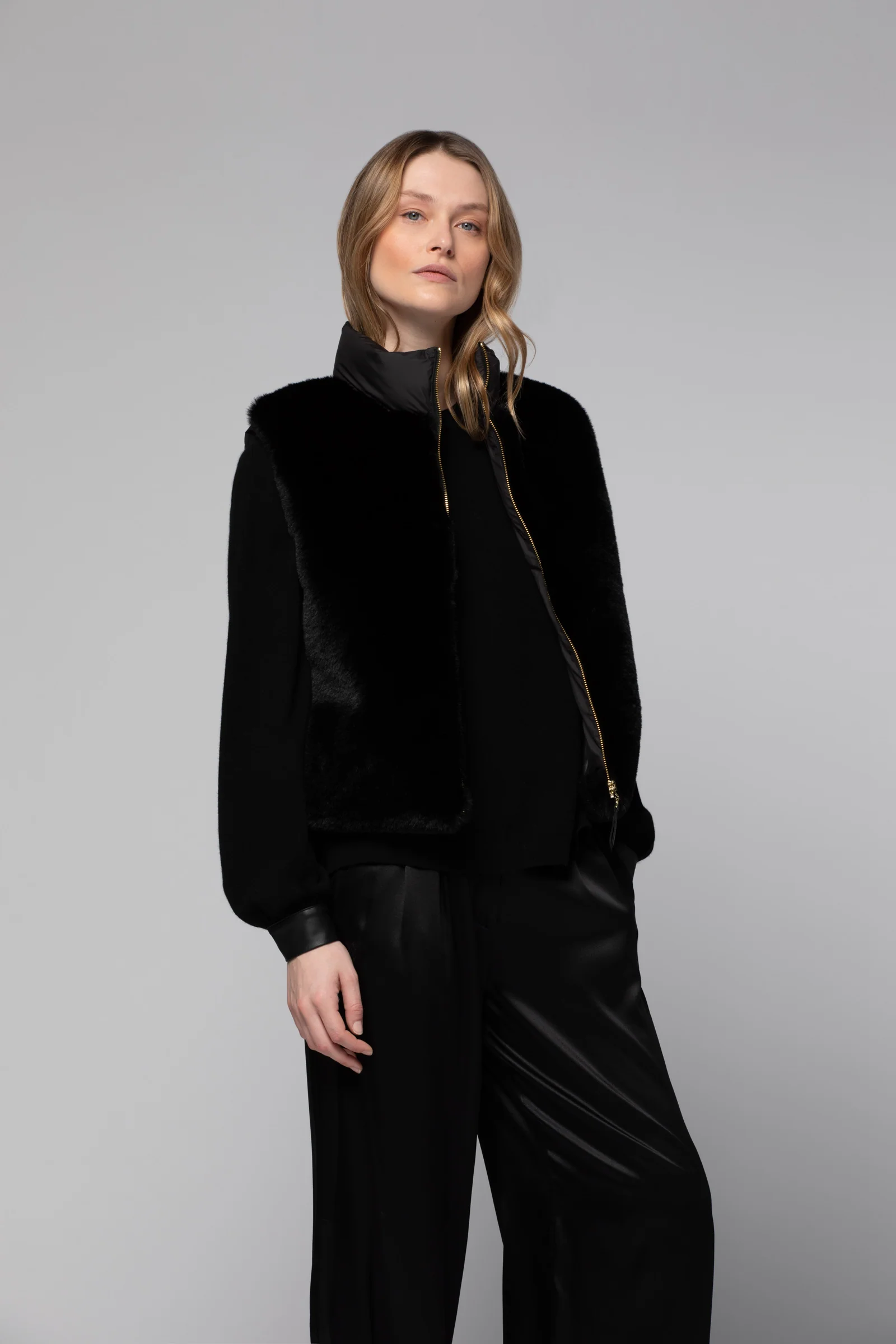 Avec son design sans manches et son rembourrage léger, notre doudoune DUALITA est parfaite pour la mi-saison. Aussi chic que décontractée, cette doudoune en nylon se distingue par une superbe fausse fourrure façon renard, au toucher exceptionnel. Son col montant lui confère une touche de modernité, tandis que ses poches discrètes, habilement intégrées dans les découpes latérales, soulignent son allure épurée. La fermeture zippée, rehaussée d’une élégante tirette en cuir, signe l’allure d’un geste.