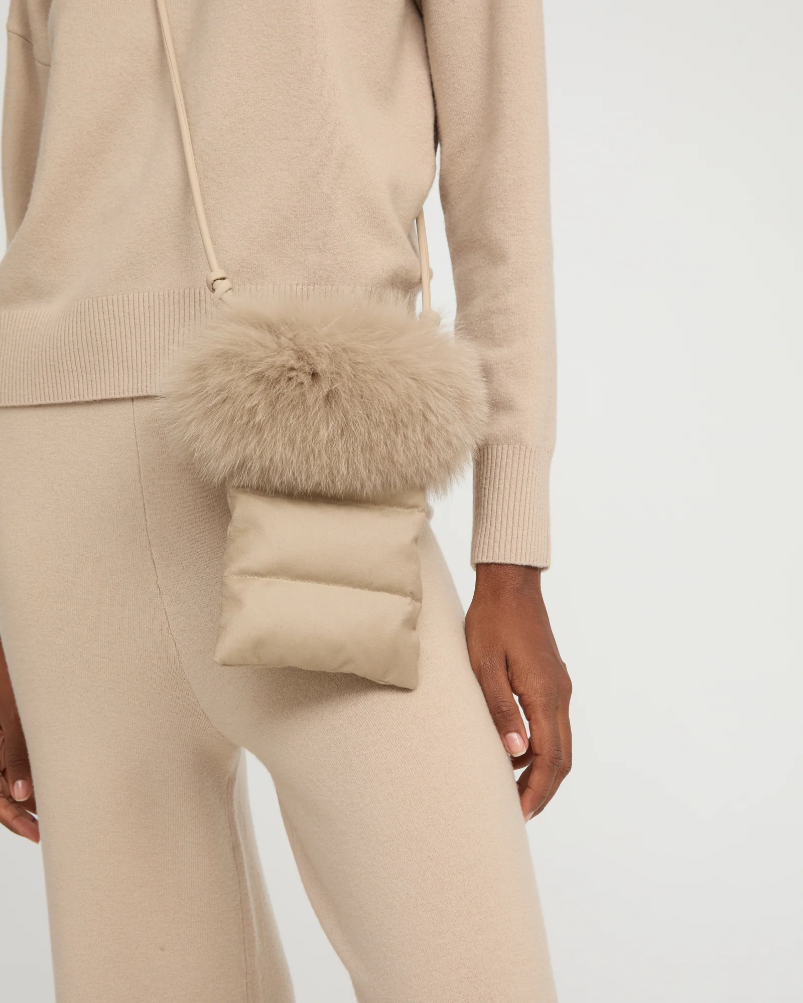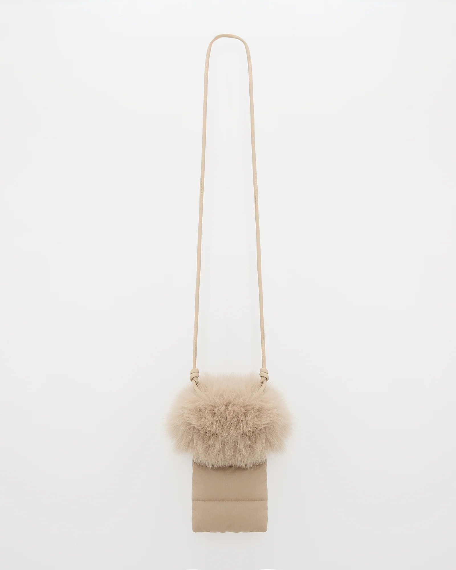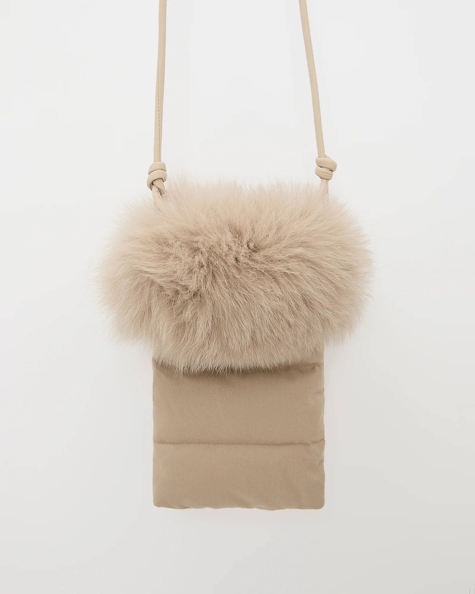The must-have accessory to keeps hands free – and a secure phone – whilst maintaining a stylish edge. Perfect for winter sports and for city wear, this quilted flannel case can be worn on the shoulder or as a crossbody, with the softness of fox fur as a visual and tactile feature.