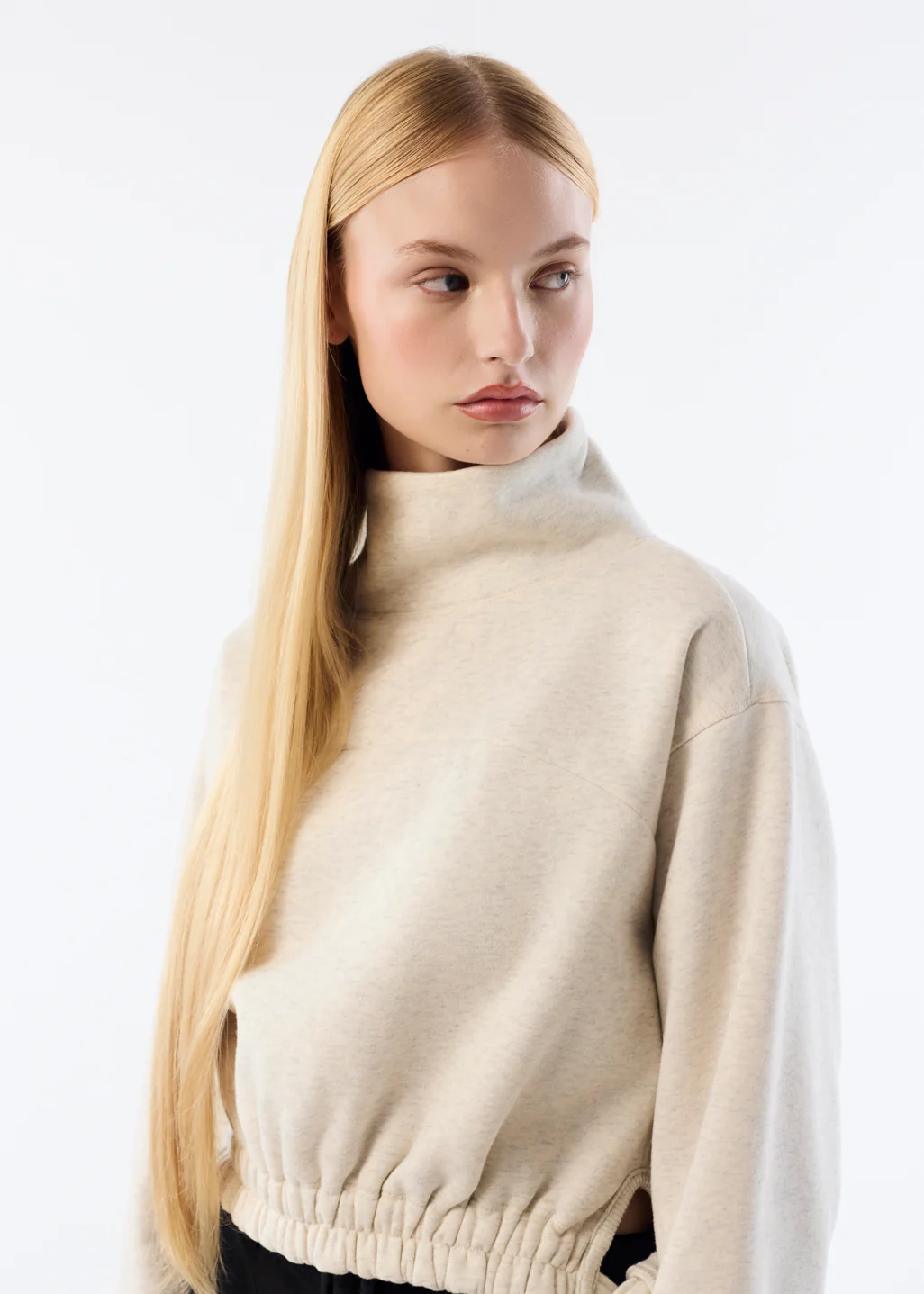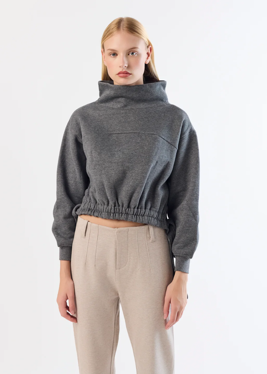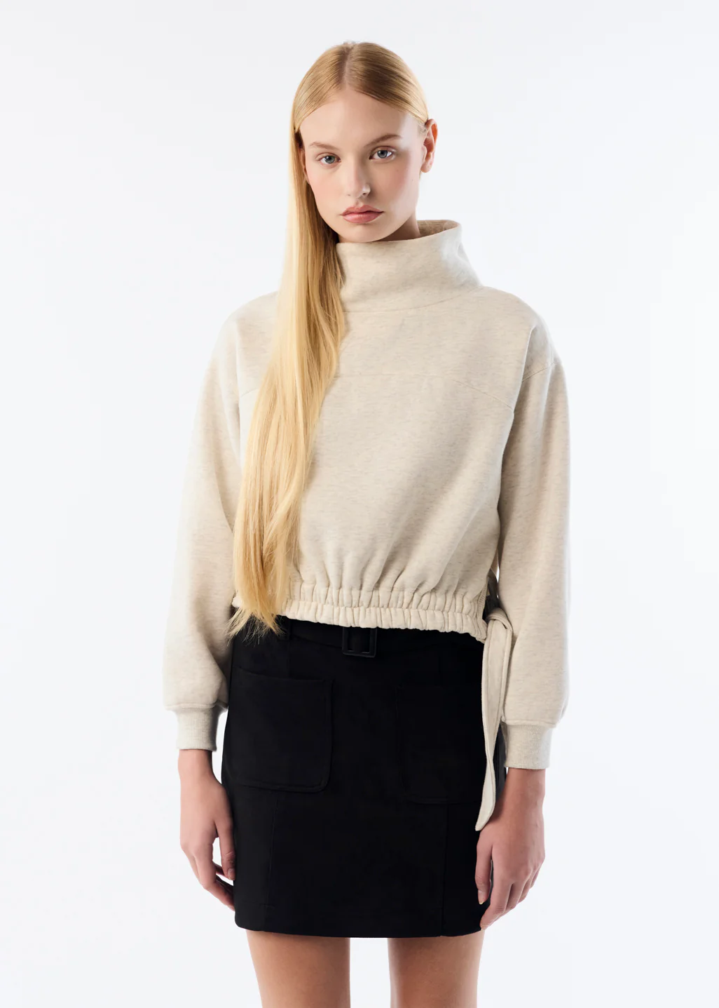 Ce sweat à col montant se distingue par une coupe courte et un ourlet élastique ajustable grâce à un nœud latéral, permettant de moduler la silhouette. Les manches légèrement bouffantes ajoutent du volume, tandis que les poignets resserrés apportent une touche structurée. Un modèle minimaliste avec des détails qui mêlent confort et originalité.