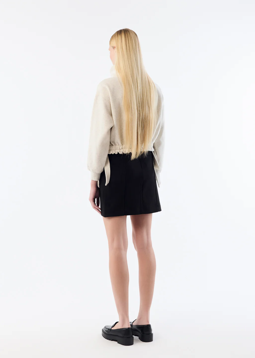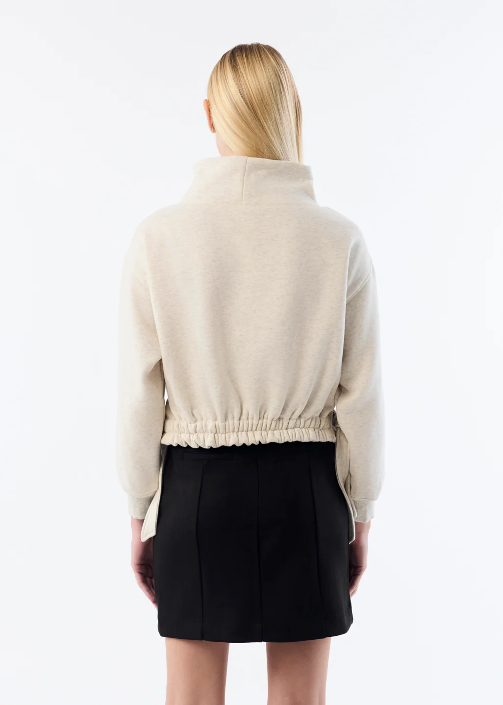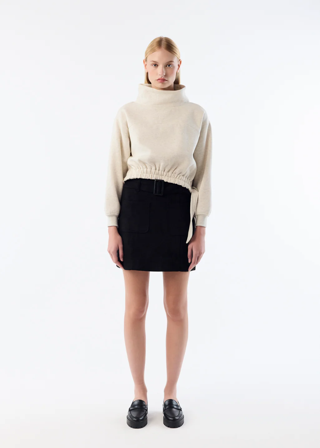 Ce sweat à col montant se distingue par une coupe courte et un ourlet élastique ajustable grâce à un nœud latéral, permettant de moduler la silhouette. Les manches légèrement bouffantes ajoutent du volume, tandis que les poignets resserrés apportent une touche structurée. Un modèle minimaliste avec des détails qui mêlent confort et originalité.