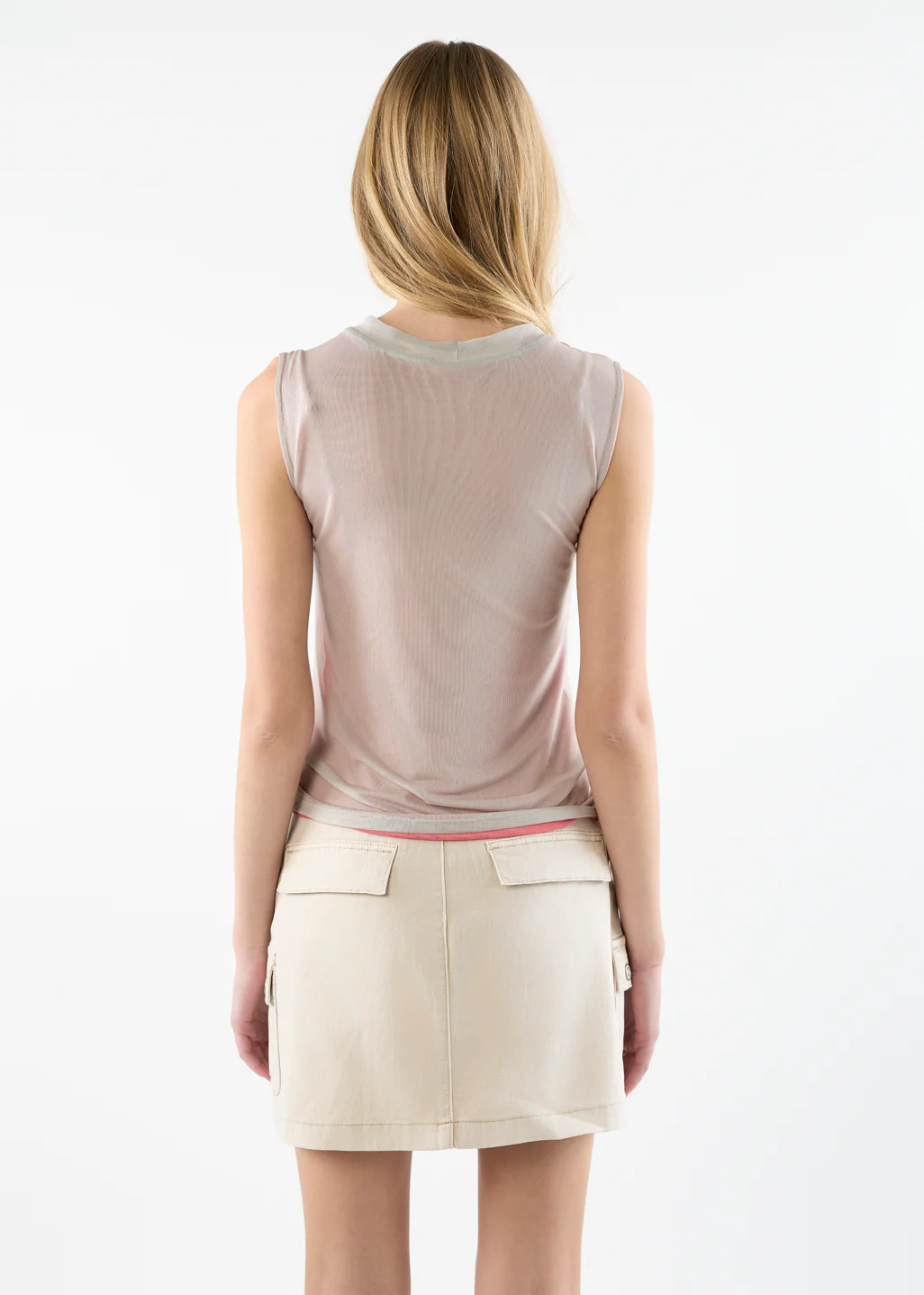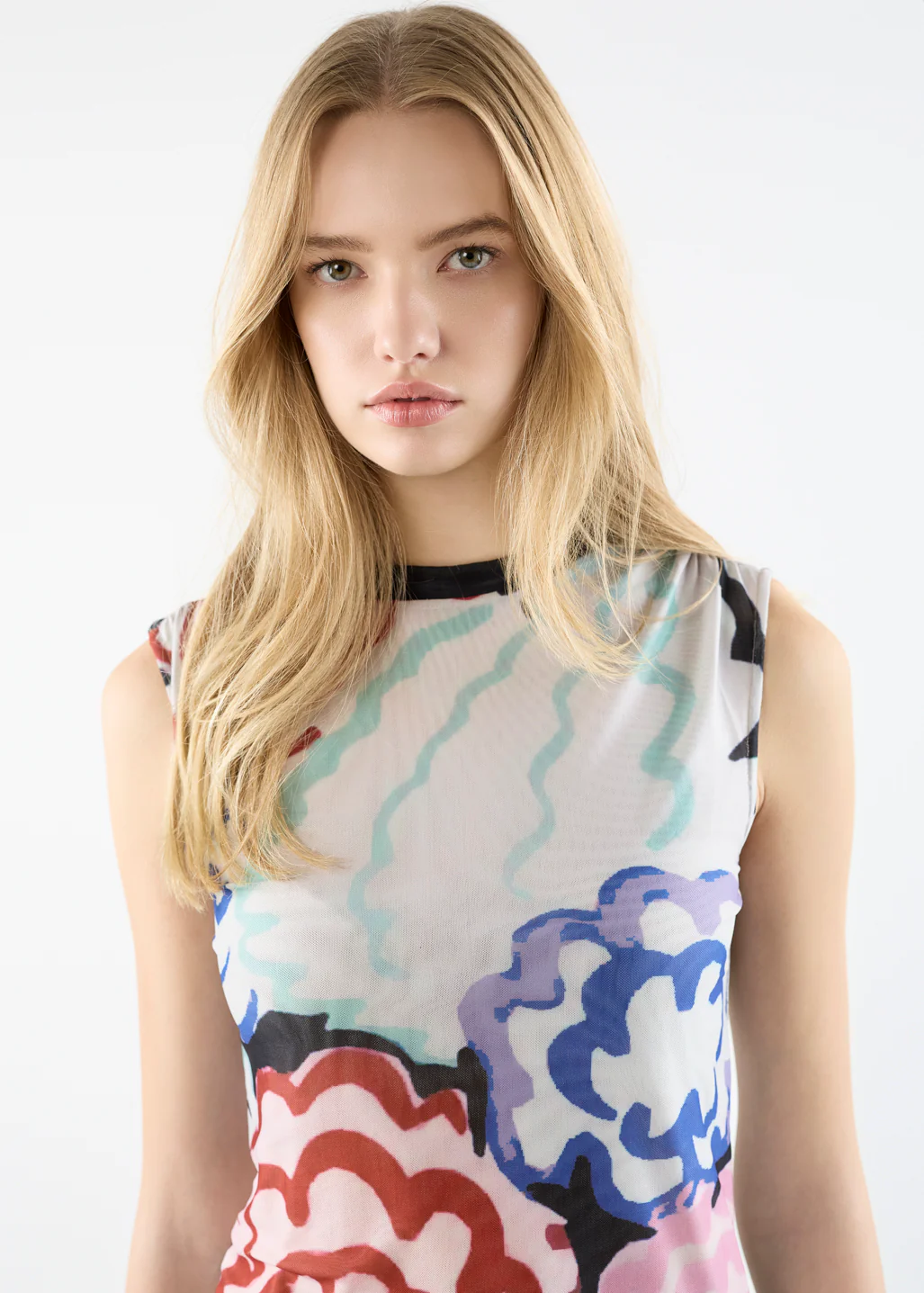 Ce haut sans manches joue la transparence avec son tissu léger et son imprimé floral éclatant. Son col contrasté encadre délicatement le décolleté pour une finition subtile et élégante.