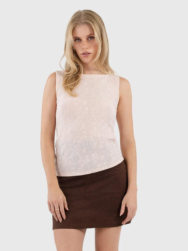 Haut à col rond, coupe droite et bords finis simples. Confectionné en mèche légère avec impression florale en relief.