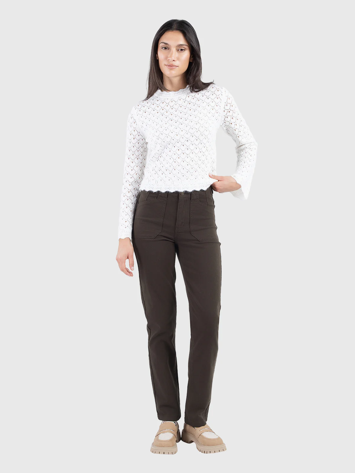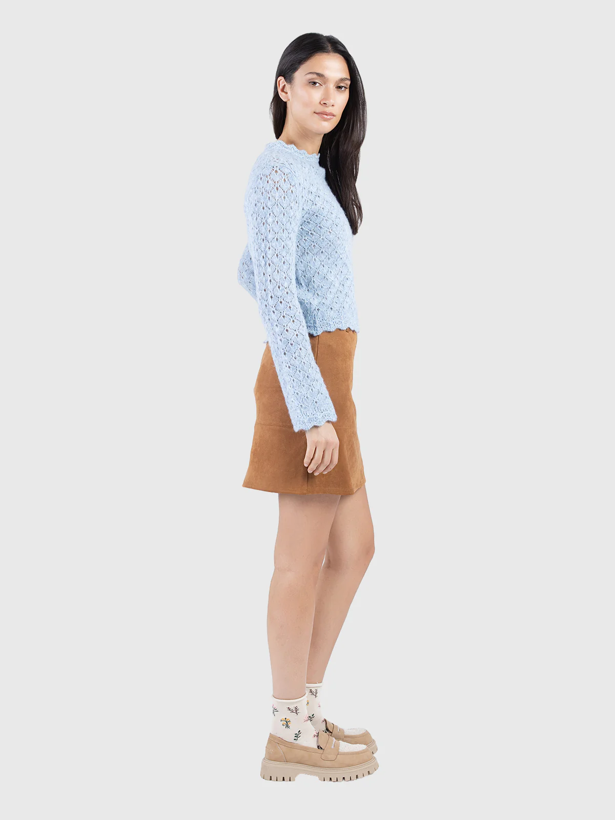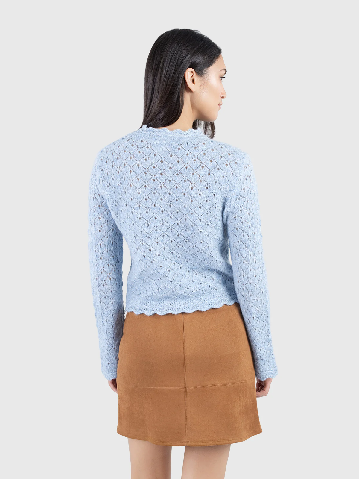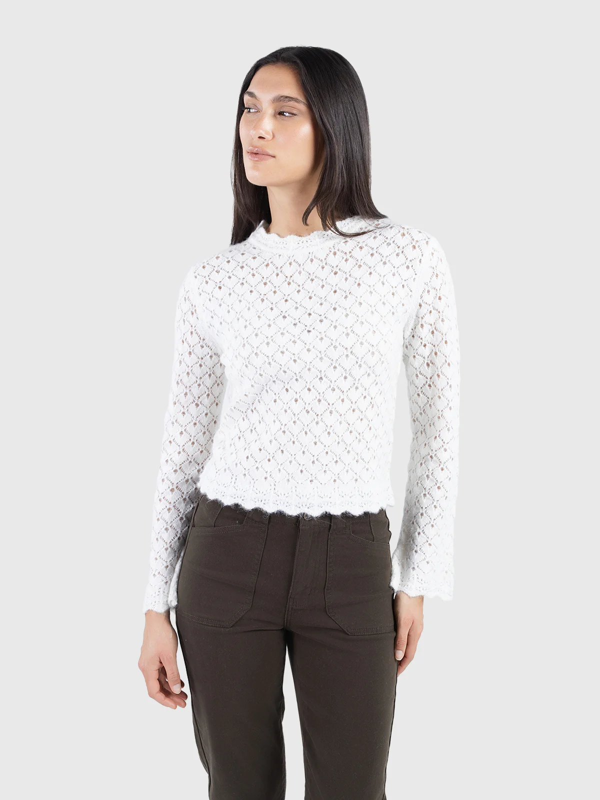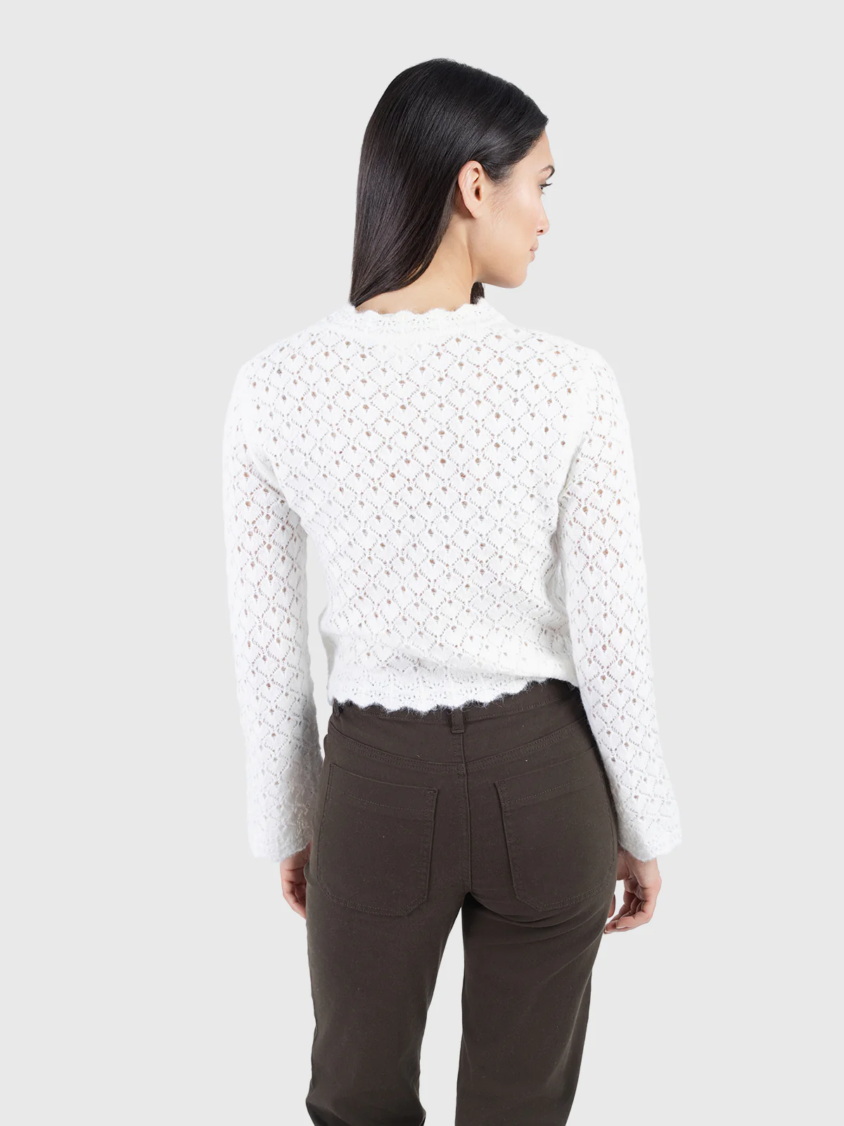 Pull en tricot ajouré à manches longues et col rond, avec bordure festonnée au col, à la base et aux poignets. Maille fine à motif géométrique régulier sur l’ensemble du corps.