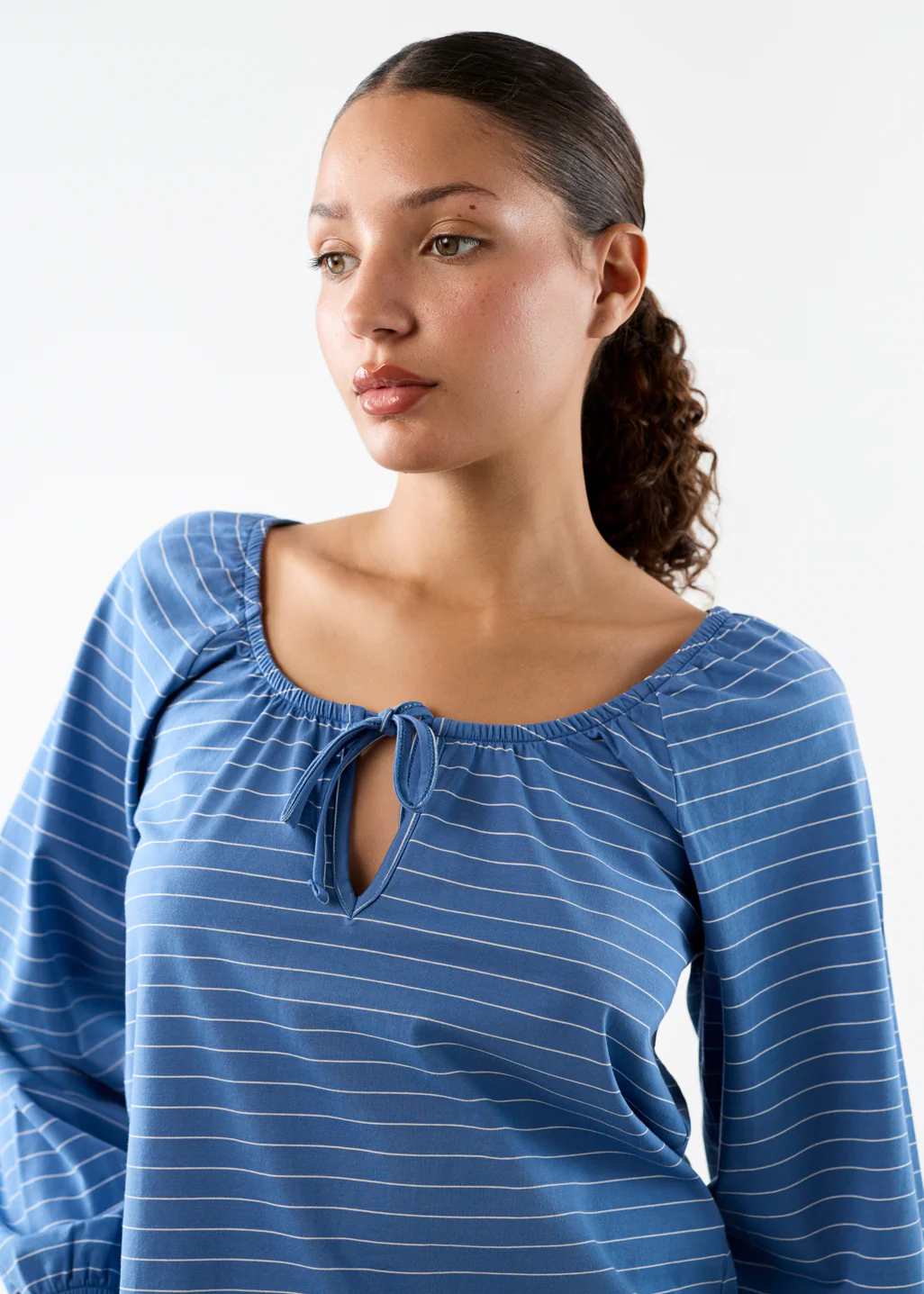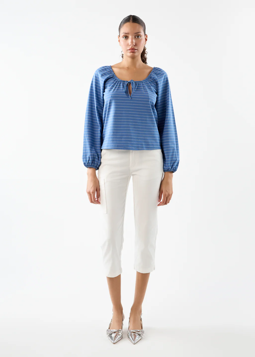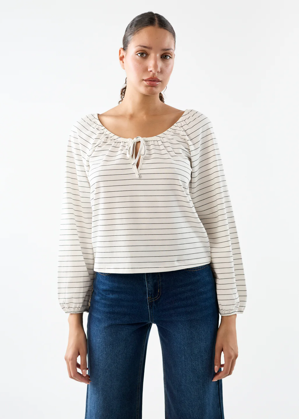 L’encolure froncée se distingue par un détail noué, accentuant le style décontracté du vêtement. Les manches volumineuses équilibrent parfaitement la silhouette fluide.