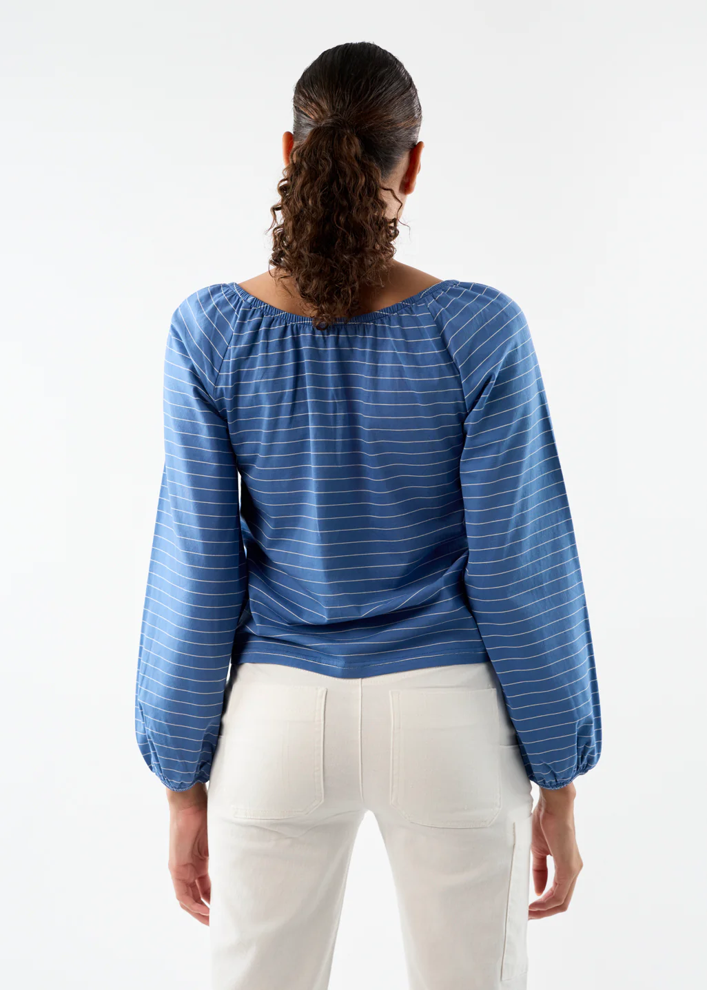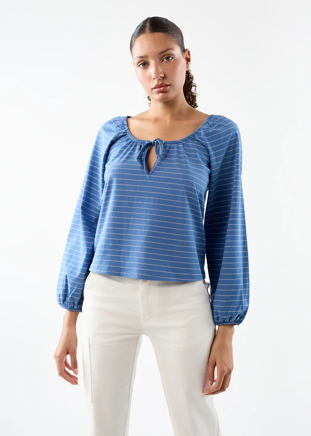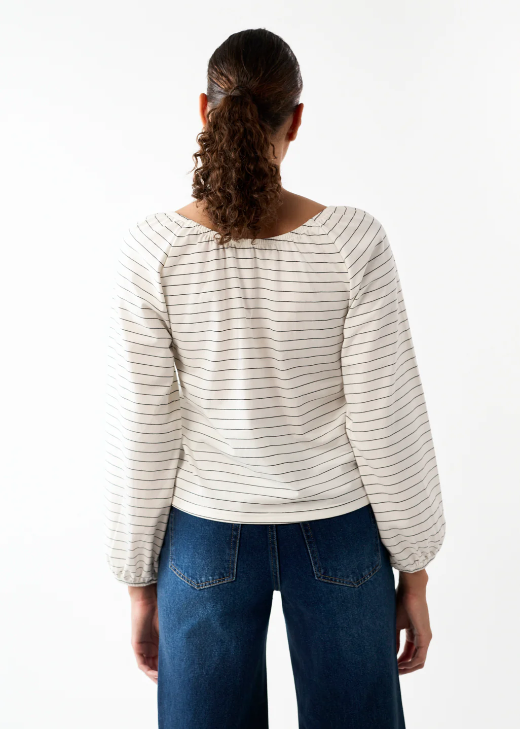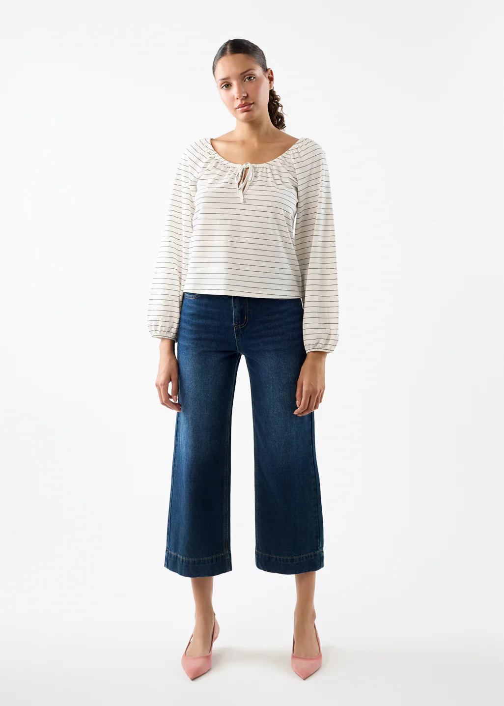 L’encolure froncée se distingue par un détail noué, accentuant le style décontracté du vêtement. Les manches volumineuses équilibrent parfaitement la silhouette fluide.