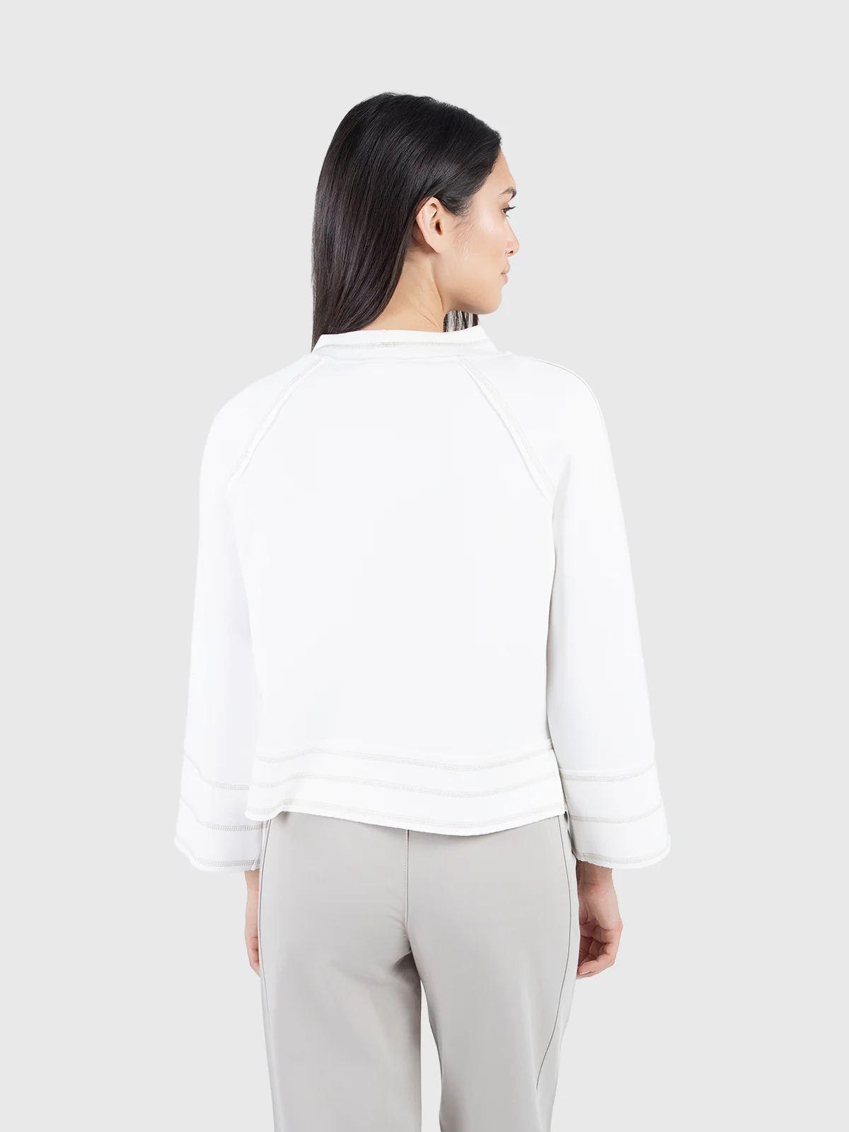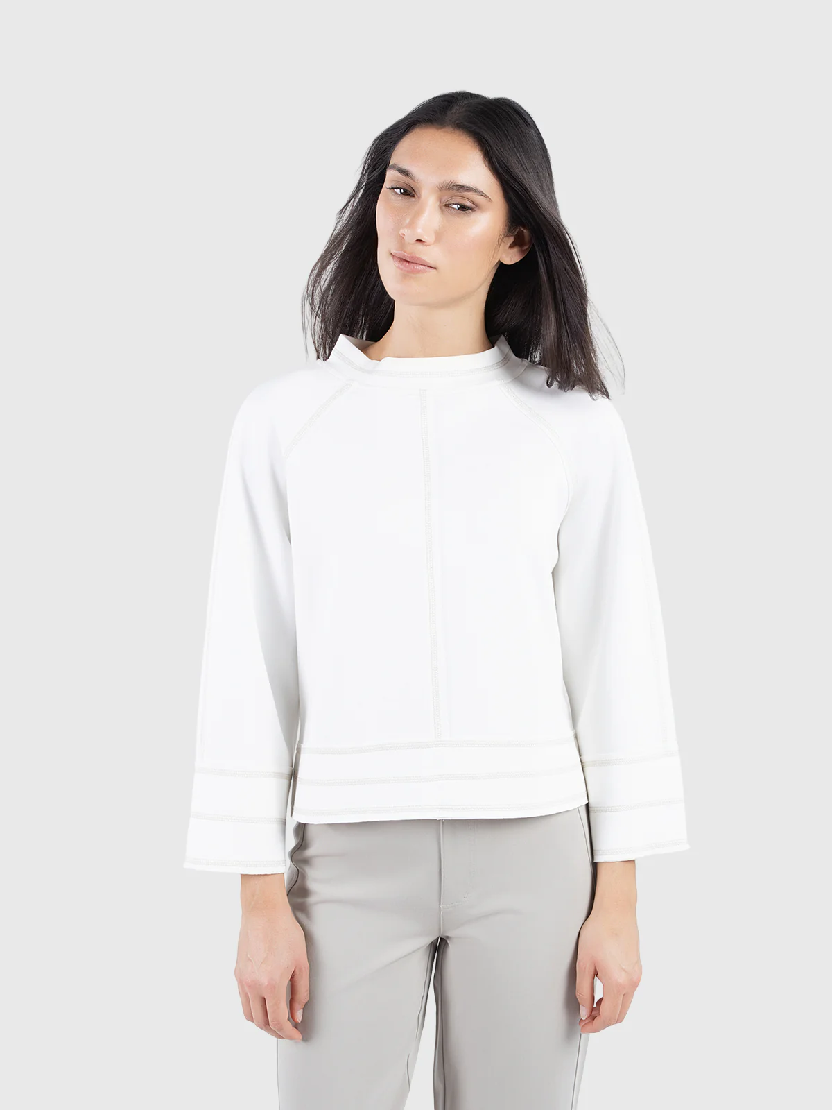 Modèle à col montant structuré et manches longues amples à emmanchures raglan. Le bas des manches et du vêtement est souligné par deux lignes de surpiqûres contrastantes.