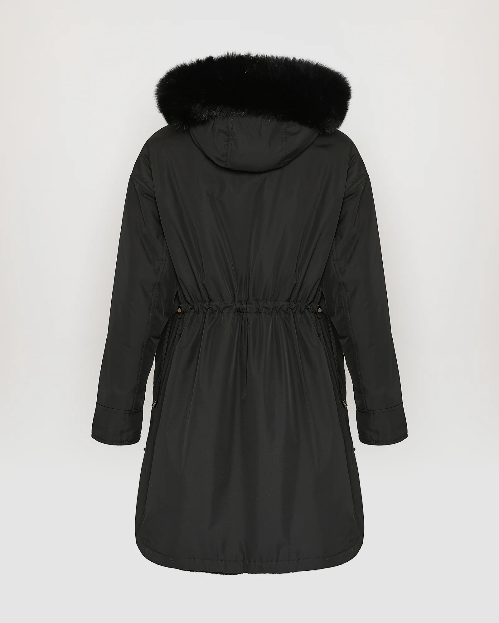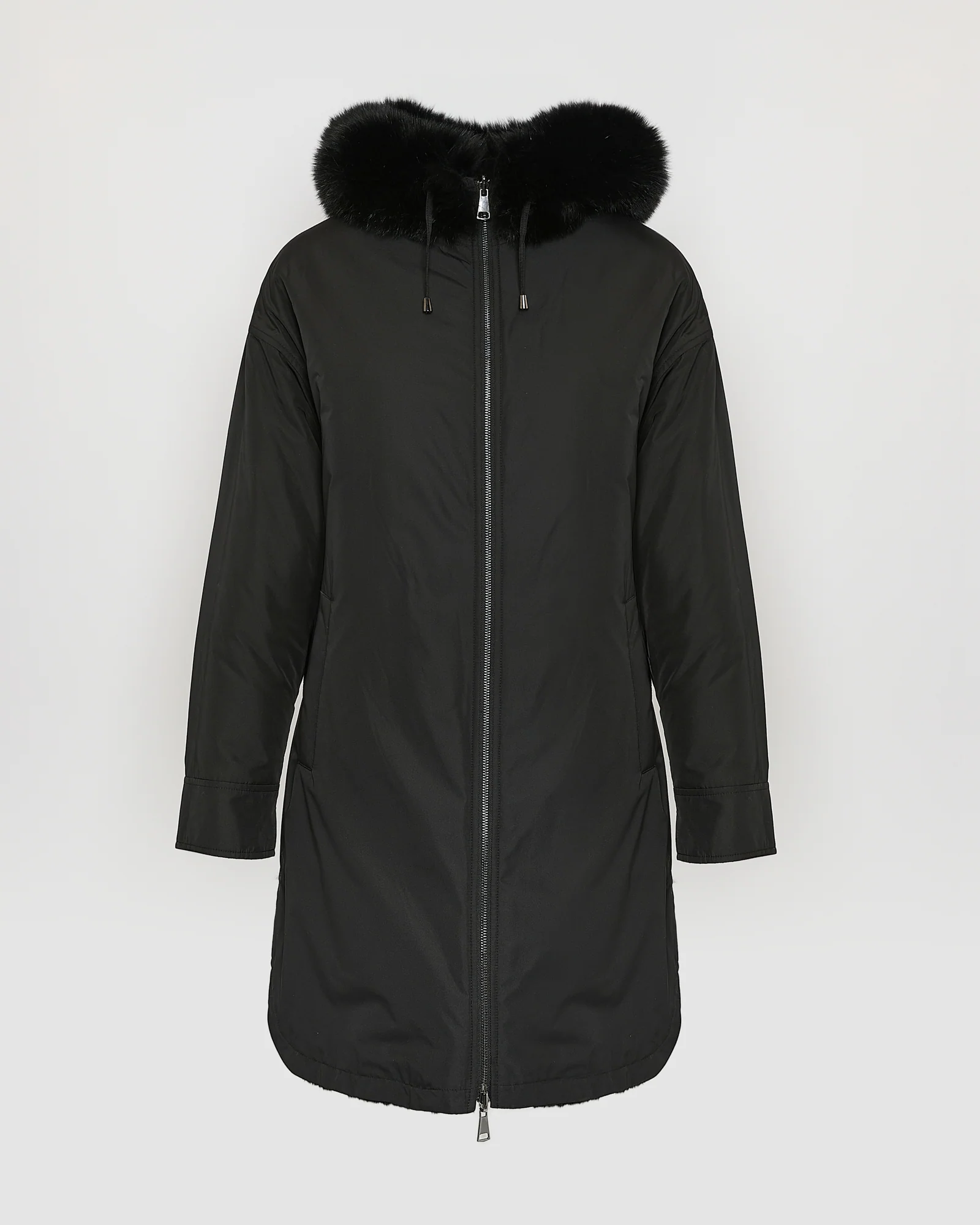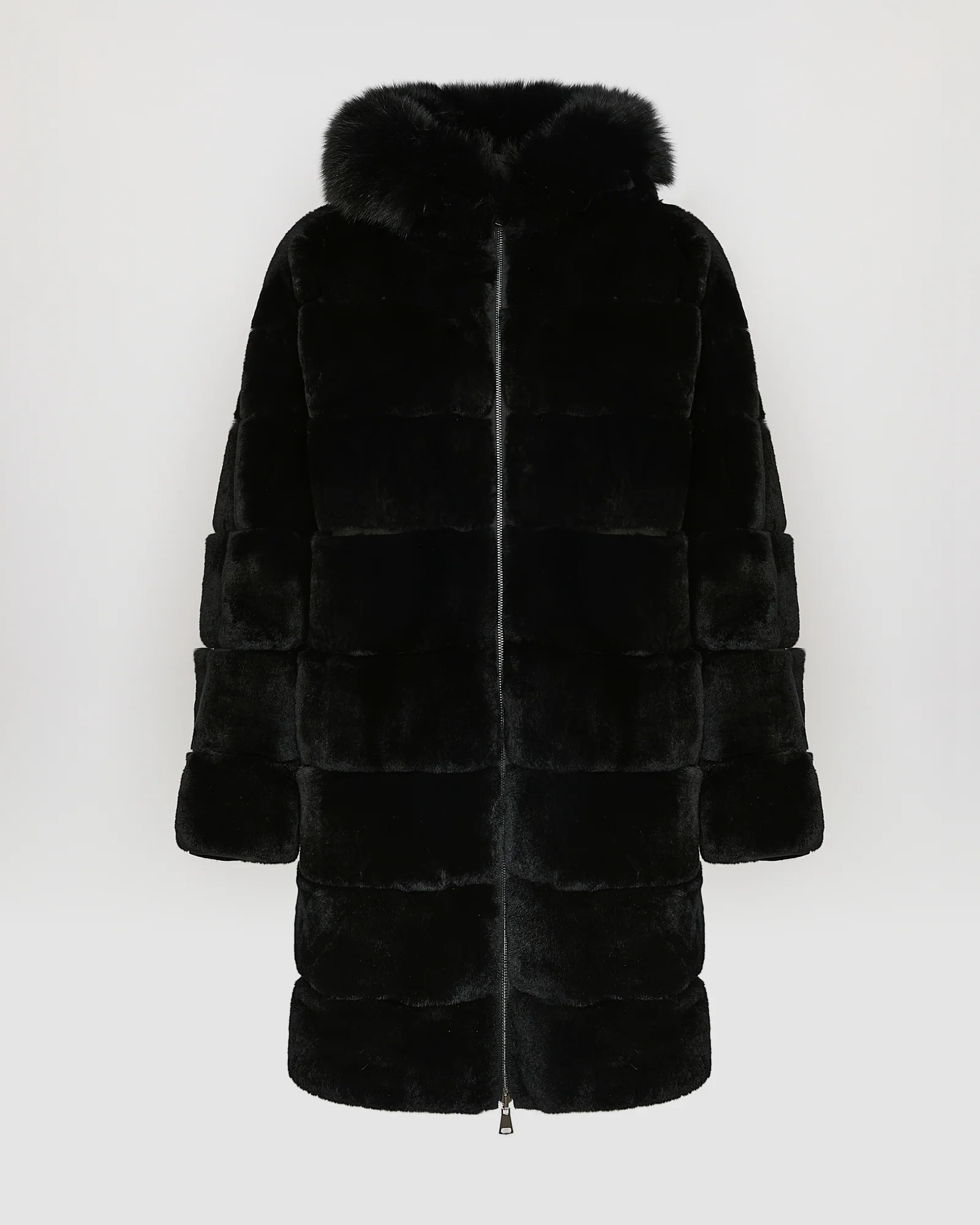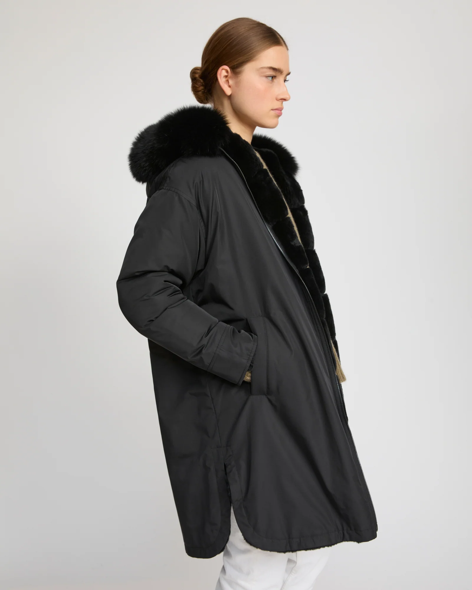 A long parka which plays on textural contrasts, with a face in smooth technical fabric, and a soft face in thick, soft rex rabbit fur, worked in strips. A hood trim in longer-haired fox fur is evident on both faces. This versatile, chic coat combines elegance and functionality.