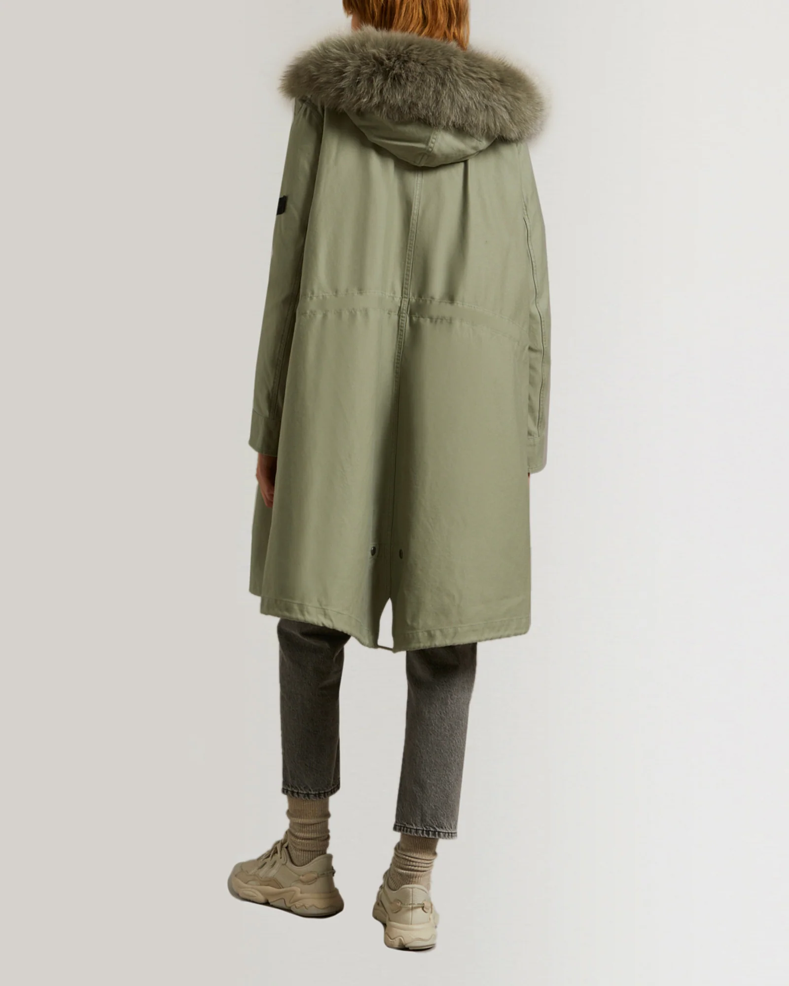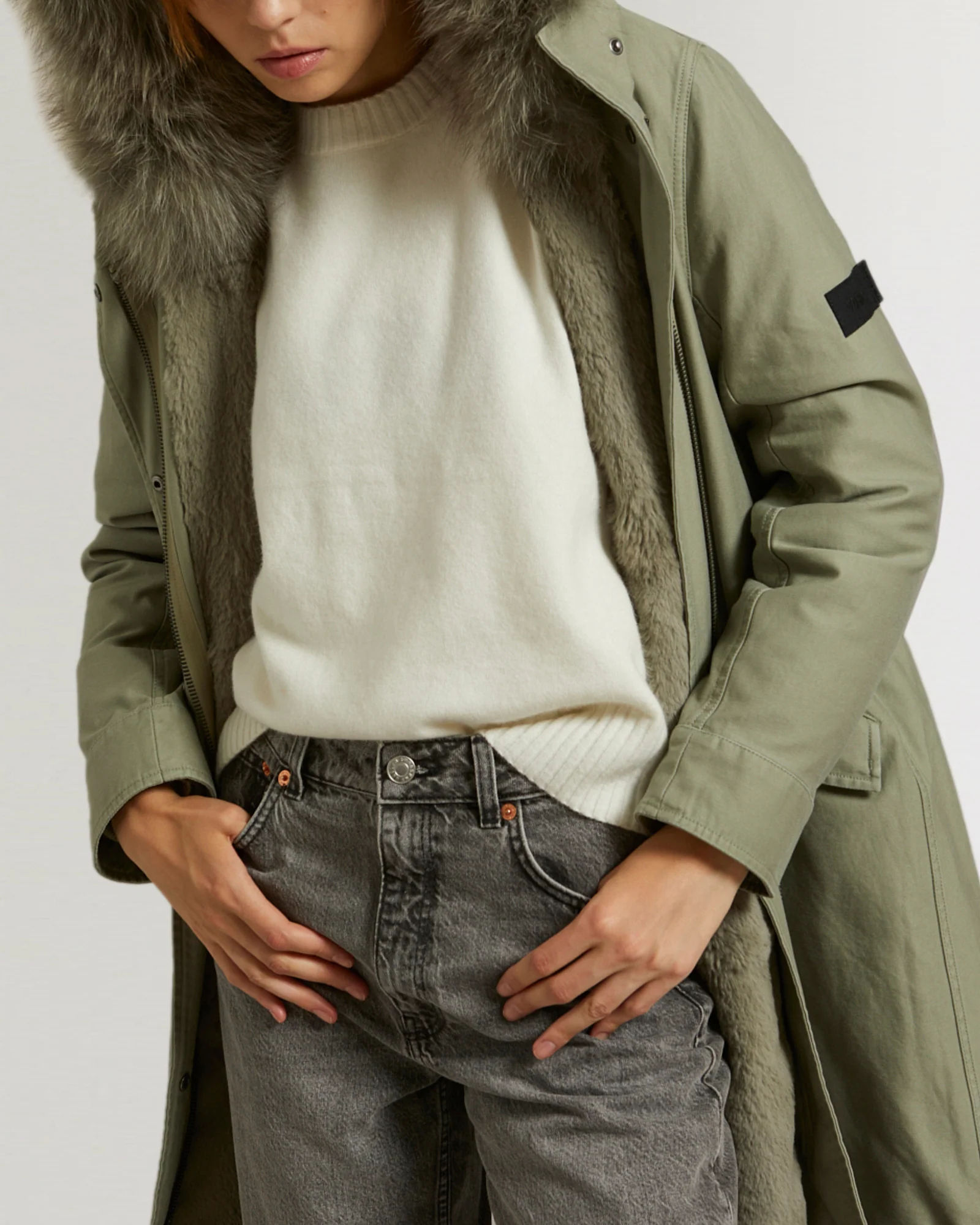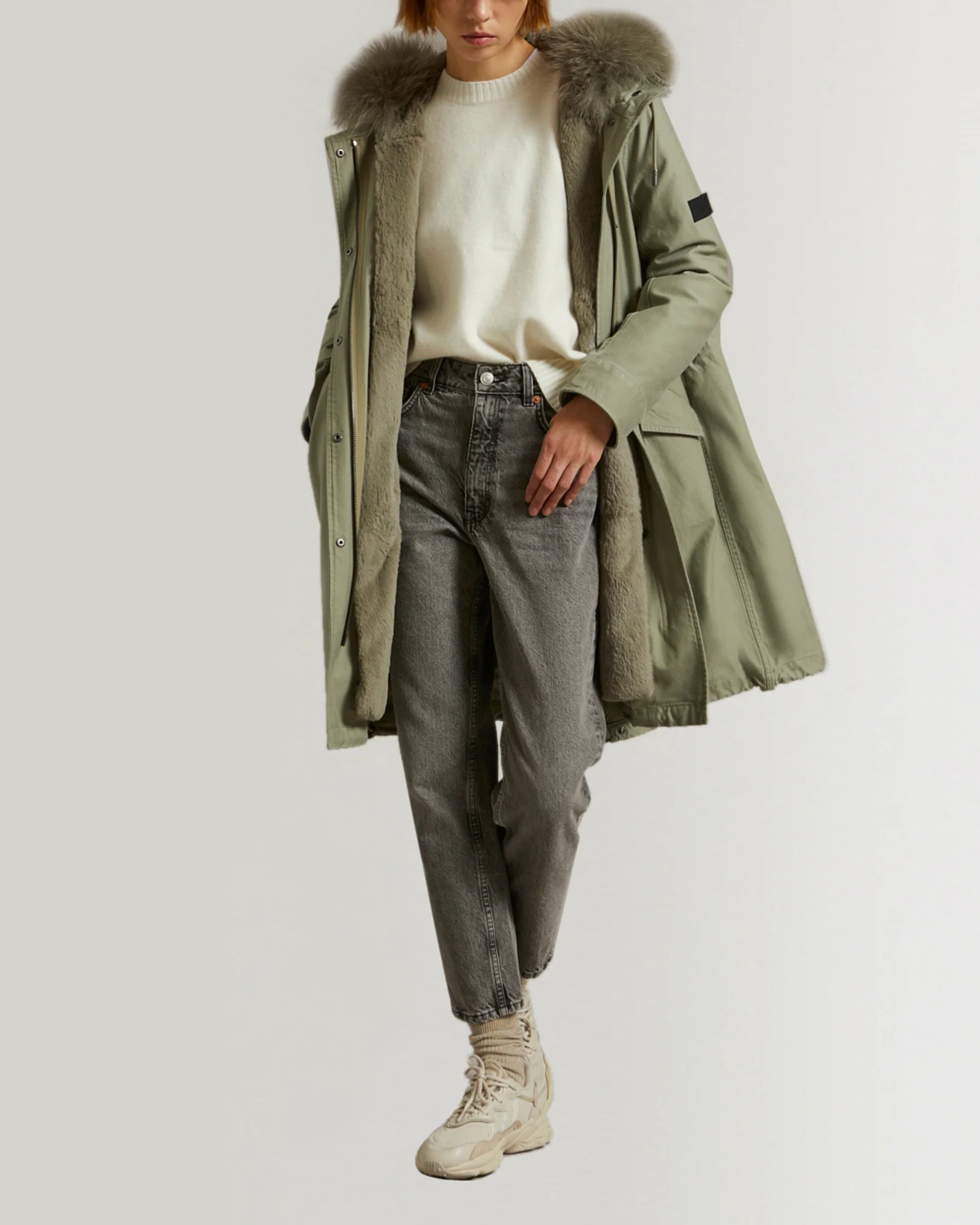 Long cotton jacket with rabbit and fox fur – Flared cut– Removable hood trim in fox fur– Tightening ties at bottom, at hood and waist in back– Button and zip closure– Two flap pockets with invisible press studs– Inside pocket with press stud– Fishtail finish in back– Removable lining in rabbit fur featuring padded sleeves […]