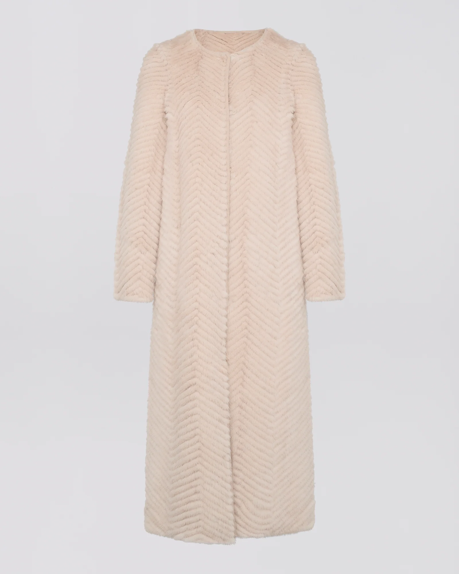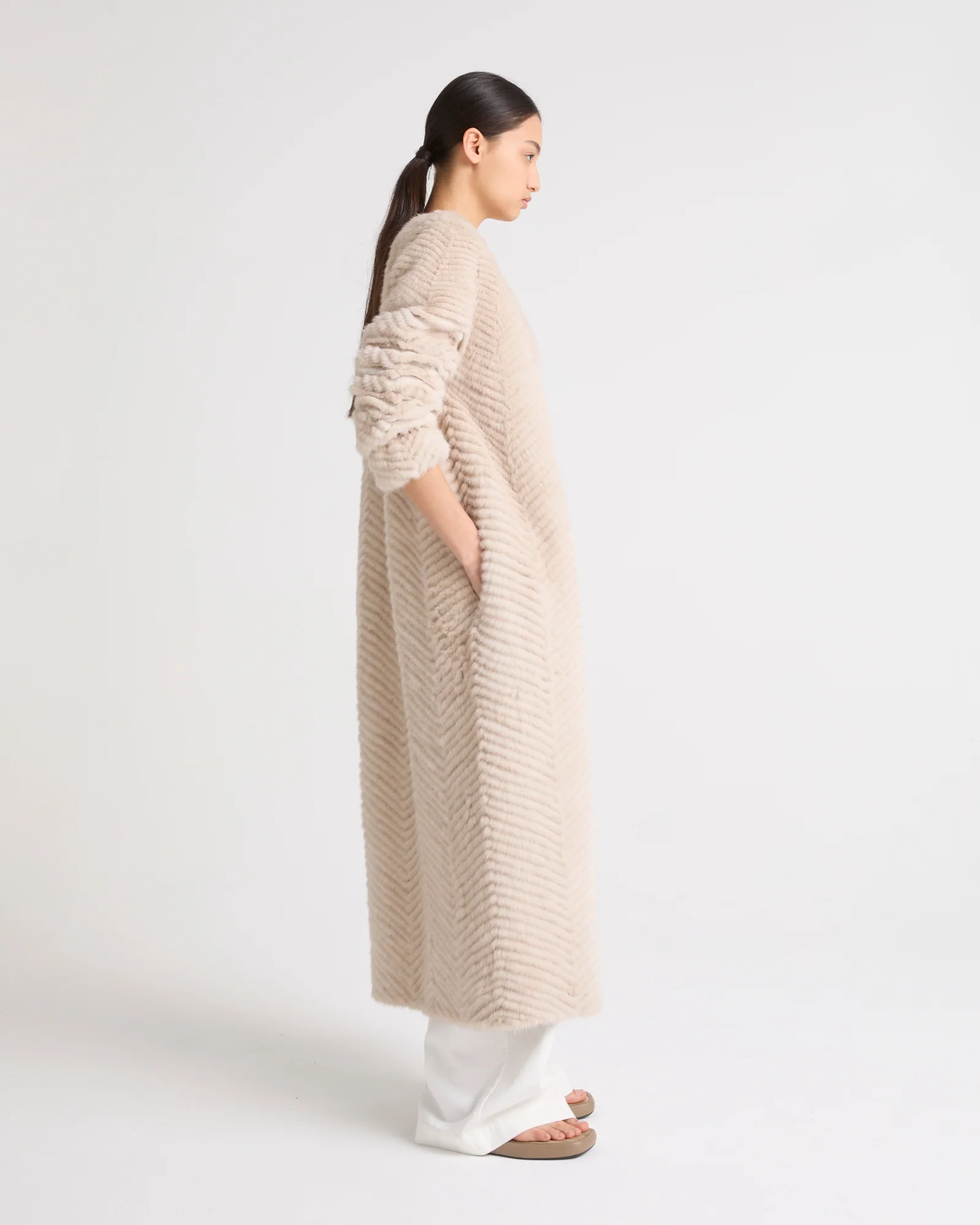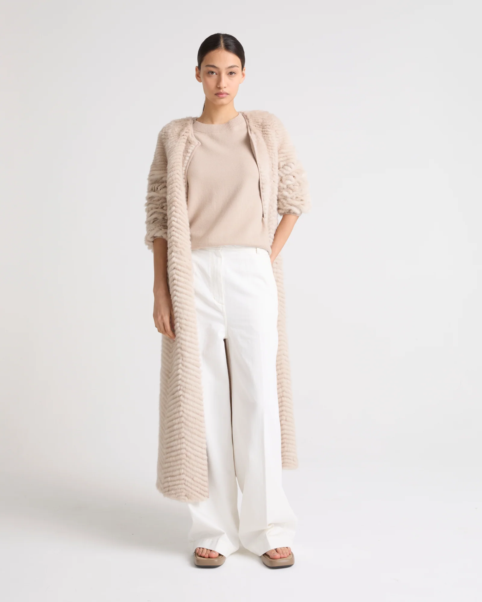 The savoir-faire of the Yves Salomon house at its finest, showcased in this luxurious long coat with « galonné » mink strips worked on merino knit. Its ankle length can be worn over any summer silhouette. – Yves Salomon Collection – Ankle length– Round collar– Length 120 cm