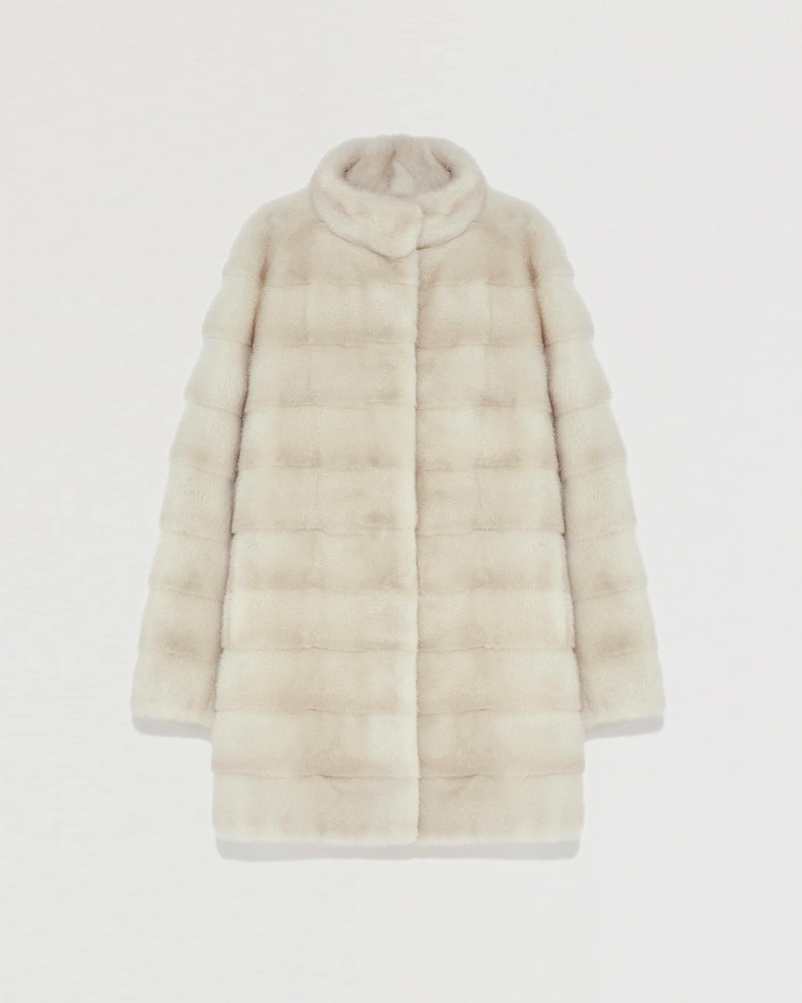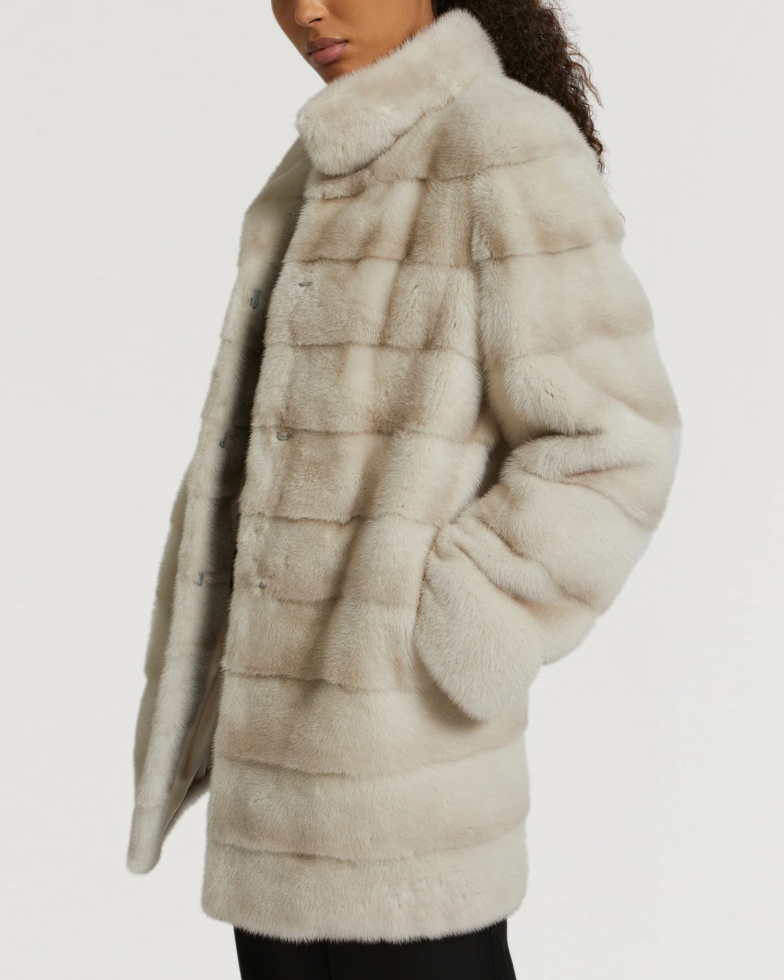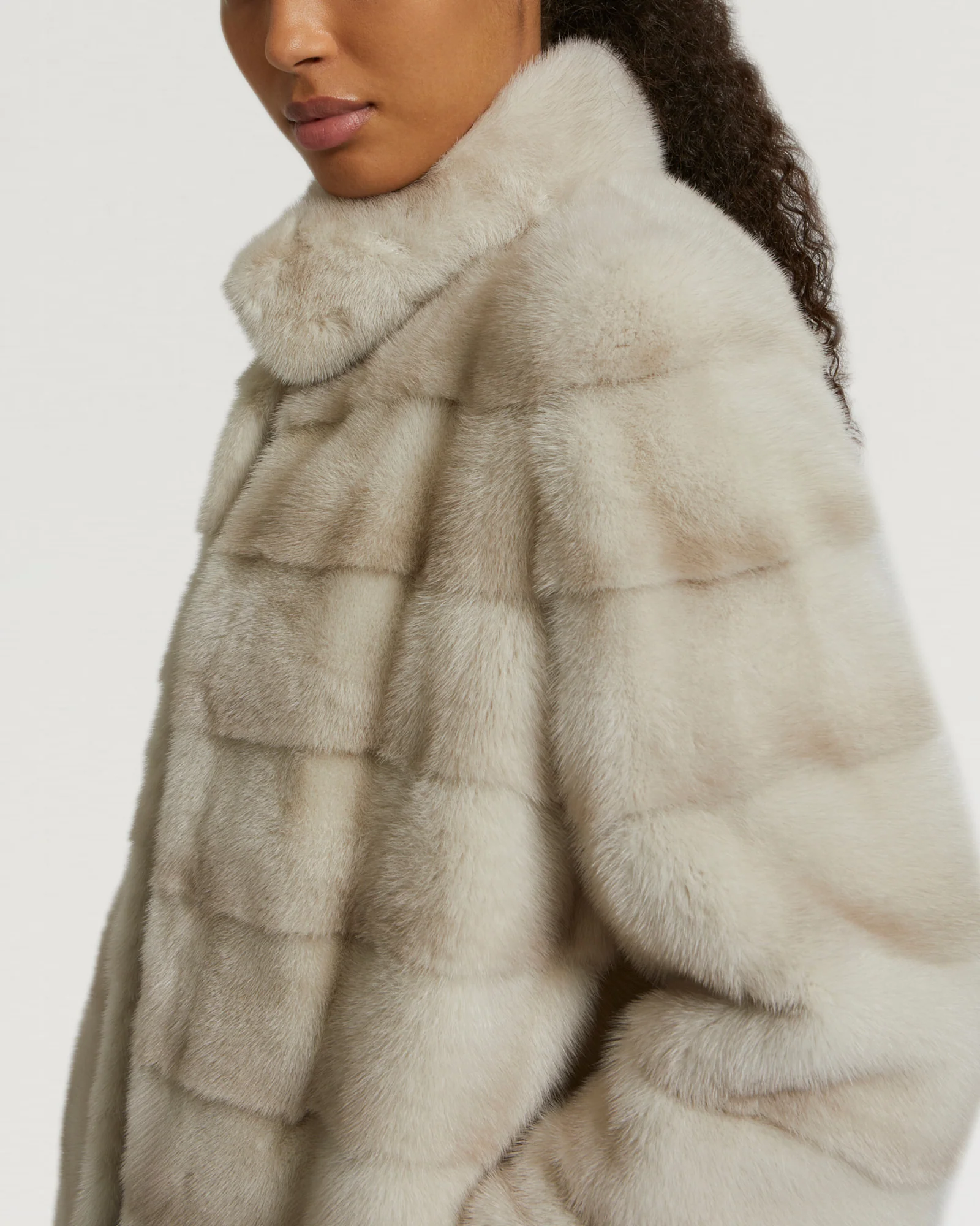 The hip length and cocoon shape of this long jacket showcase the mink work, with large stripes creating an elegant visual effect across the body. A collar frames the face