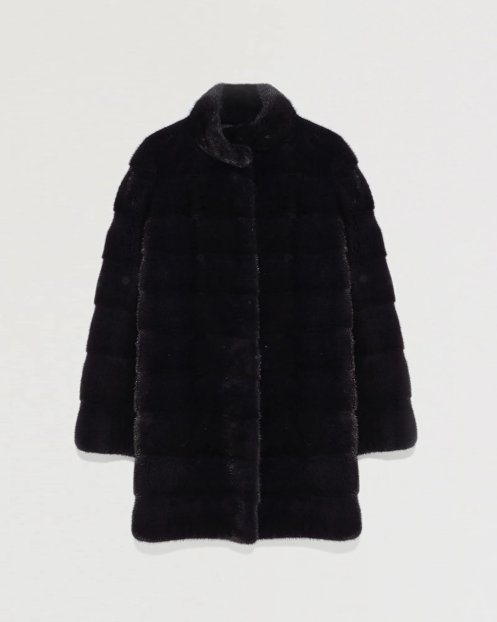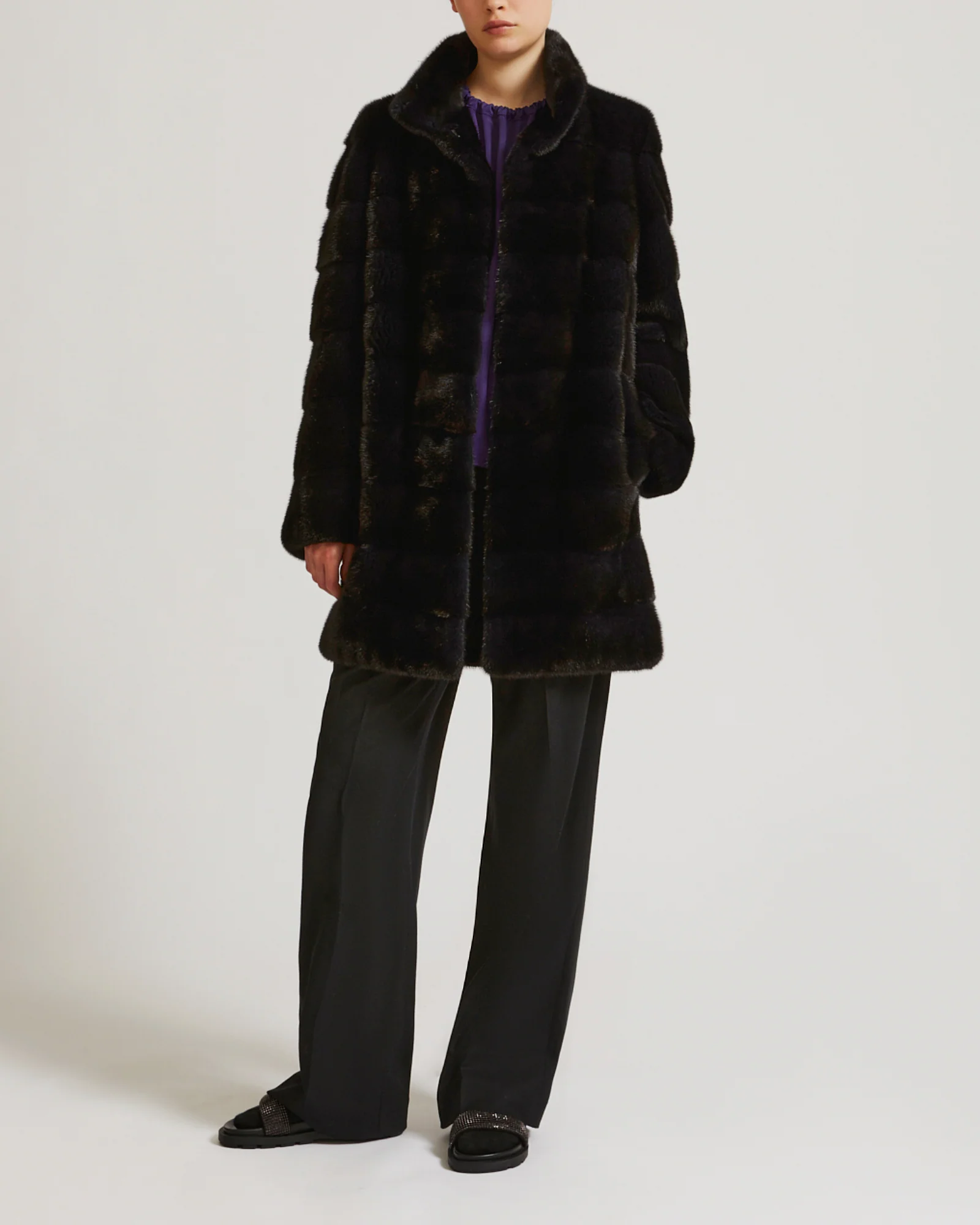 The hip length and cocoon shape of this long jacket showcase the mink work, with large stripes creating an elegant visual effect across the body. A collar frames the face