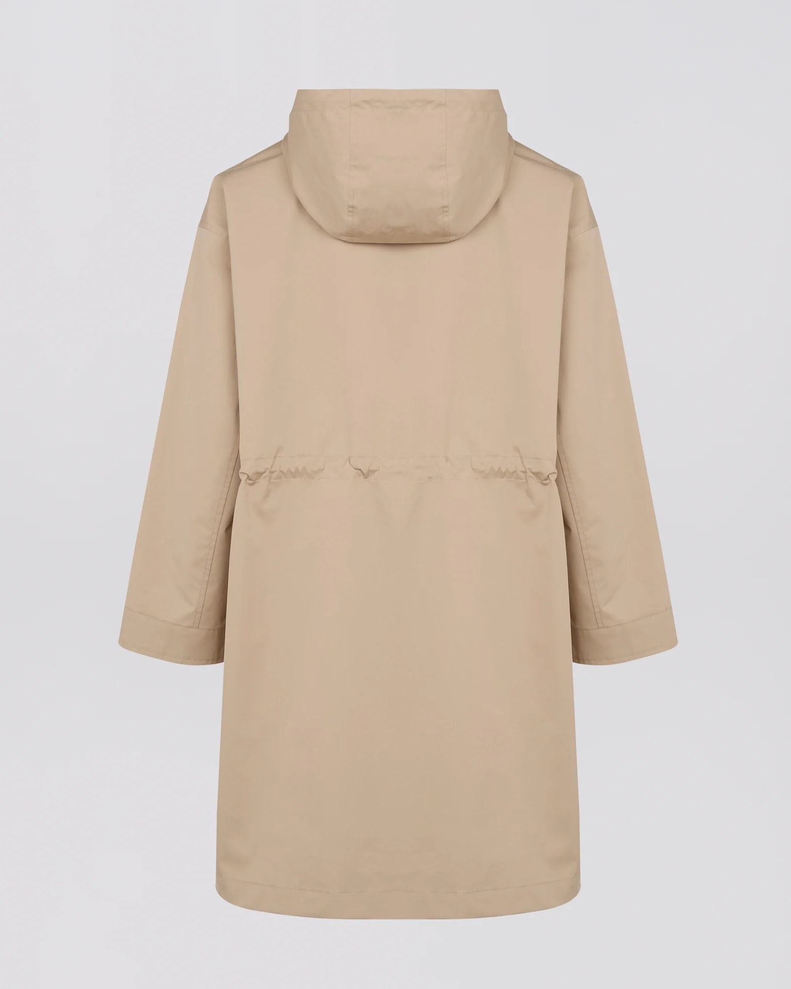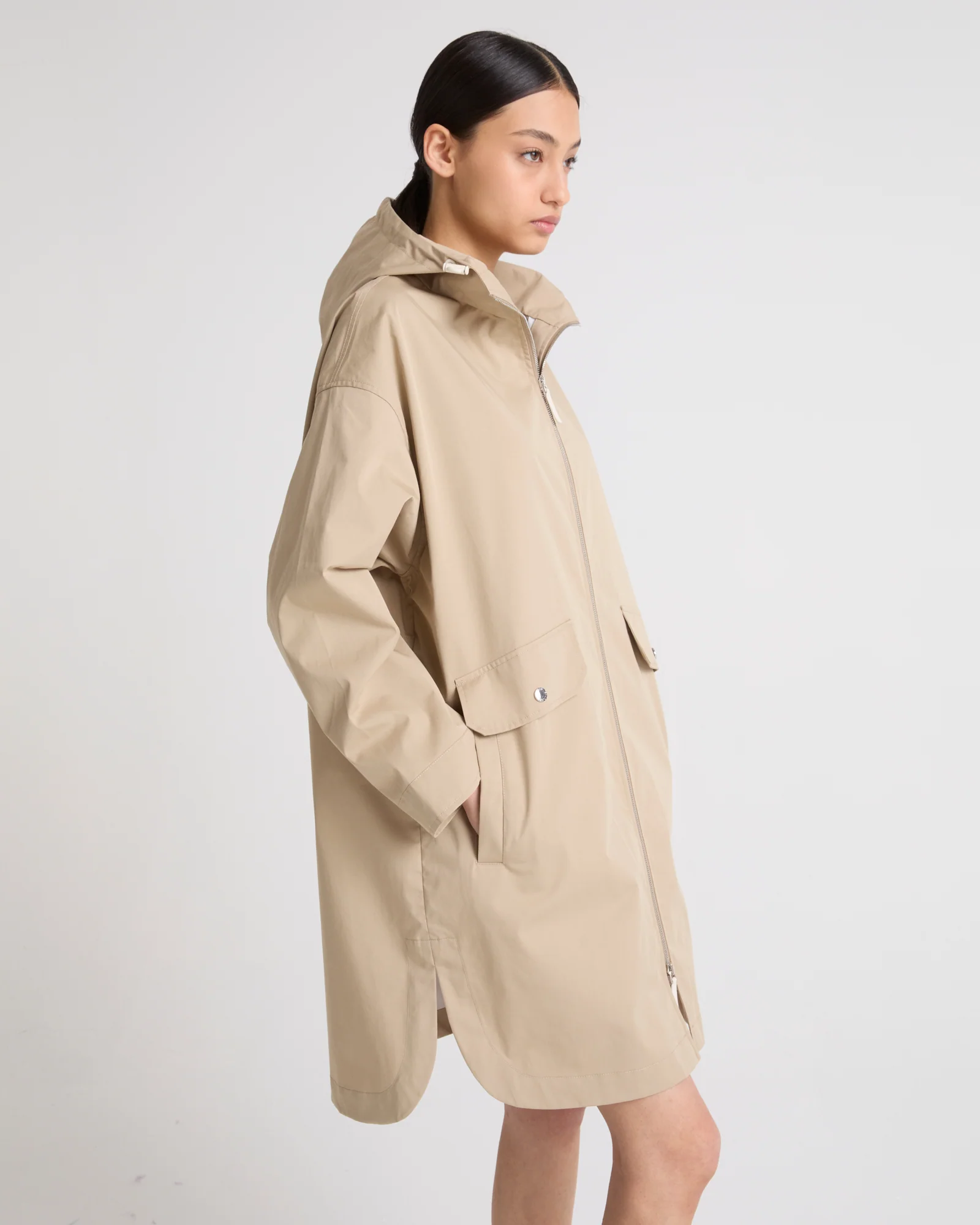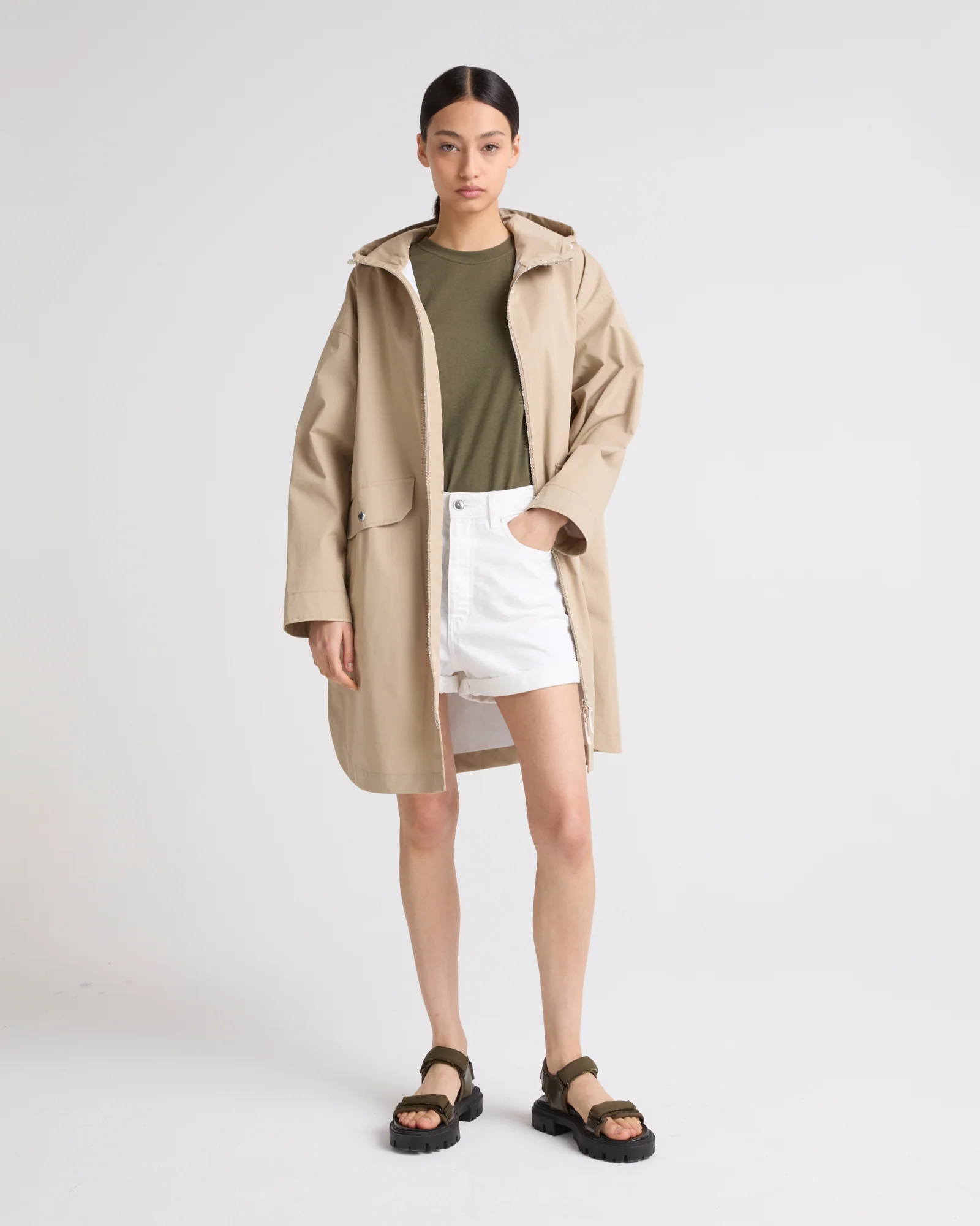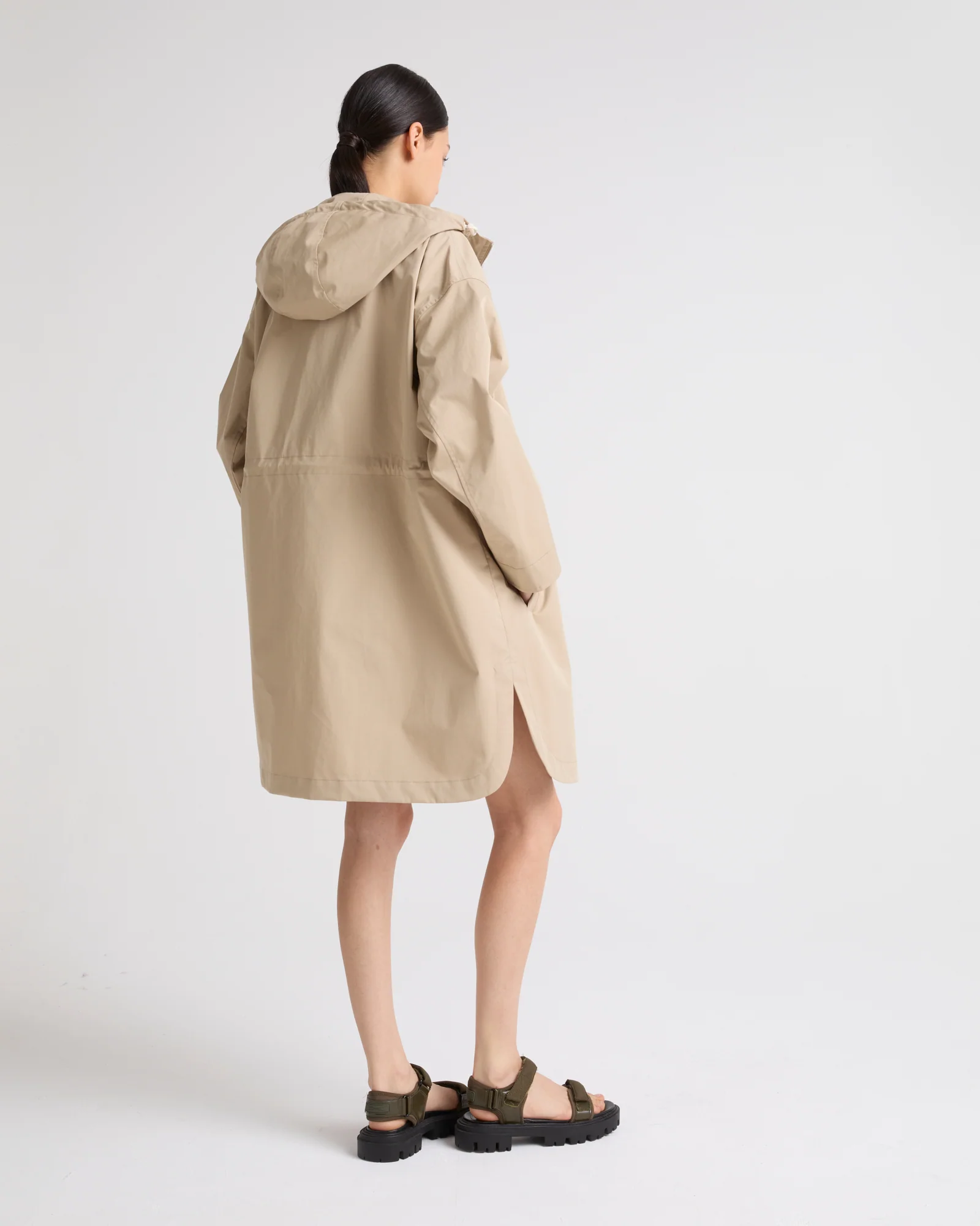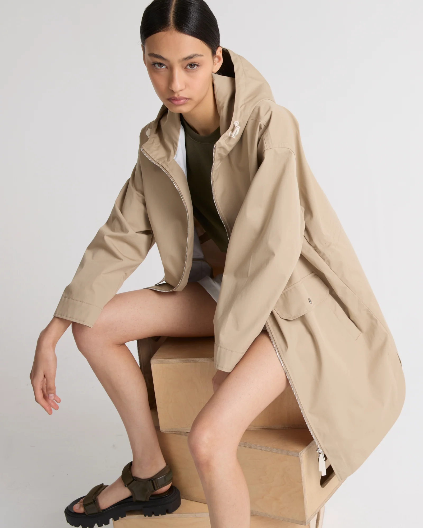 The shape of a classic parka worked in a light technical fabric with cotton for a fresh, crisp summer feel. Large pockets add a practical element, as does the drawstring hood.