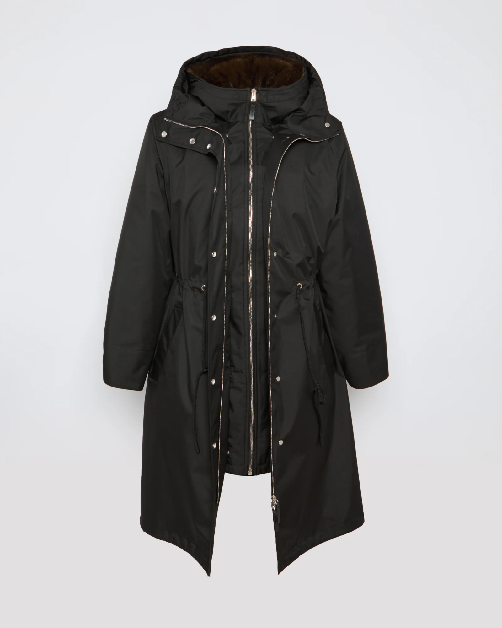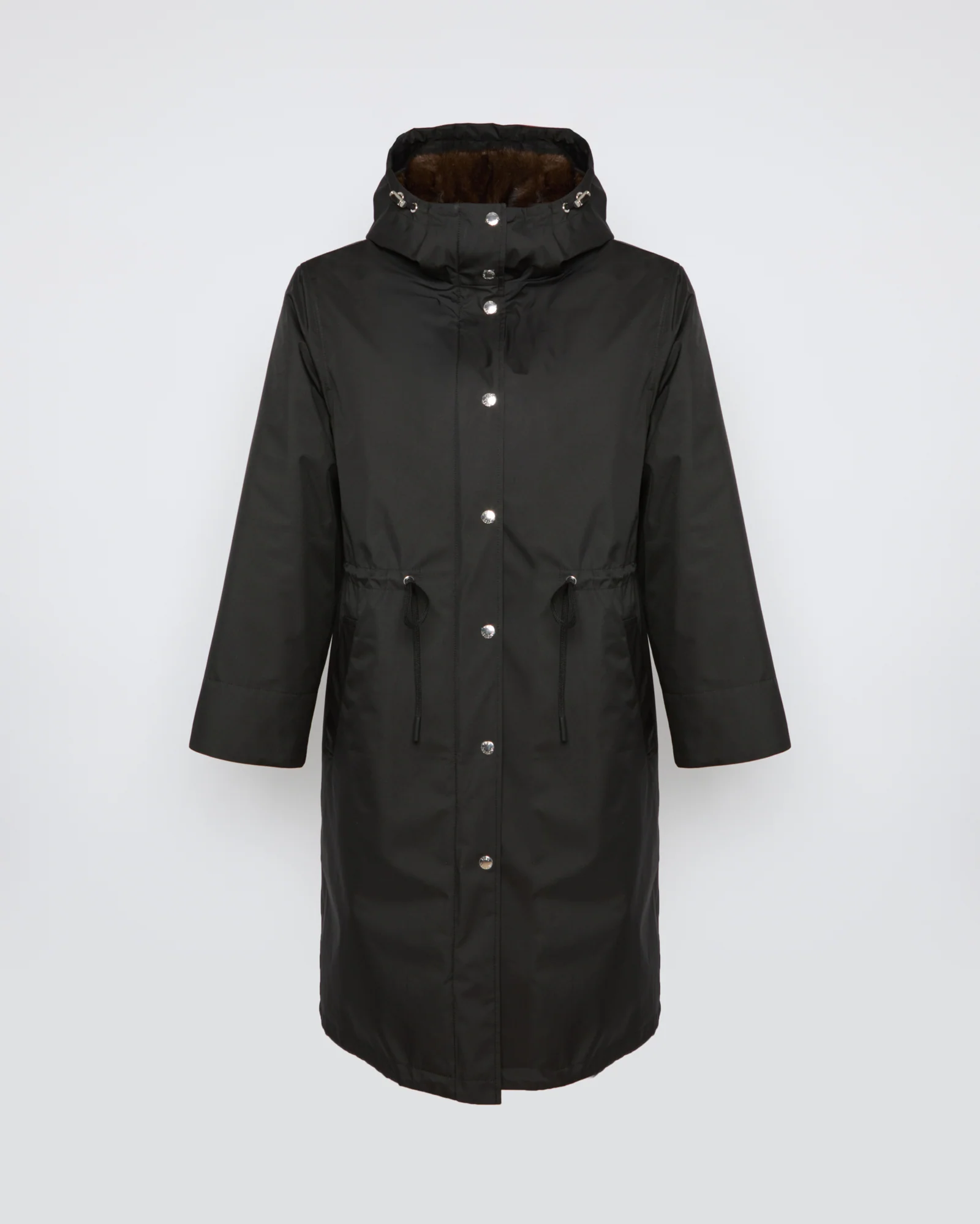 The pared-down lines of this long parka hide a number of intelligent details, combining elegance and functionality. A removable lining in mink fur offers protection and luxuriousness. The graphene membrane of the fabric allows increased resistance against wind and rain, while the high quality down provides extra warmth, guaranteed by inner wrist cuffs. A chic and versatile coat suited to all occasions and conditions.