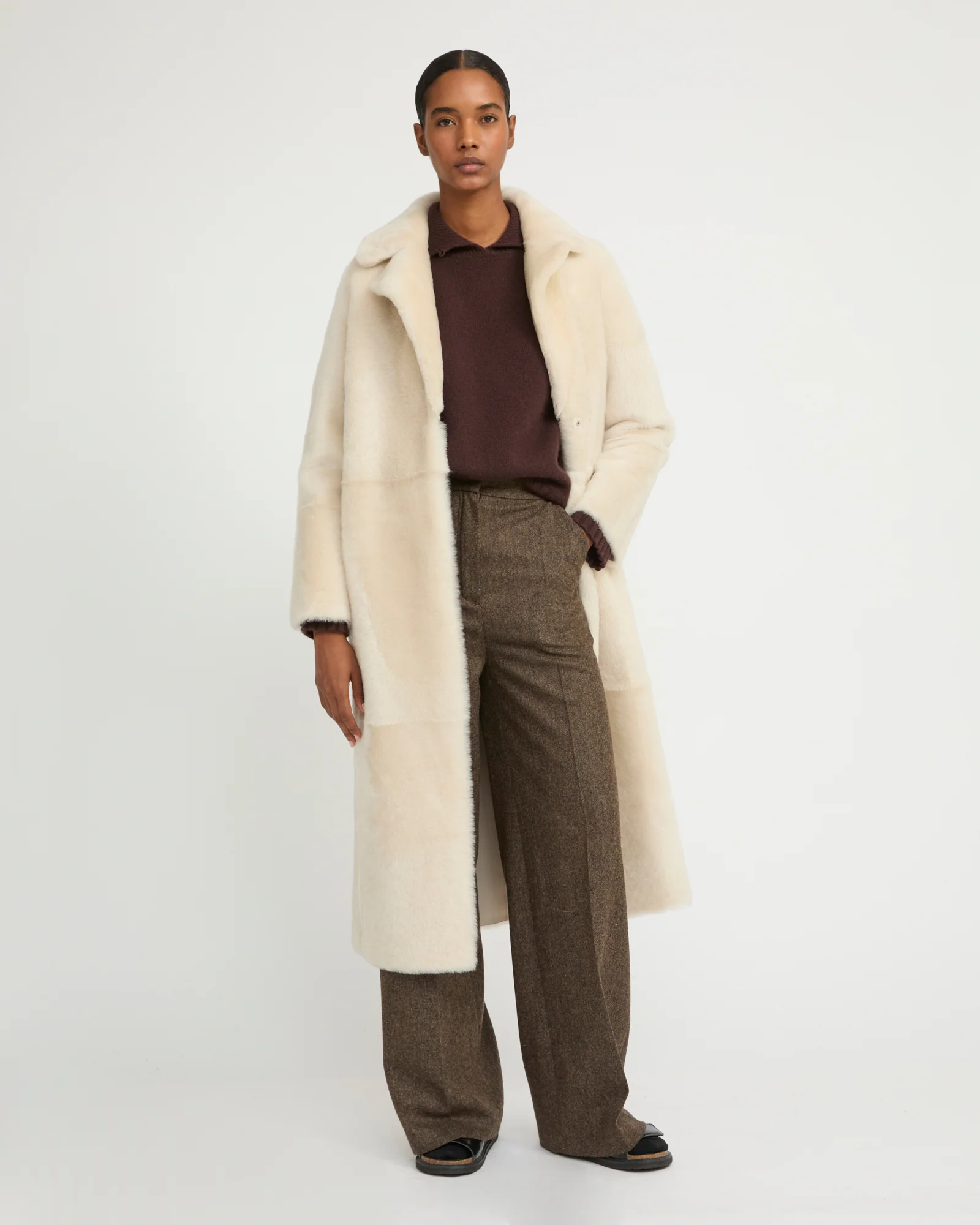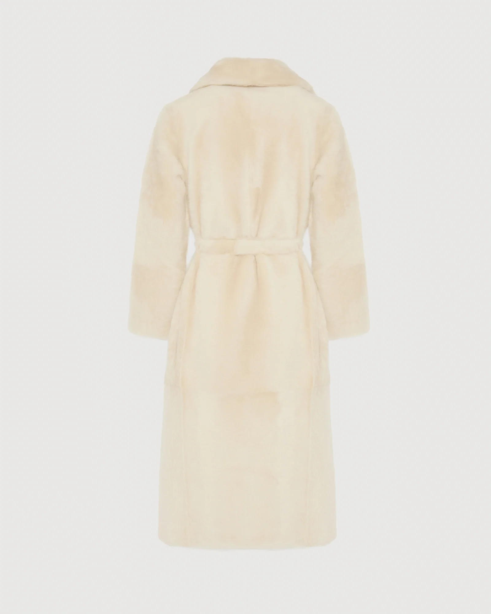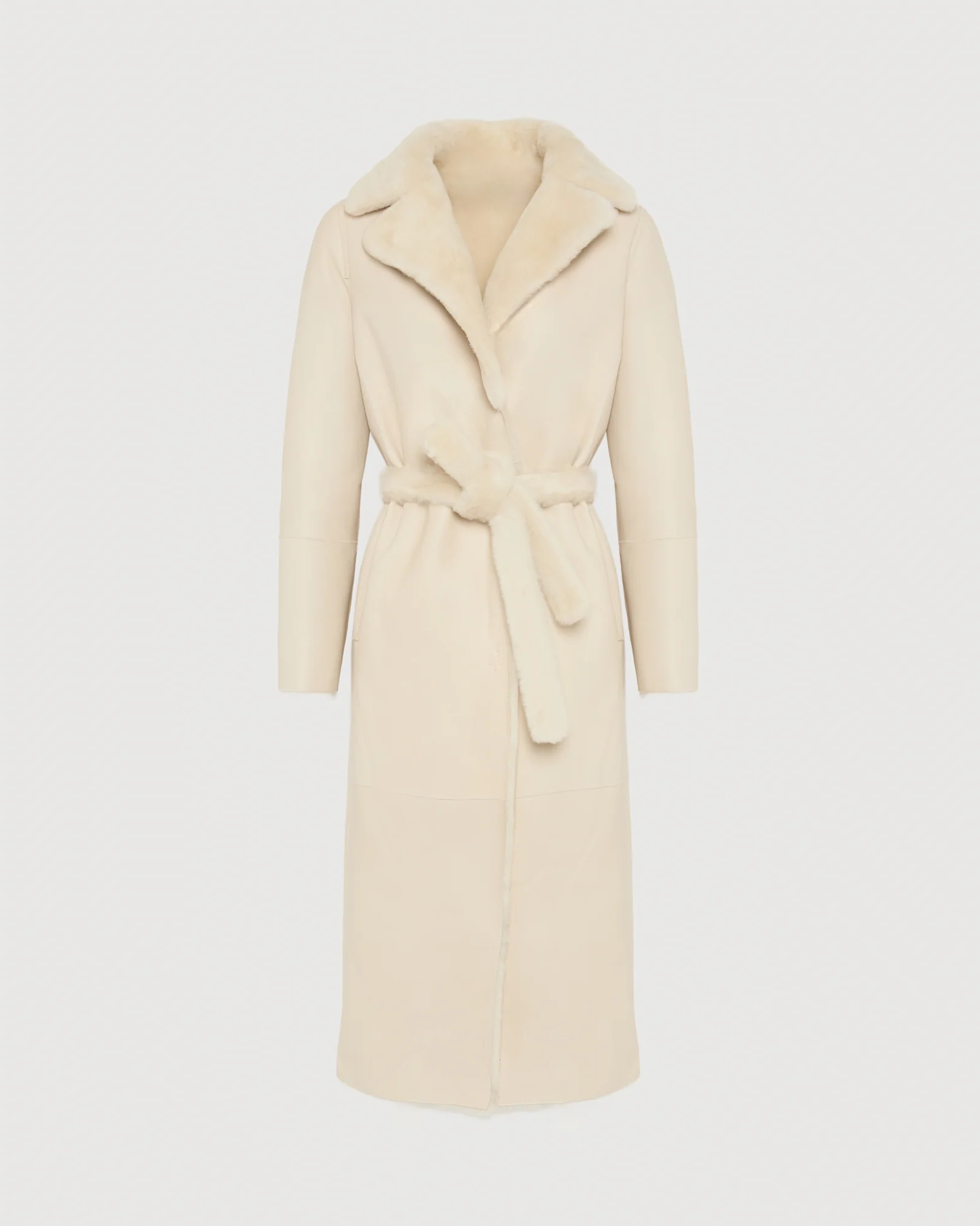 Long reversible coat featuring a masculine-feminine look. Crafted from unlined shearling, the leather on the other side is smooth and fine. Warm and enveloping, it remains supple and easy to wear. Design details include a tailored collar, a straight cut and two slit pockets for a pared back silhouette. The press-stud fastening adds a functional aspect, while the waistband allows the shape to be fitted for a contemporary and feminine touch.