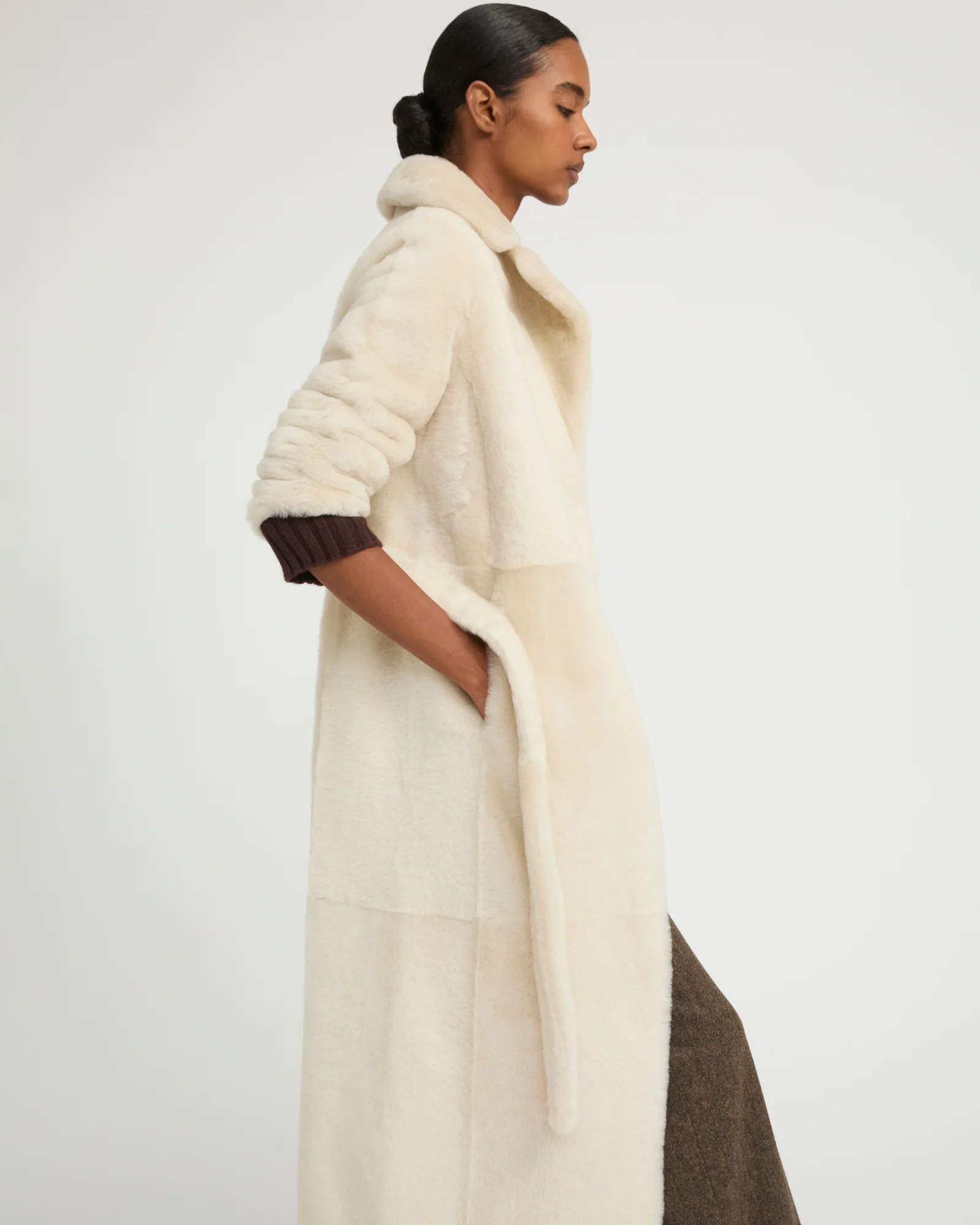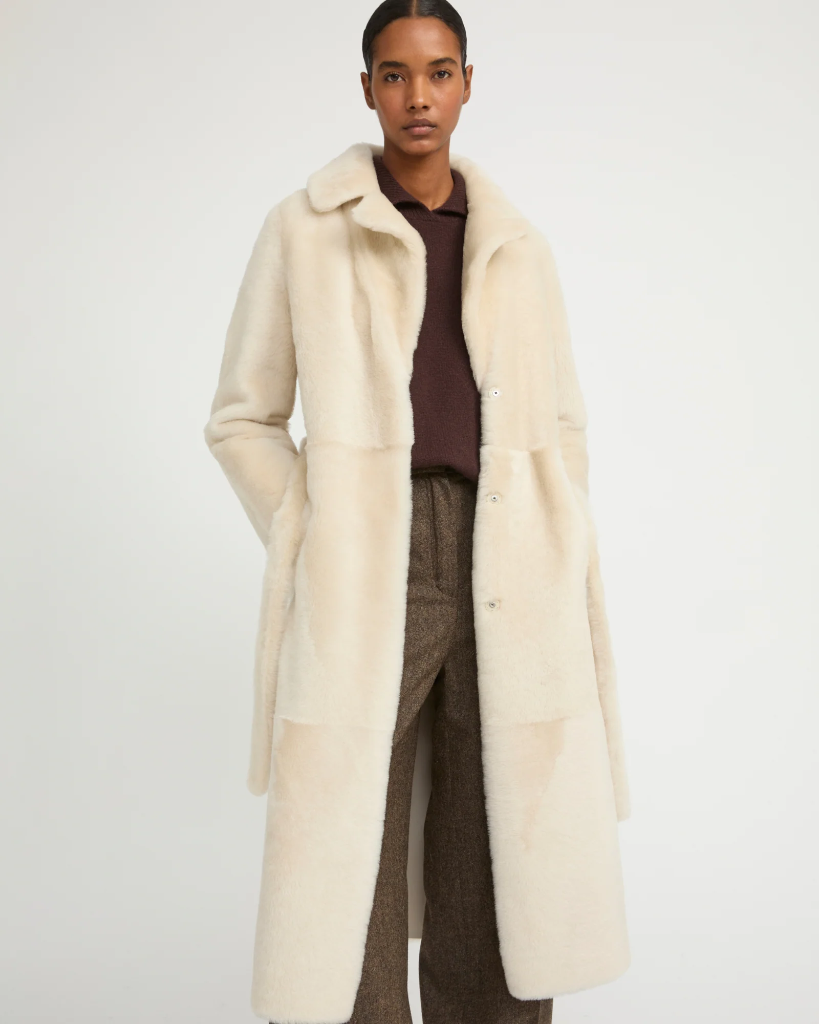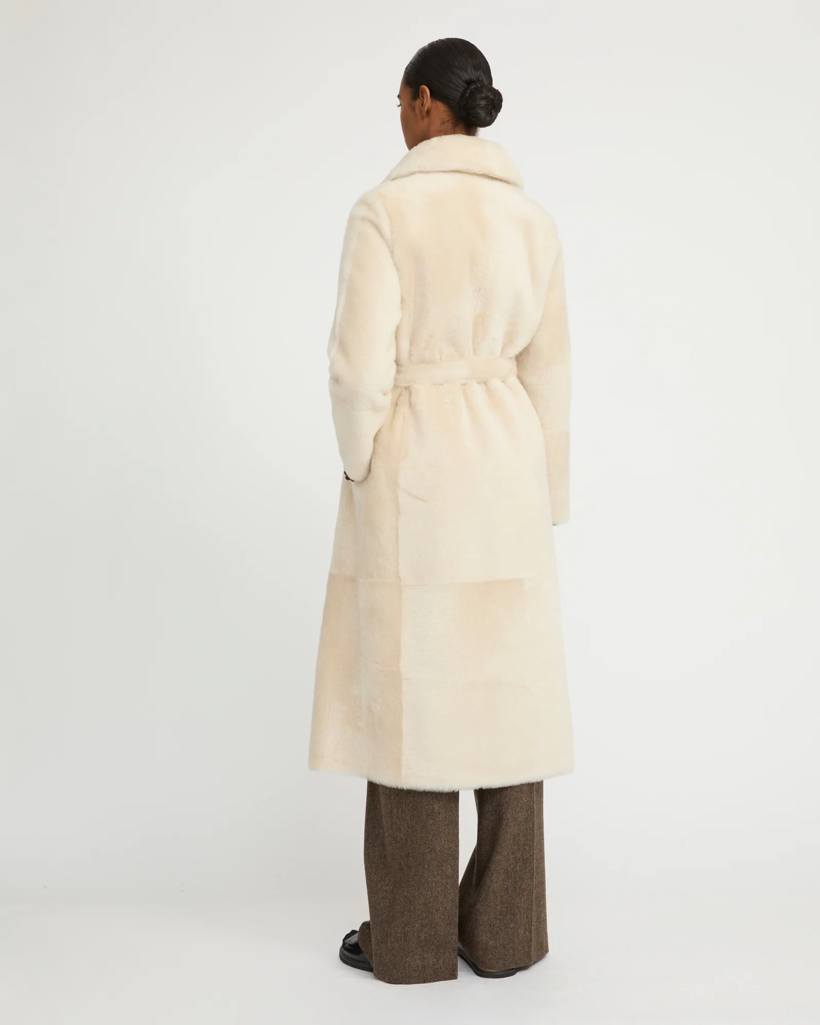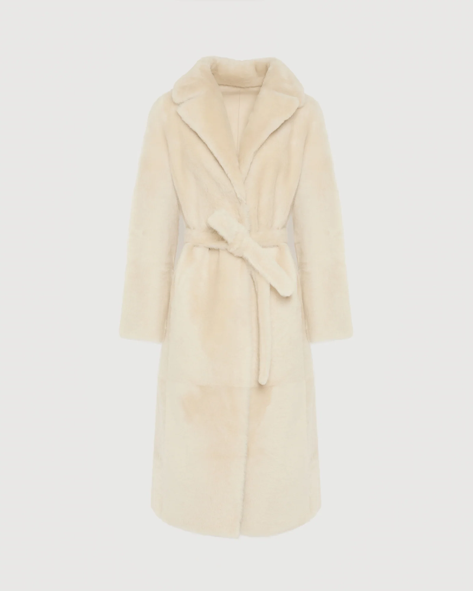 Long reversible coat featuring a masculine-feminine look. Crafted from unlined shearling, the leather on the other side is smooth and fine. Warm and enveloping, it remains supple and easy to wear. Design details include a tailored collar, a straight cut and two slit pockets for a pared back silhouette. The press-stud fastening adds a functional aspect, while the waistband allows the shape to be fitted for a contemporary and feminine touch.