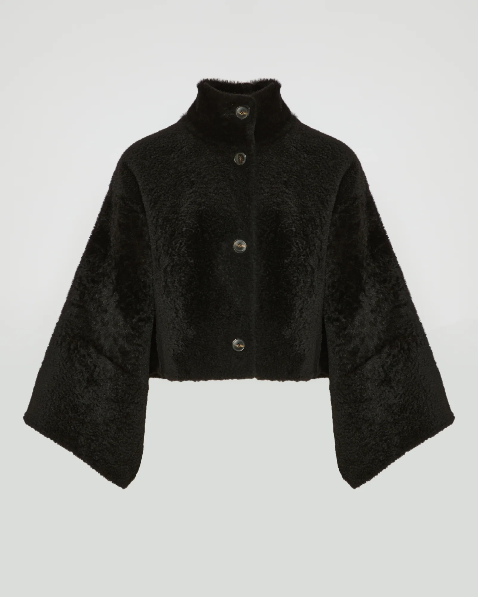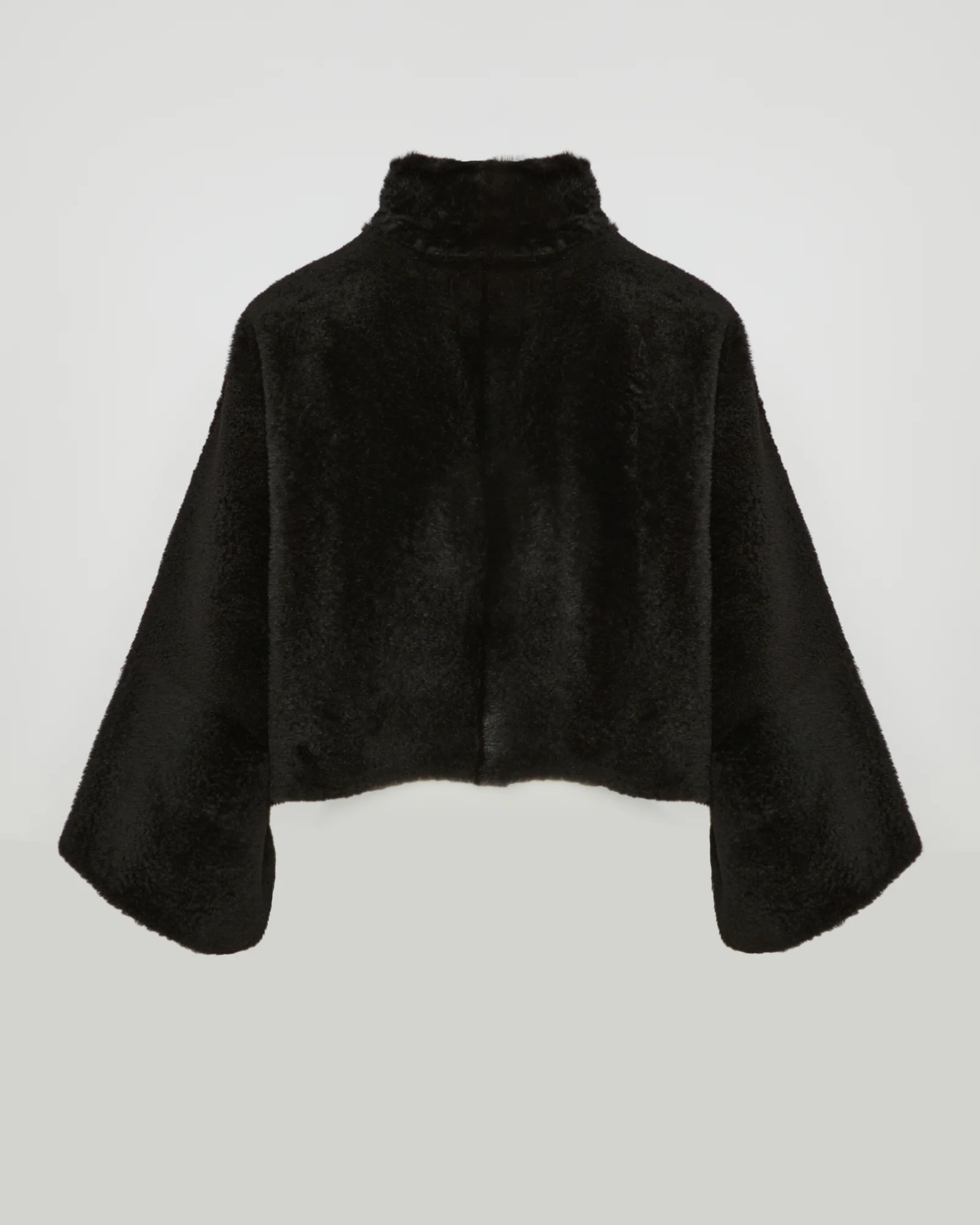 Loose astrakan-style lambskin jacket – Loose cropped jacket– Length: 45cm– Stand collar– Button fastening– Unlined.