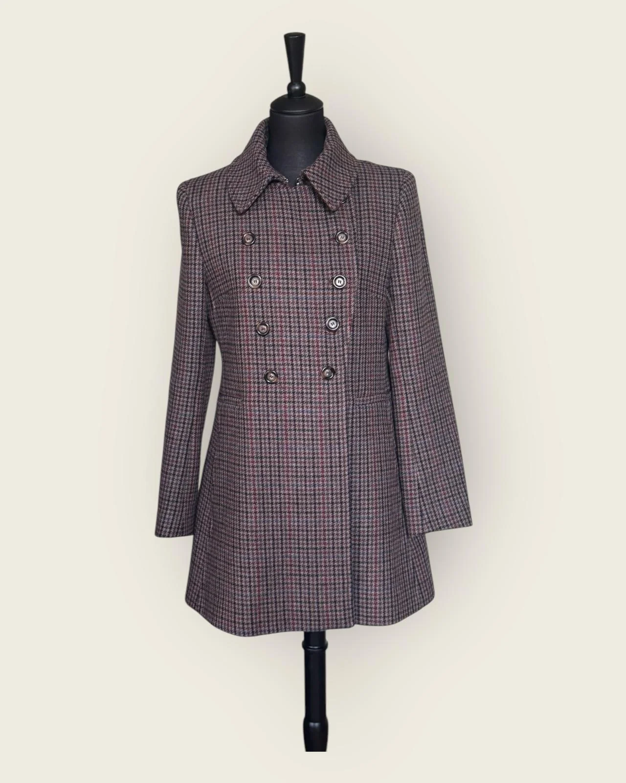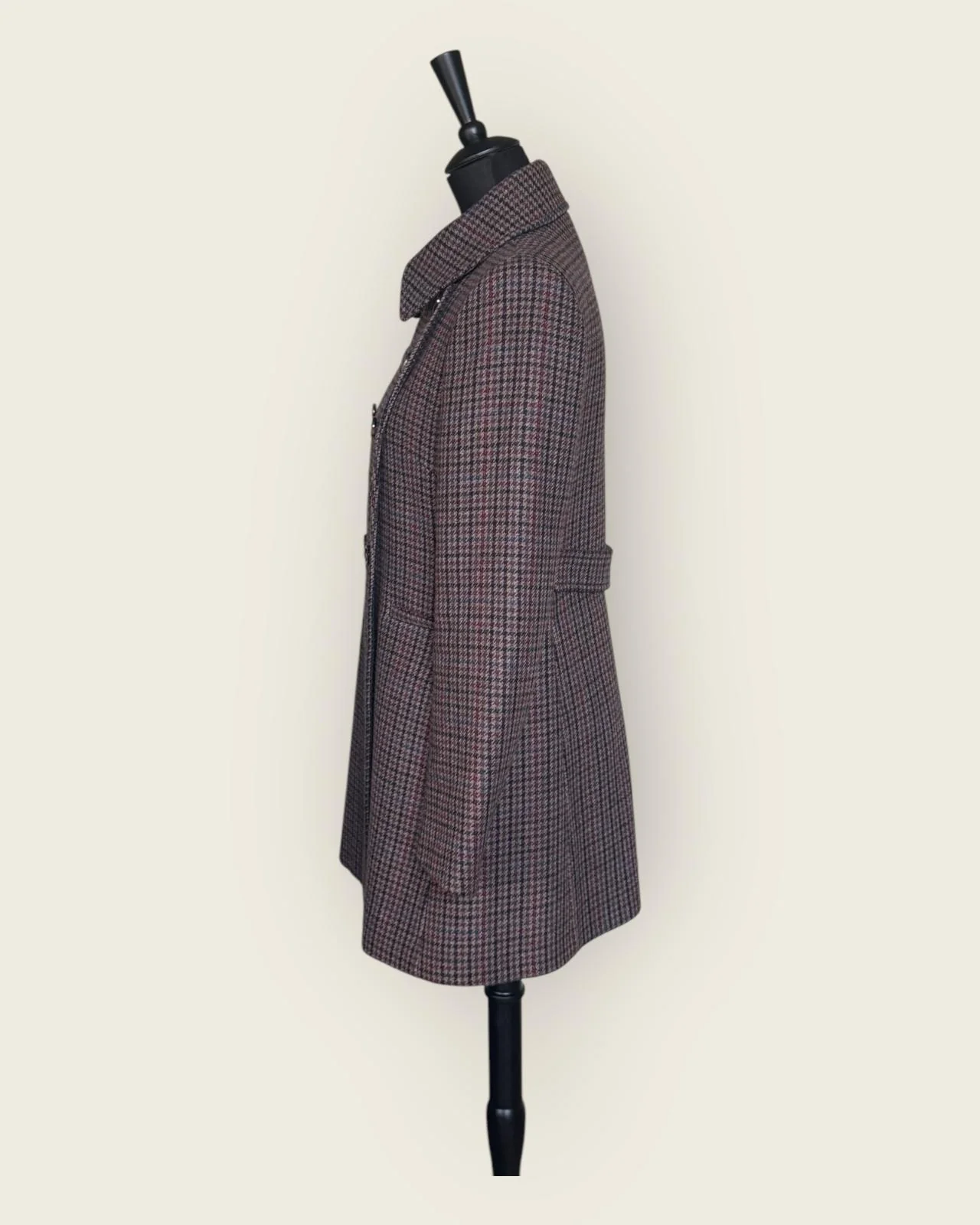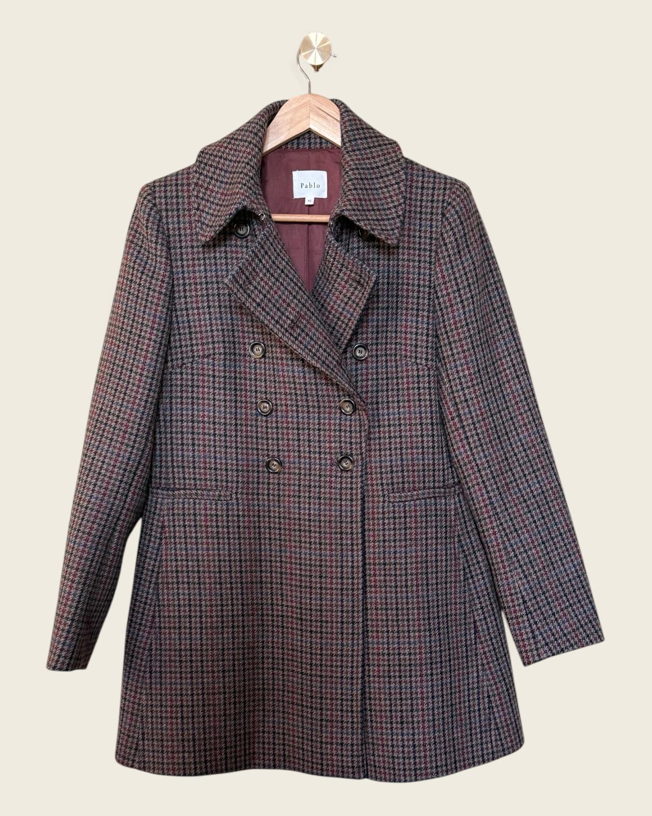Manteau mi-long PABLO, en seconde main. Cette pièce est confectionnée de 68% laine et arbore un tweed motif pied de poule intemporel. Doublé, il se ferme par un boutonnage croisé.