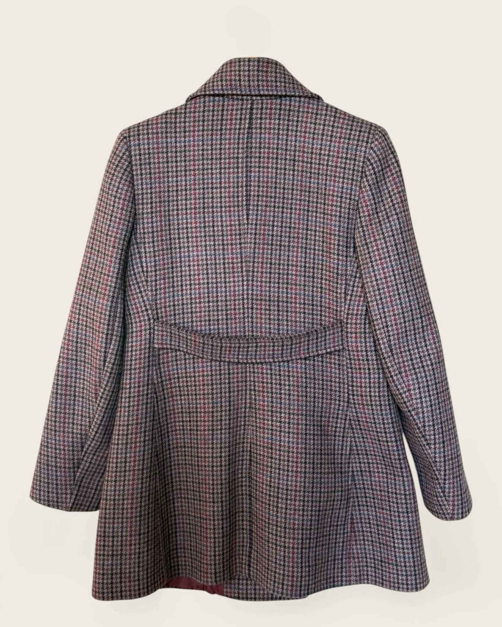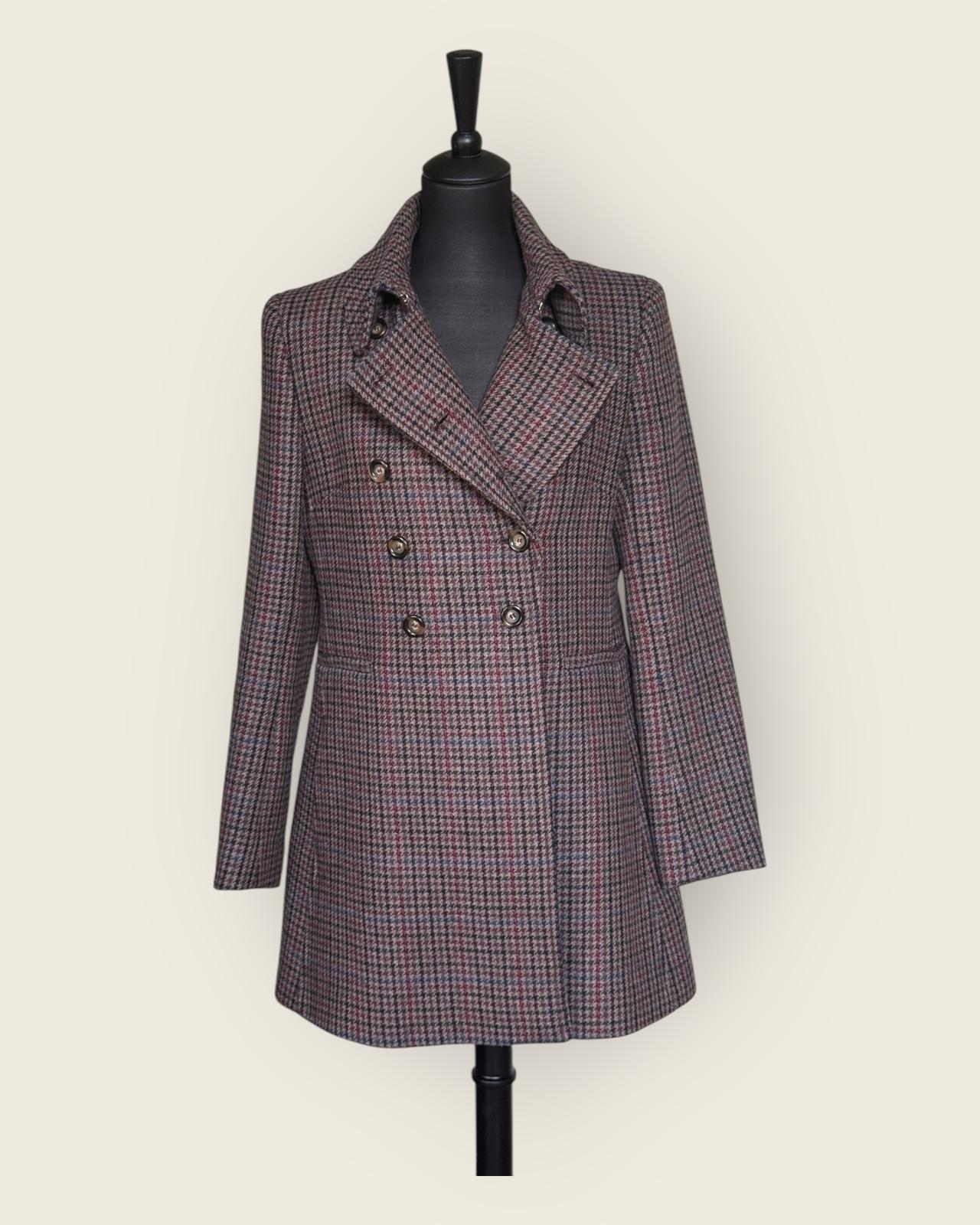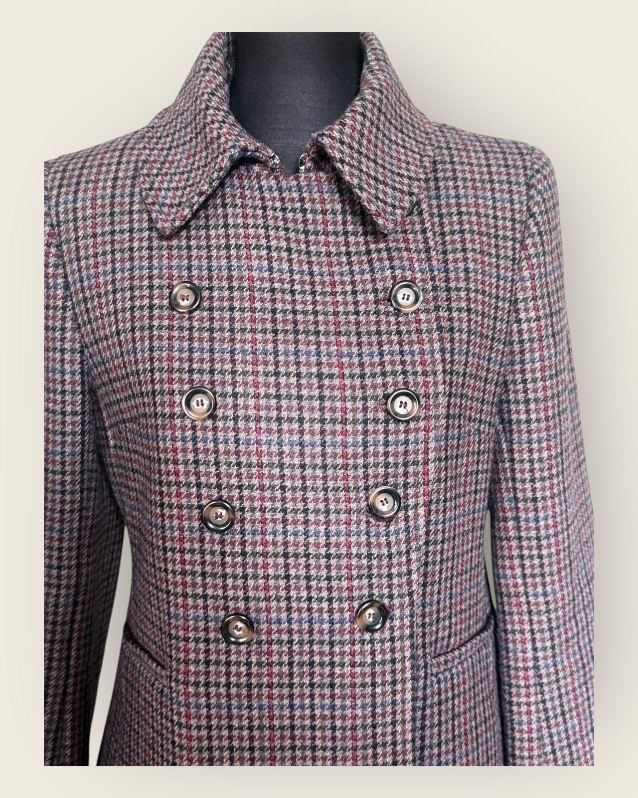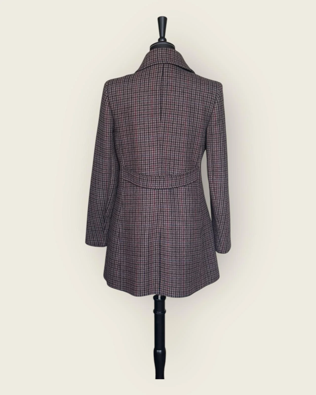 Manteau mi-long PABLO, en seconde main. Cette pièce est confectionnée de 68% laine et arbore un tweed motif pied de poule intemporel. Doublé, il se ferme par un boutonnage croisé.