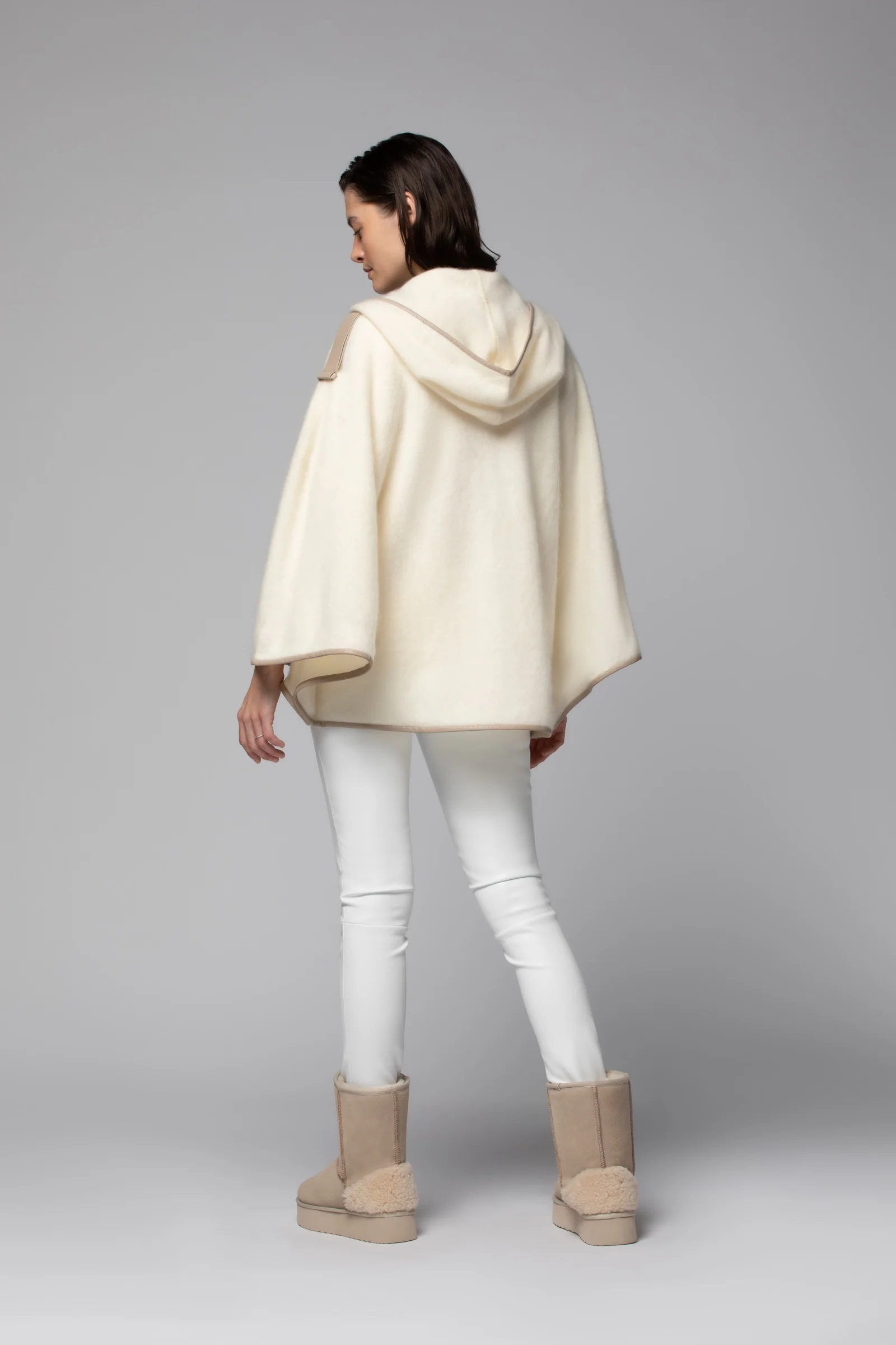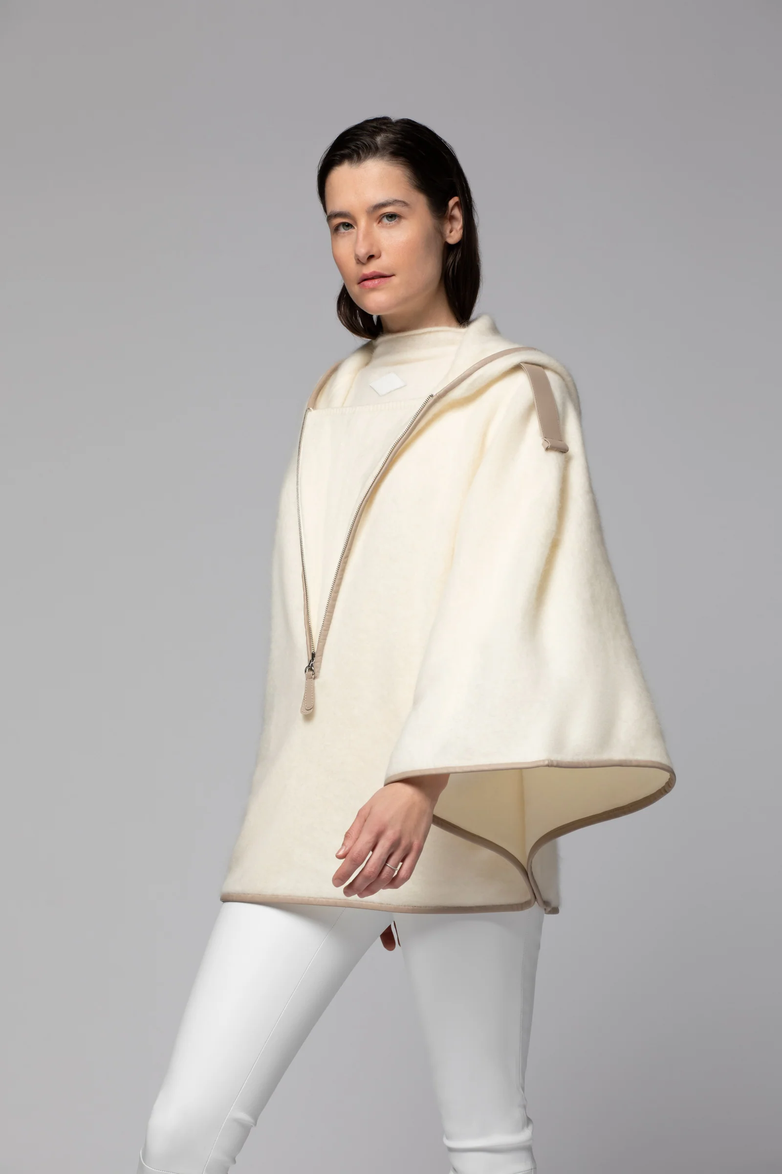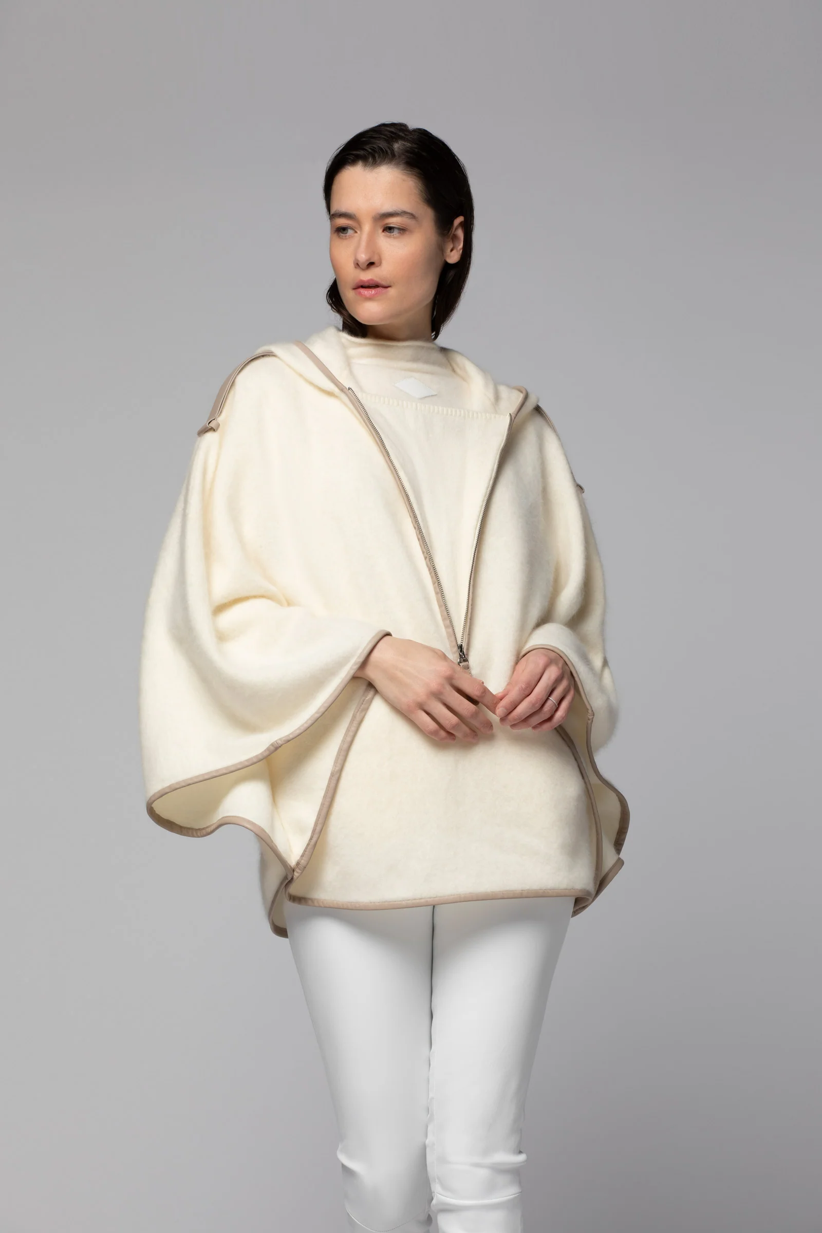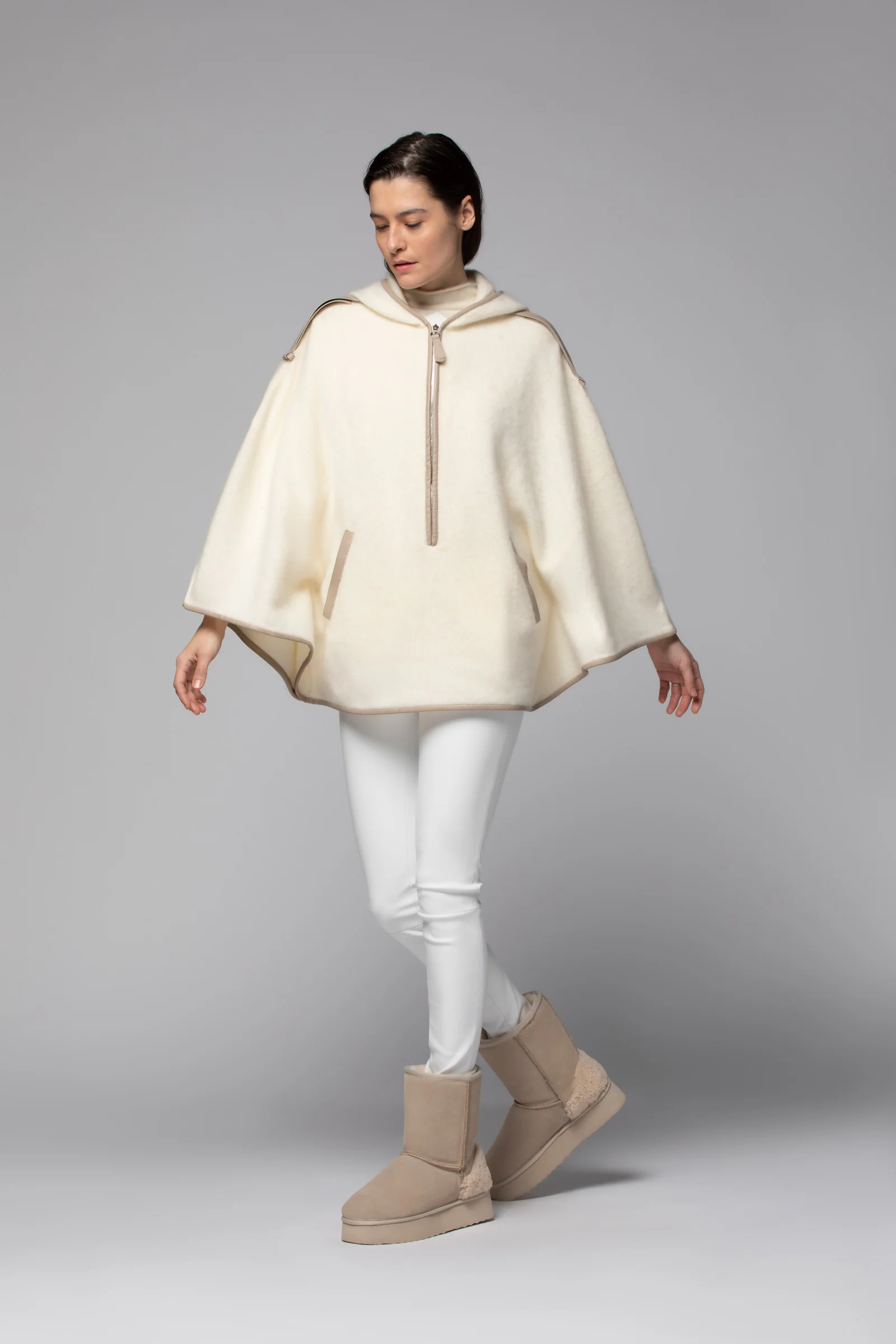 Confectionné dans un somptueux mélange de laine et cachemire, notre poncho VANDA séduit par sa maille brossée ultra duveteuse, qui enveloppe le corps avec douceur. Sa coupe ample et ses larges emmanchures offrent une liberté de mouvement optimale, pour un confort absolu au quotidien. Avec ses détails en cuir d’agneau, qui structurent ses lignes et embellissent ses pattes d’épaules, ce poncho cape dévoile une allure moderne à l’esprit très couture. Il se distingue par une fermeture zippée sur le devant, qui laisse apparaître un col V profond et un empiècement intérieur assorti, dans un jeu de superposition affirmé. Idéal pour la saison, il est doté d’une capuche généreuse, parfaite pour vous protéger des journées venteuses.