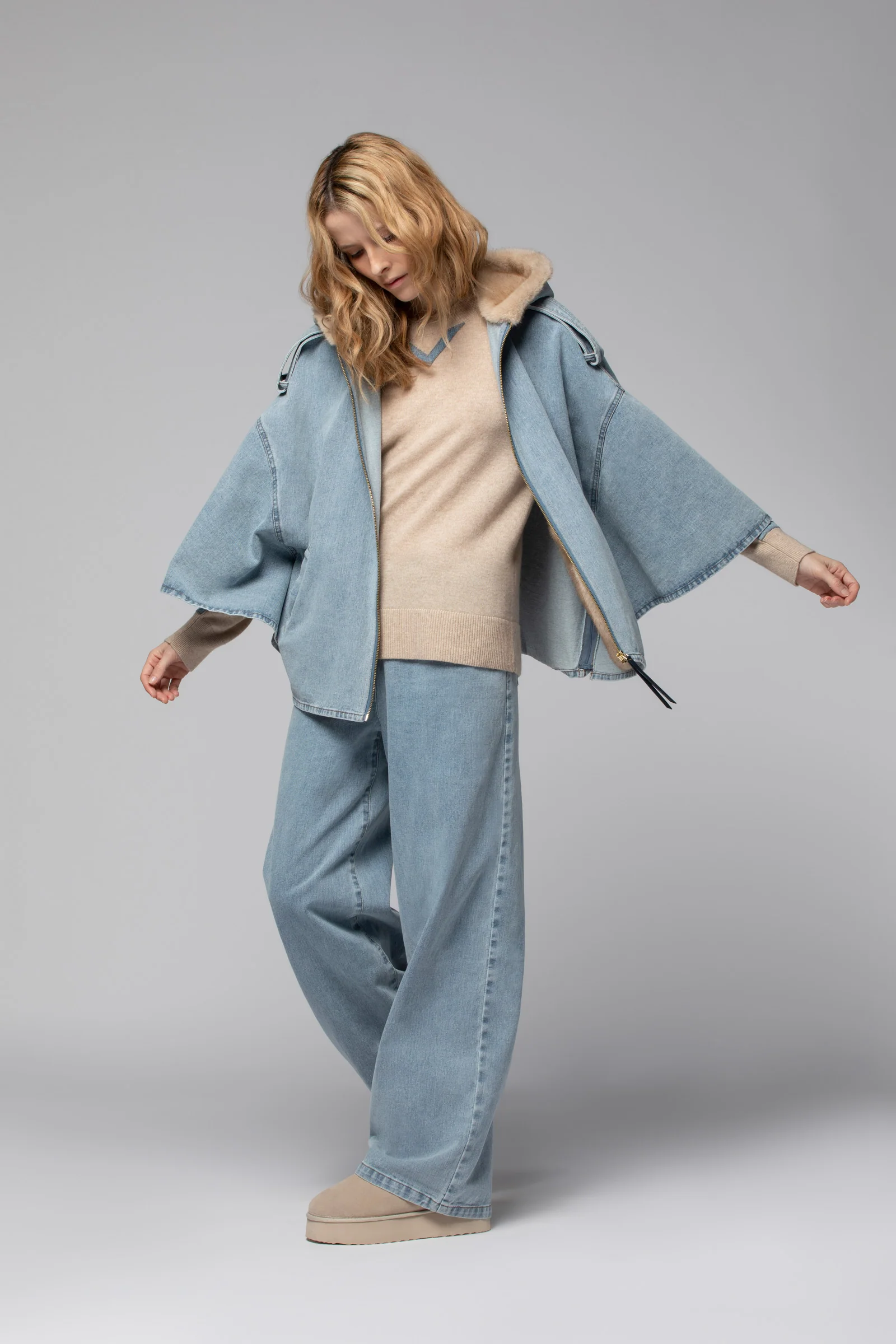 Citadin, ce poncho en denim pour femme est tout simplement irrésistible porté avec notre pantalon en denim BICHA. Dans un esprit plus audacieux, on l’associe à notre iconique legging en cuir d’agneau.