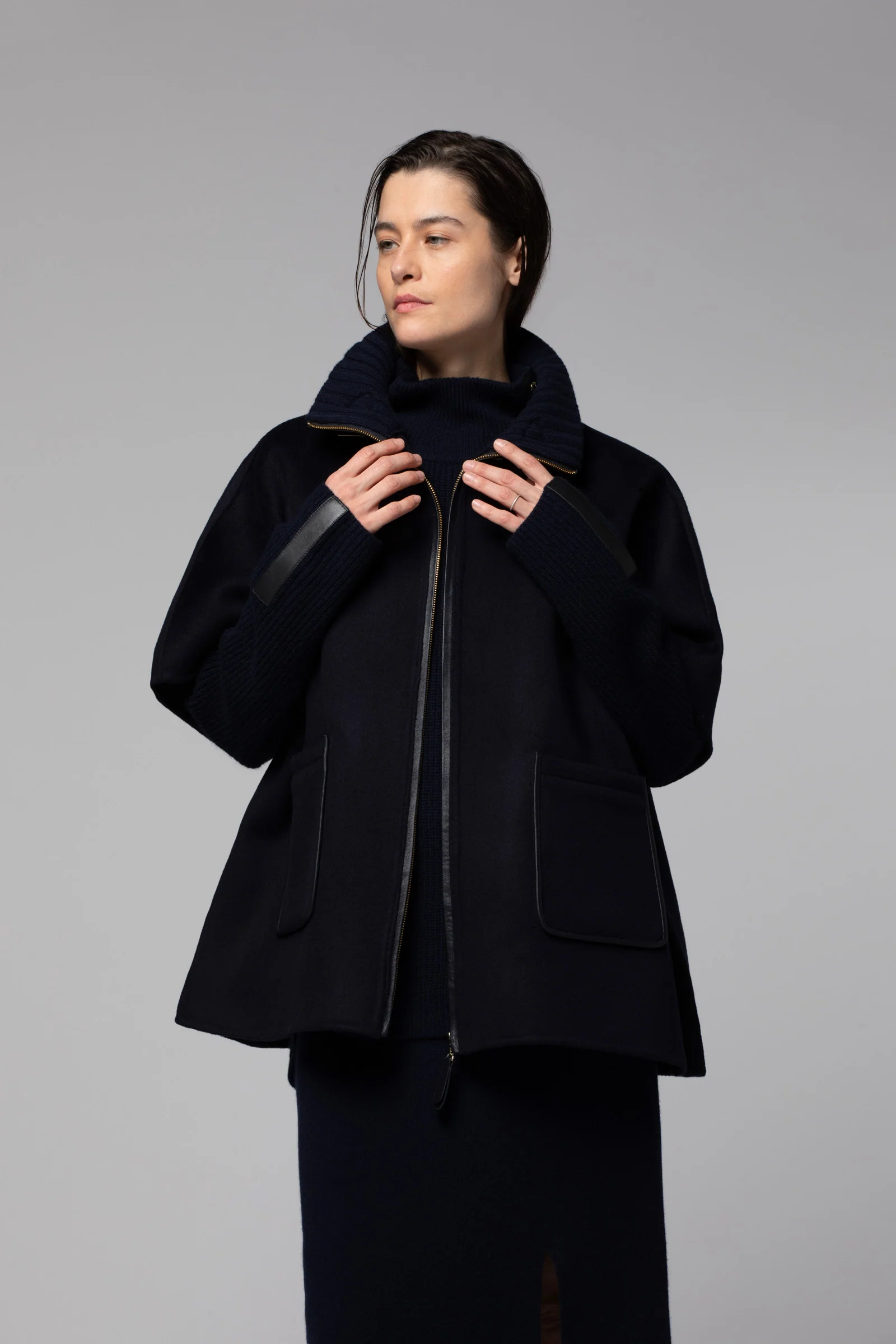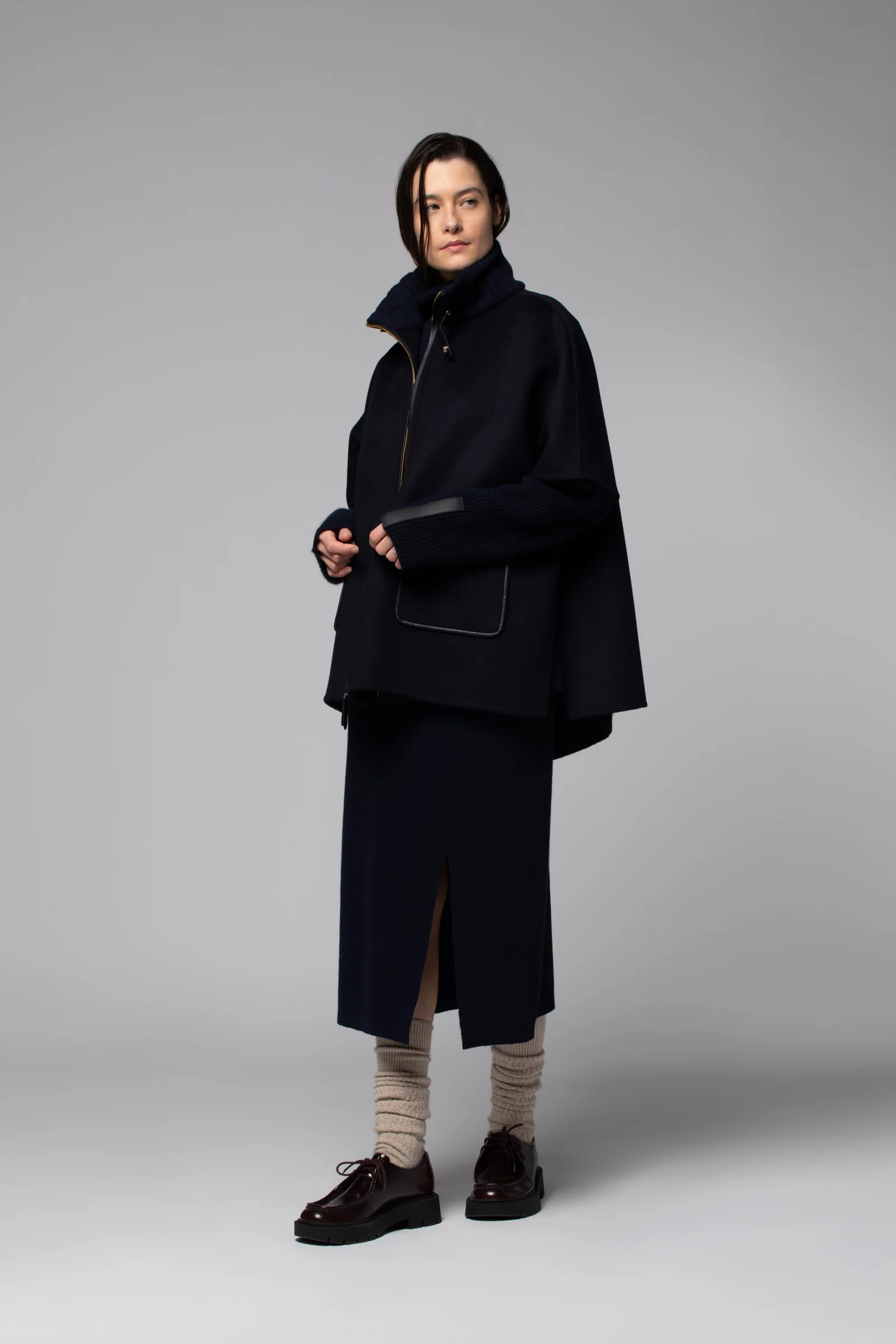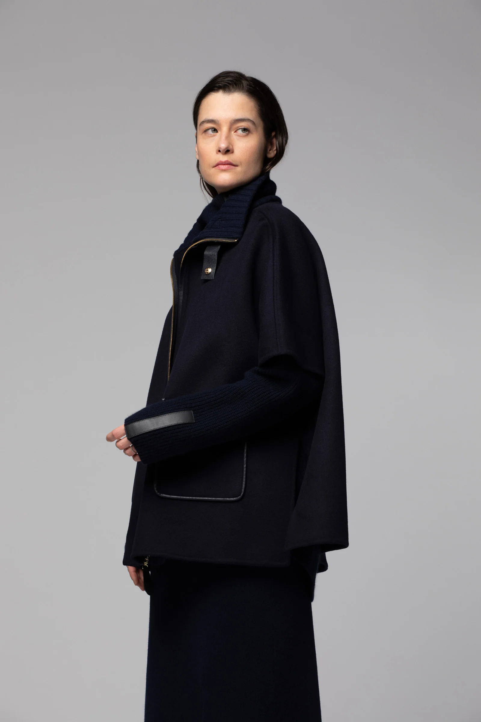Parfaite pour la mi-saison, notre veste en laine double-face VOLI enveloppe le corps avec douceur. Manches courtes, coupe ample et larges fentes latérales : cette veste façon poncho incarne une allure à l’élégance décontractée. Elle multiplie les détails sophistiqués avec son col montant en maille côtelée, rehaussée d’une élégante patte boutonnée, et ses poches plaquées bordées de cuir. L’allure se module au gré de vos envies grâce à une fermeture zippée discrète.