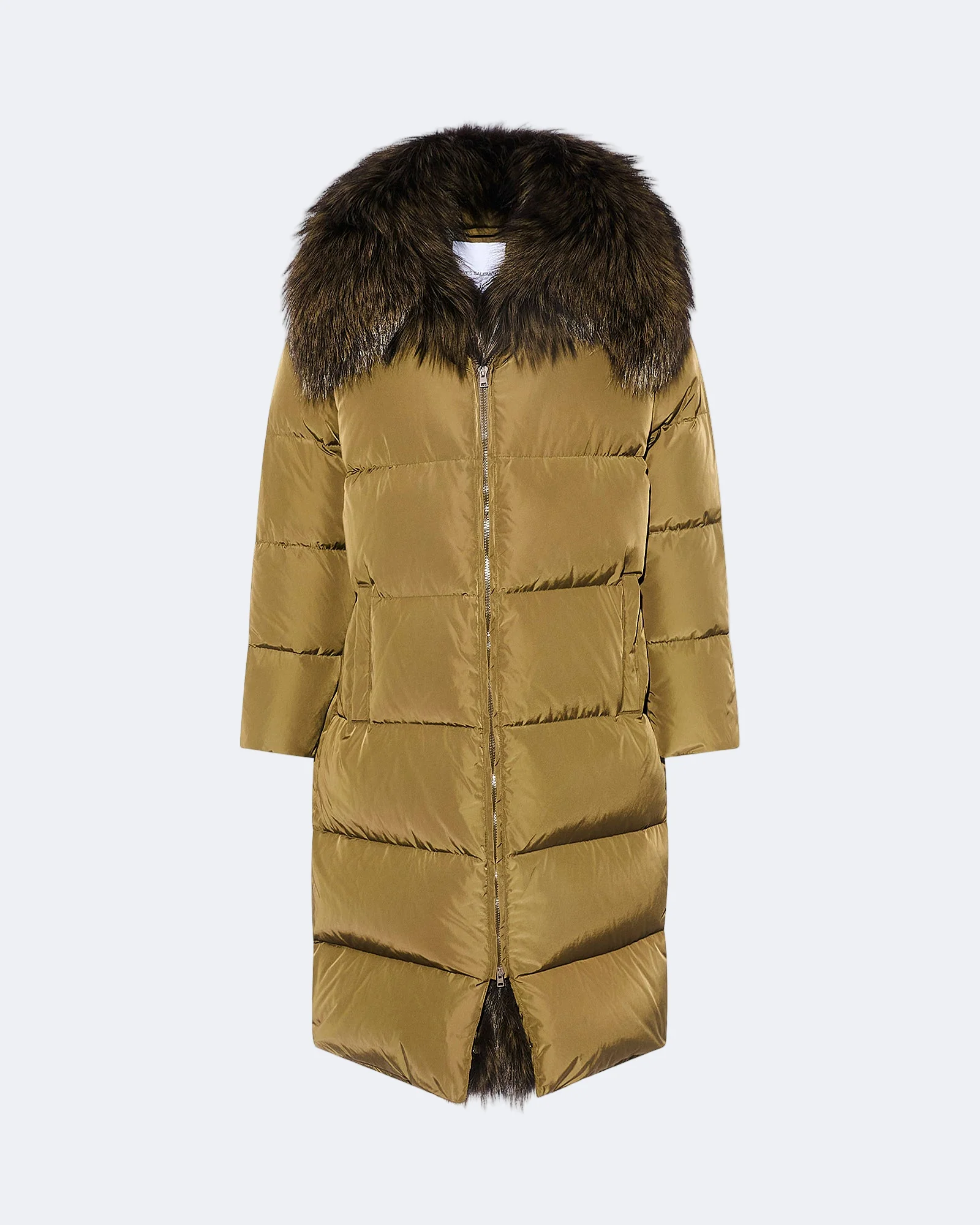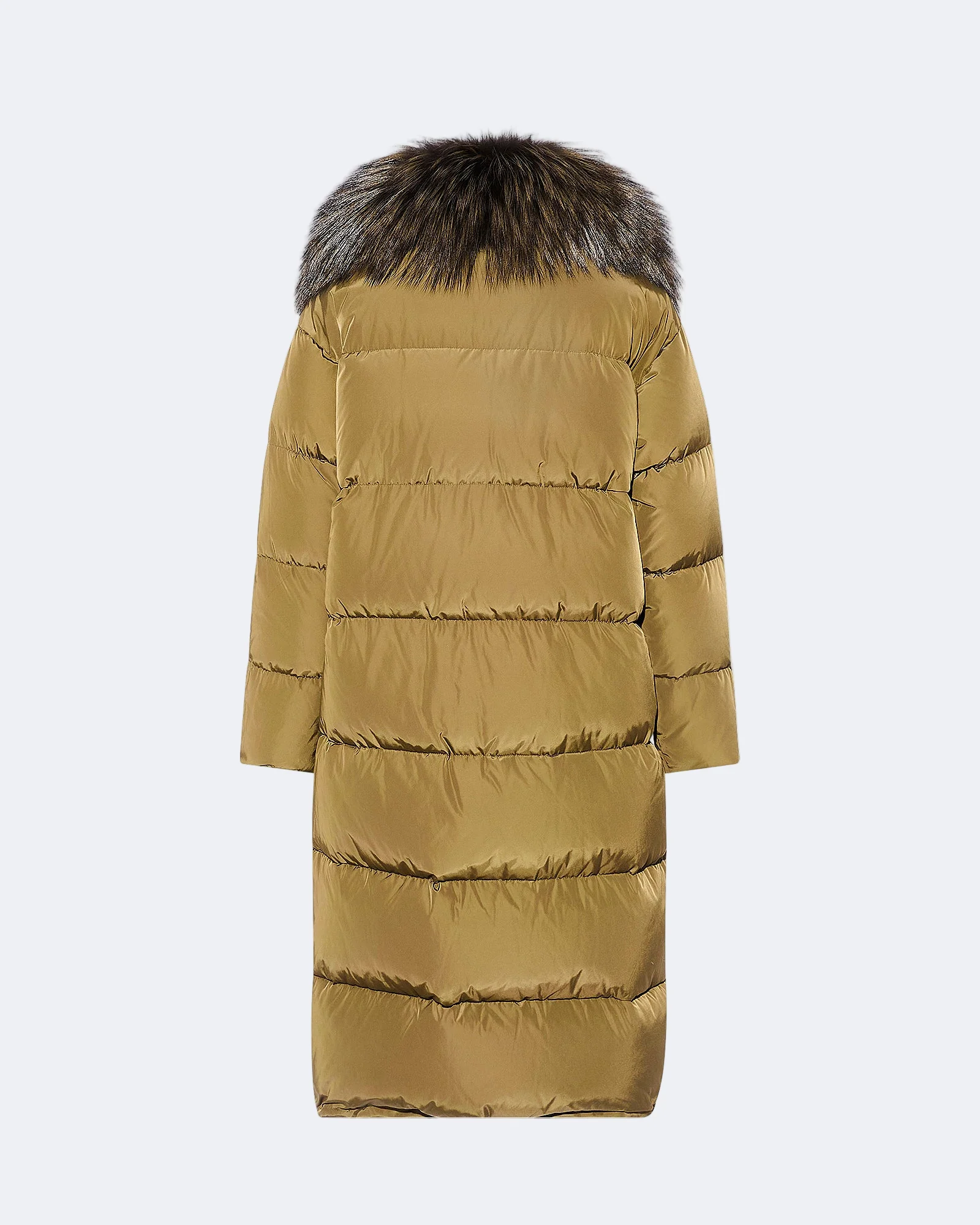 Maxi down jacket in matte technical fabric. – Long quilted down jacket– Length: 110 cm– Removable fox fur collar and facing– Welt pockets– Zip fastening– Lined.