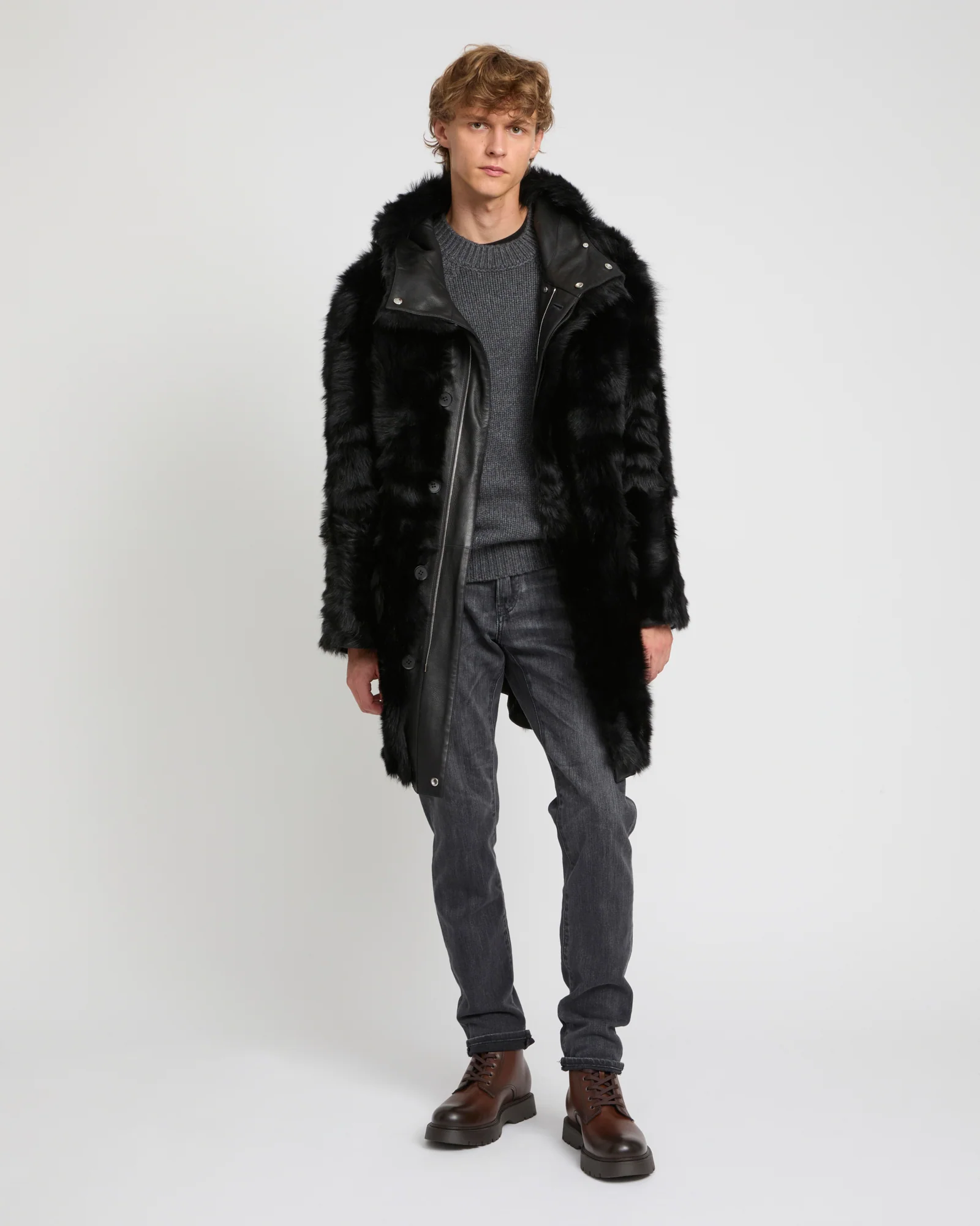 The unique texture of Toscana lambskin with an Appenzel folk effect and semi-bouclé feel provides a striking visual effect for this parka-style 3/4 length coat. A hood and flap pockets further highlight the shiny outer face.