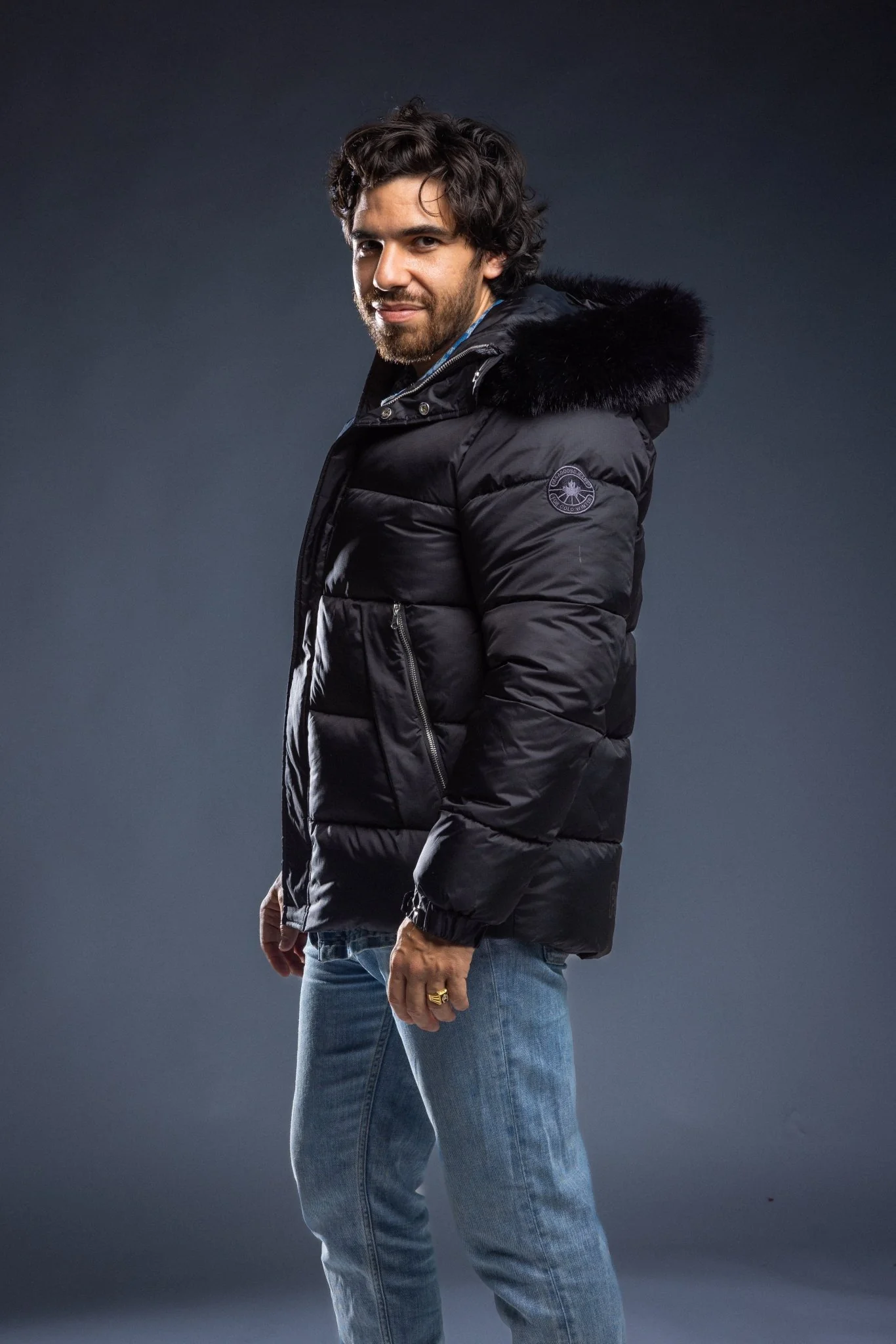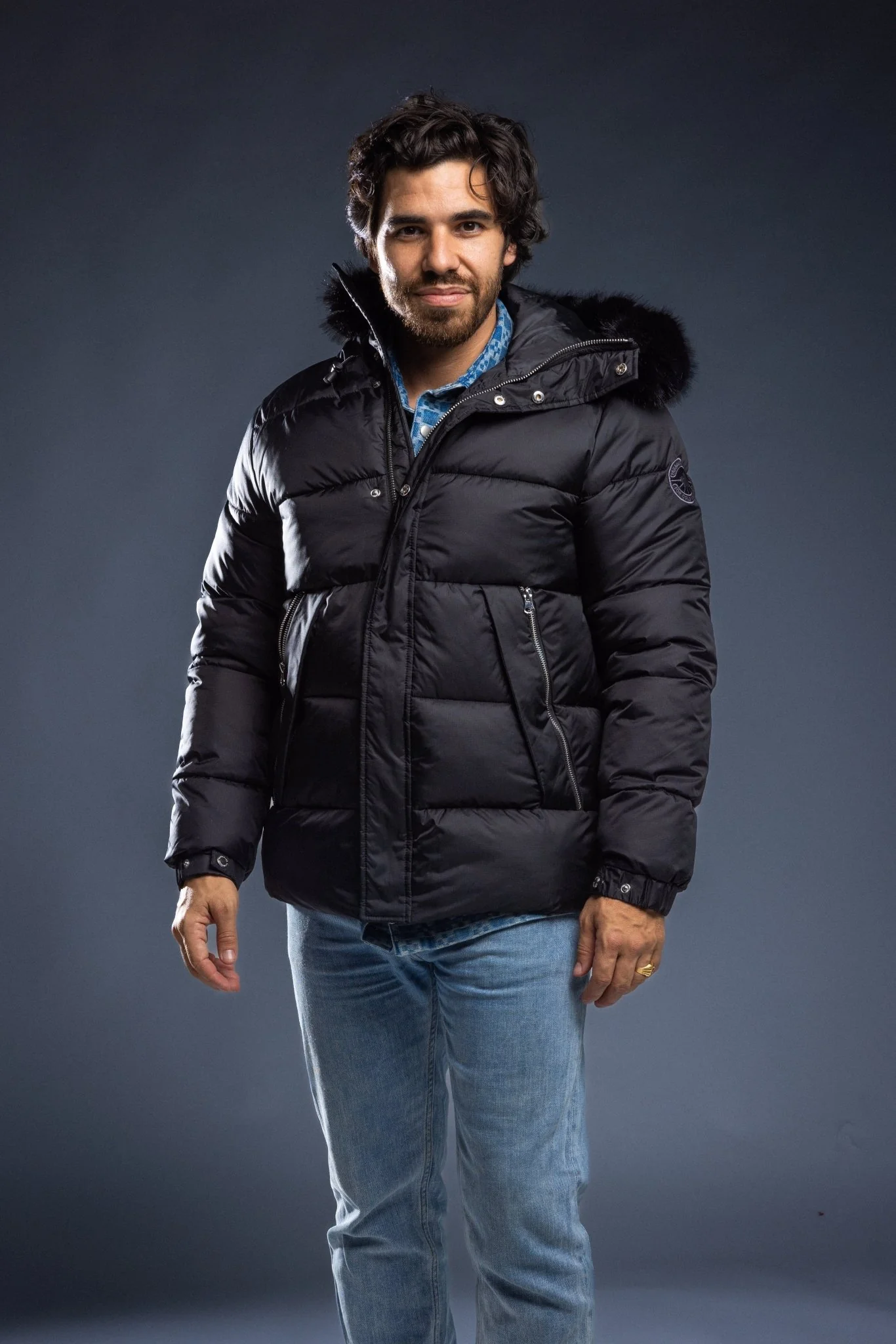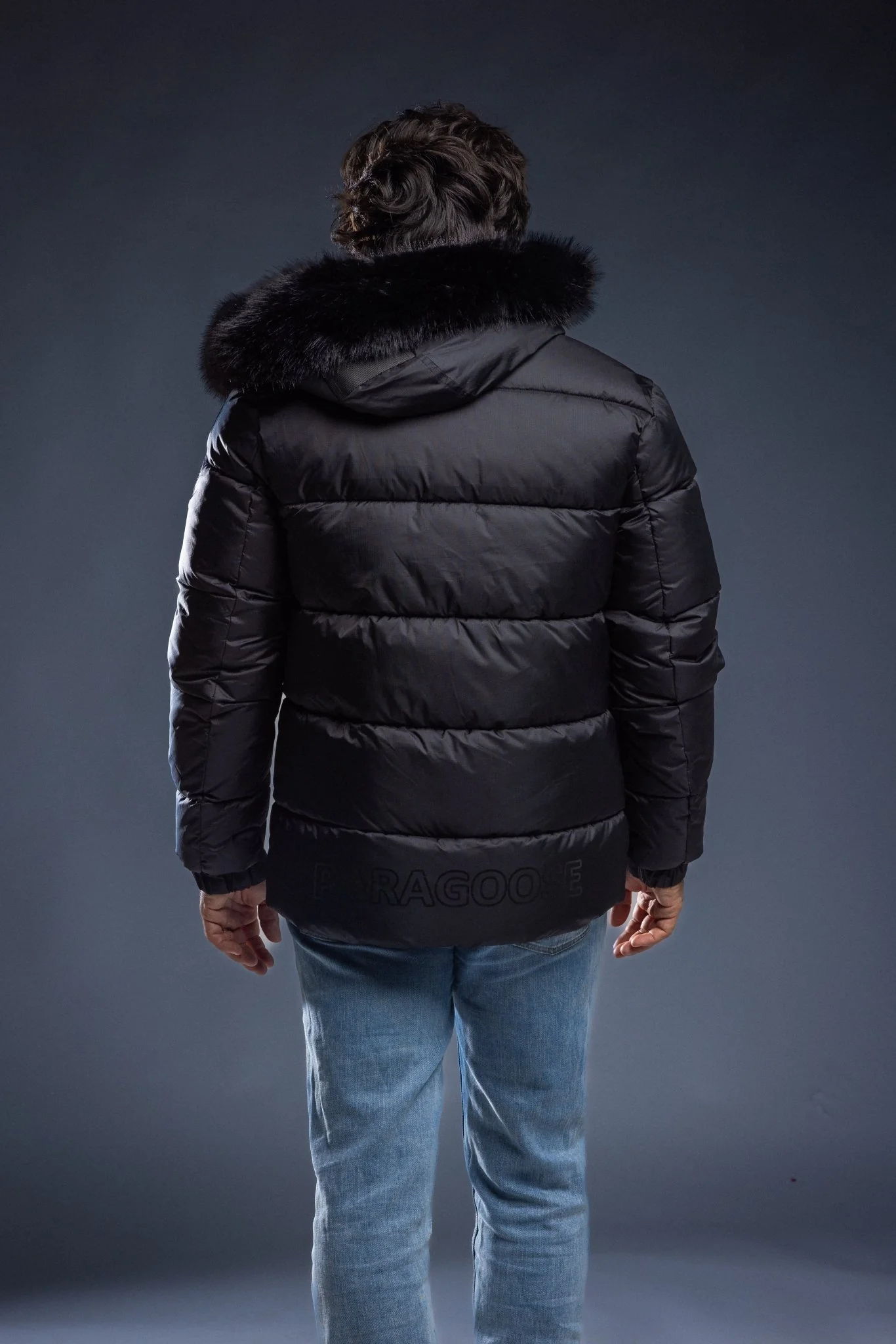 “A” line down jacket with fox fur hood trim