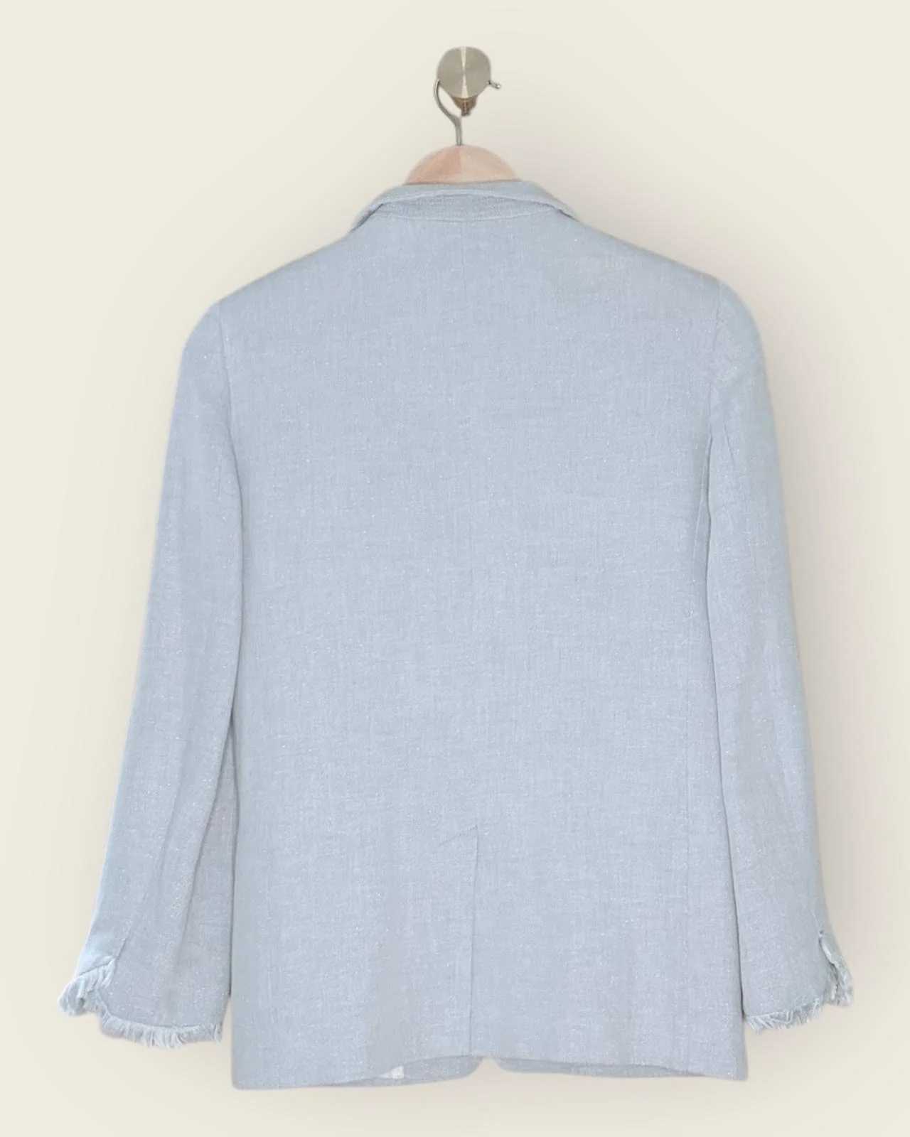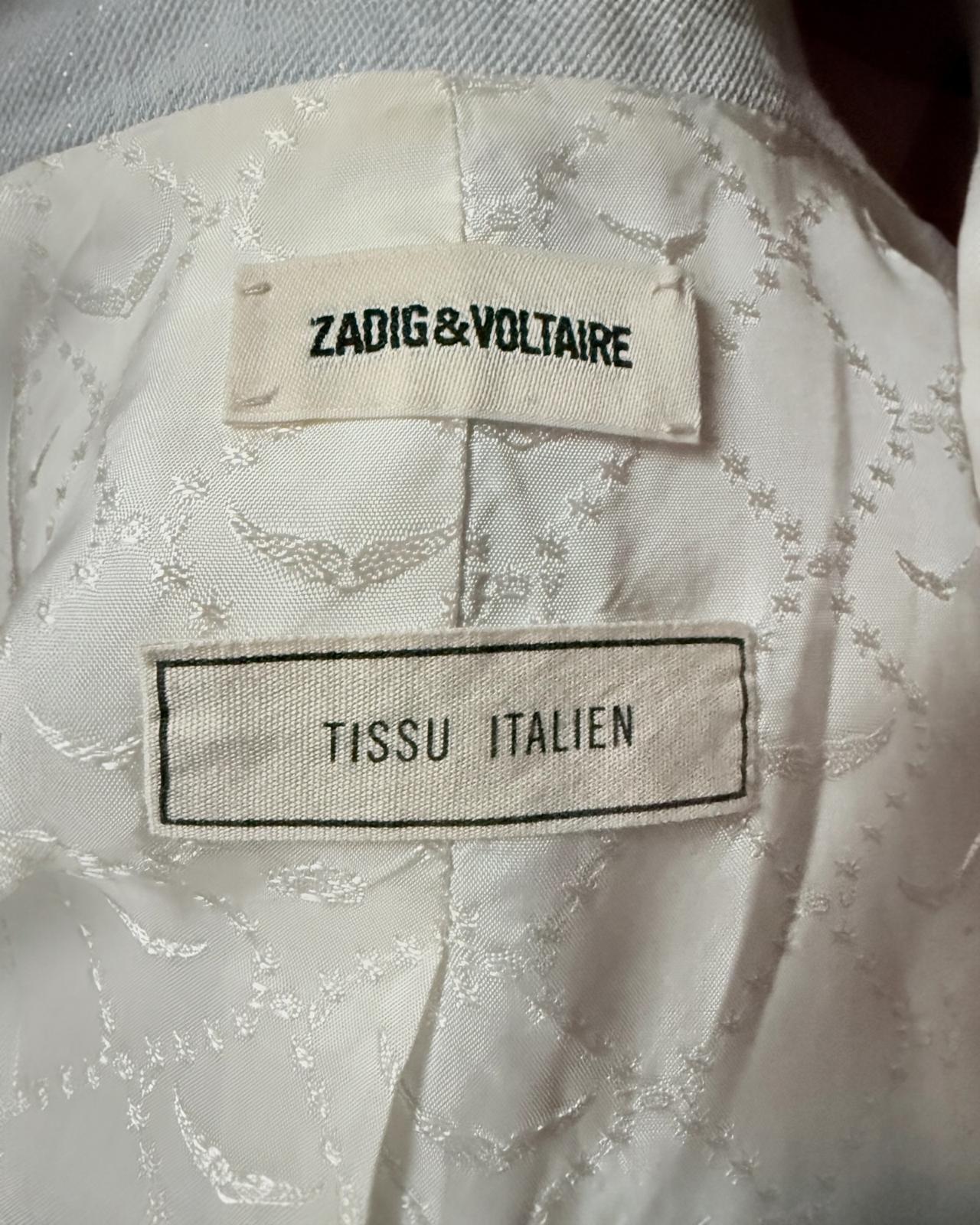 Veste ZADIG & VOLTAIRE, modèle Volly Frange, en seconde main. Confectionnée en coton et lin, Volly contient 2% de fils métallisés qui illuminent sa teinte bleu clair. Ses manches finies par des bords frangés offrent une note rock n’ roll à l’ensemble. 4 pins sur la poitrine signent cette pièce résolument chic & cool à la fois.