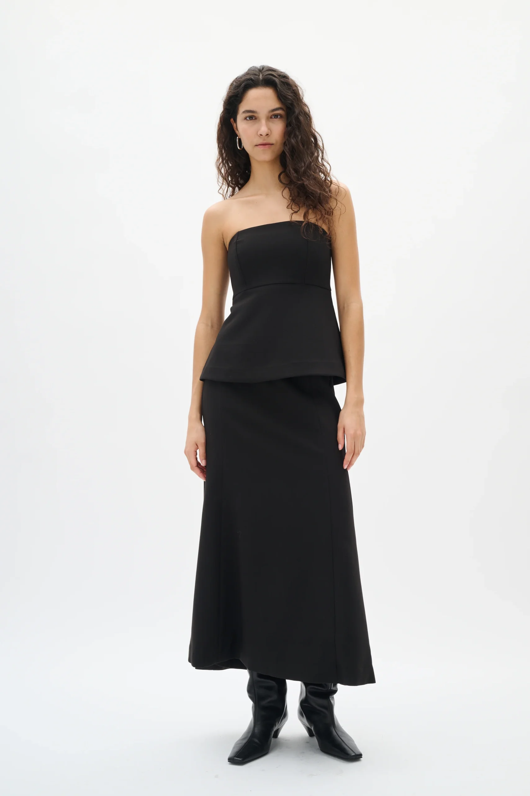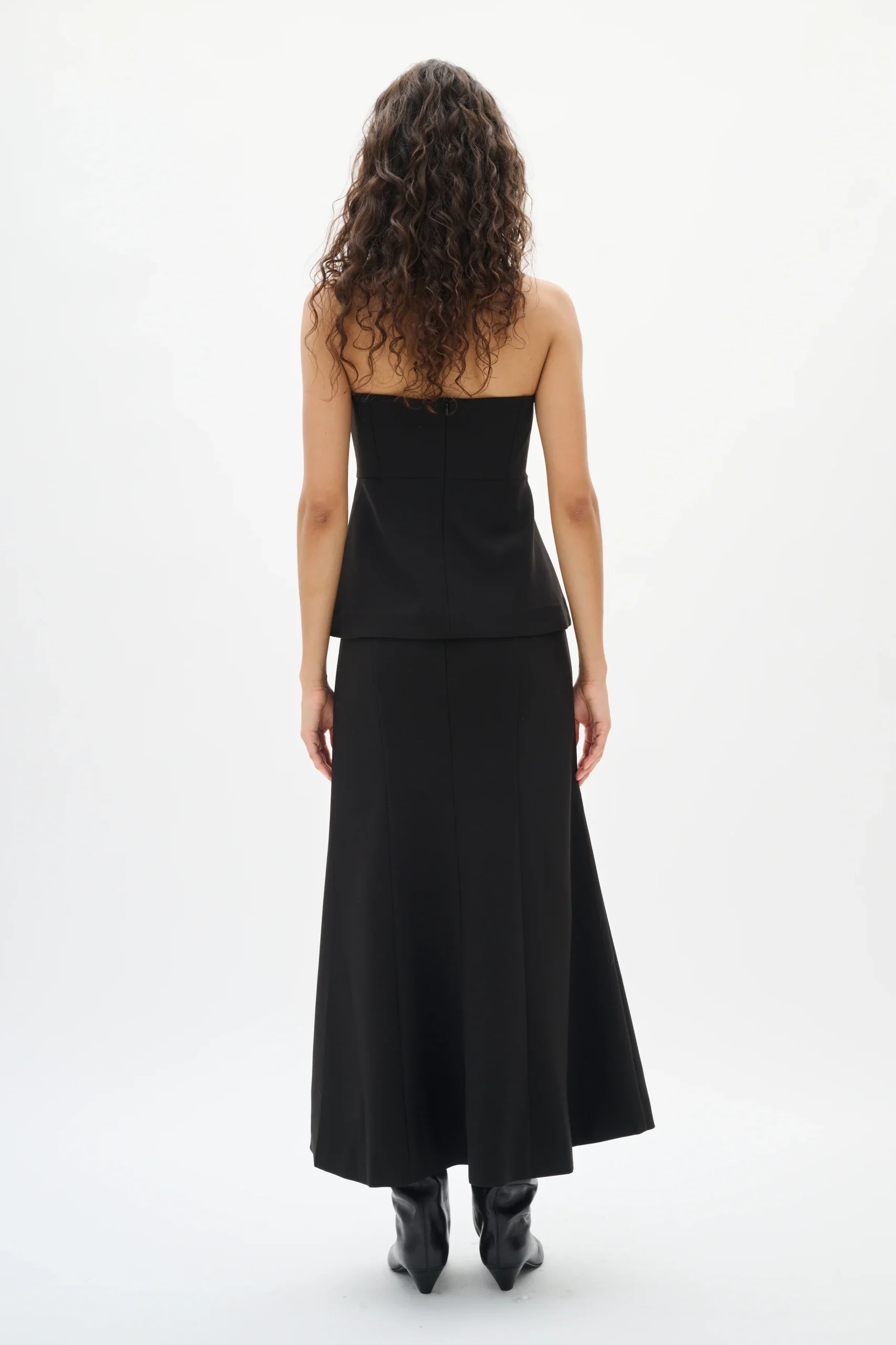 Le haut sans bretelles présente un corsage structuré avec une subtile silhouette péplum évasée. Sa finition lisse et épurée met en valeur des lignes nettes et un style moderne, apportant une touche de confiance à n’importe quel look.