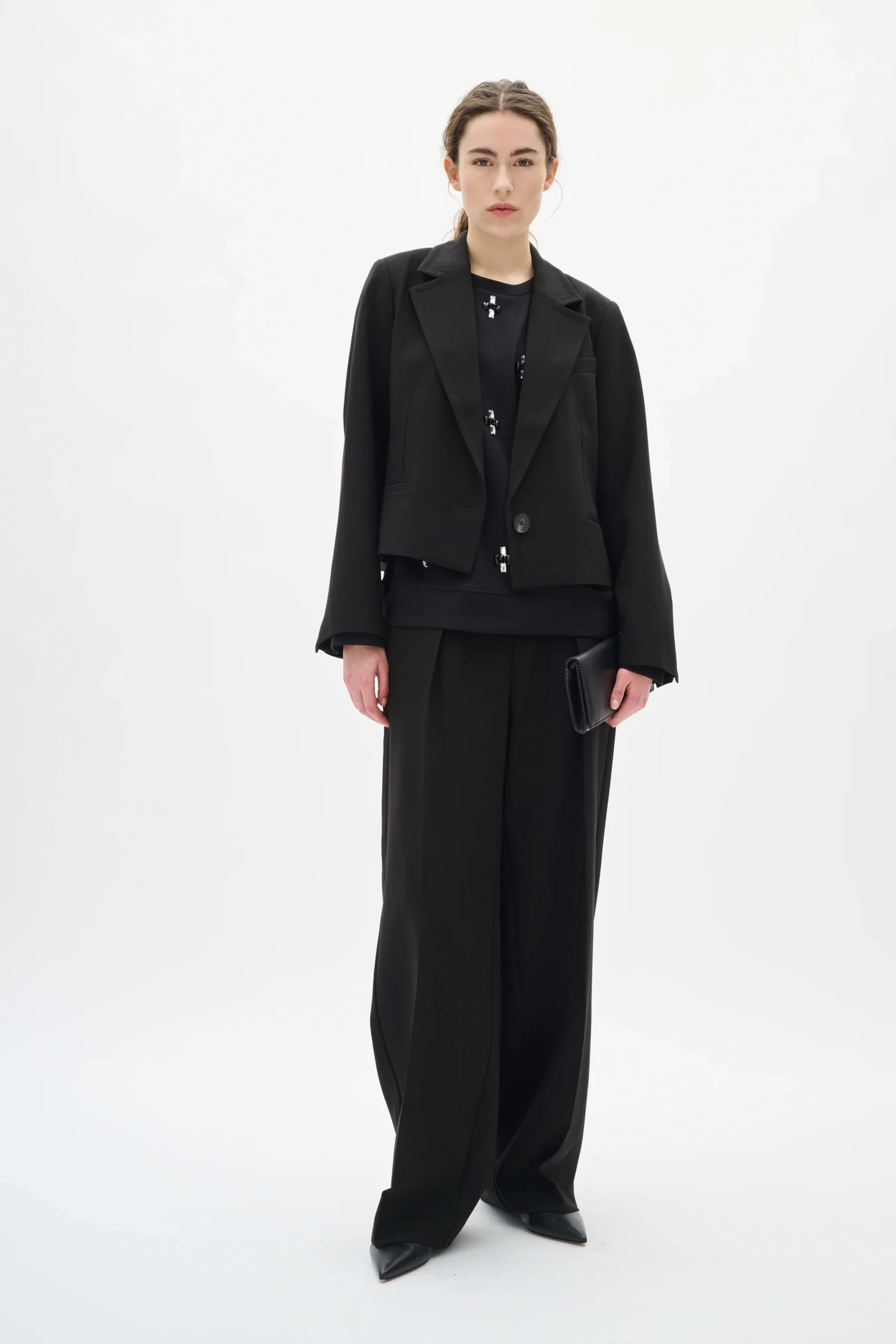 Ce veston noir court à coupe carrée allie élégance et style contemporain. Parfait pour structurer vos tenues, il se porte aussi bien sur un jean pour un look casual que sur une jupe ou un pantalon pour un style plus habillé.